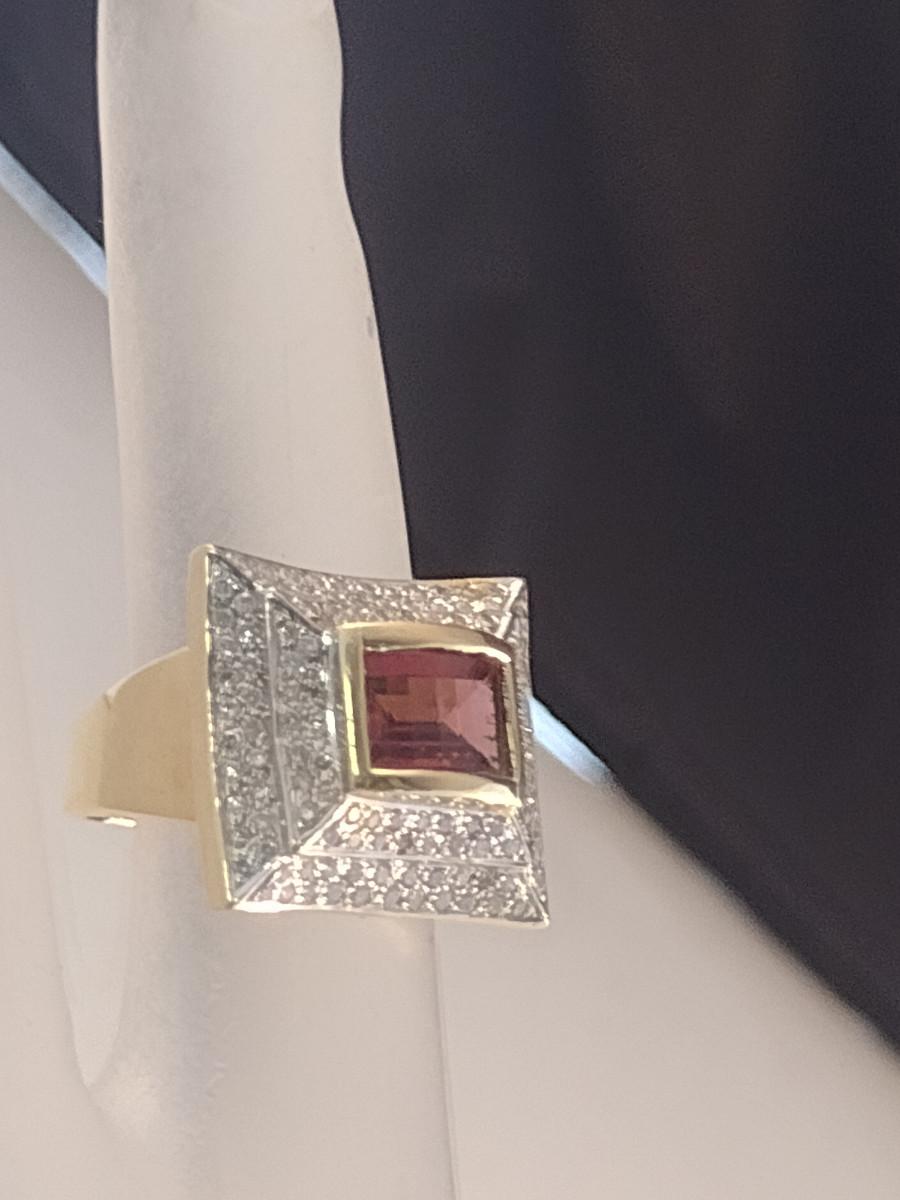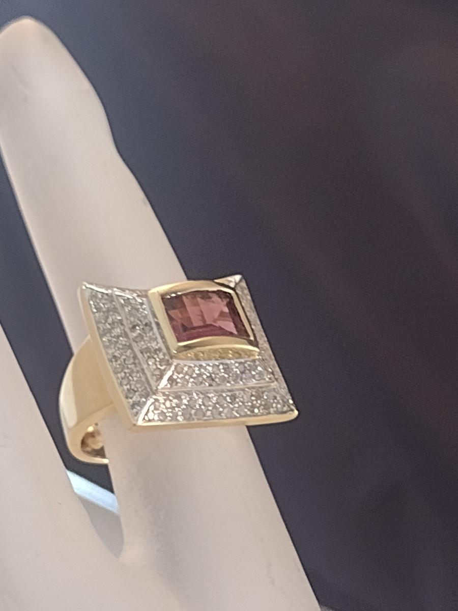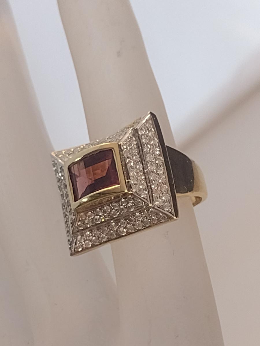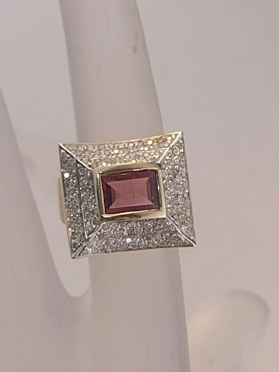 14 Karat Yellow Gold and Gemstone Ring- Size 3 1/4- Approx Weight 8.6 Grams (#12). Possible garnet gemstone. Item has sizing beads installed on band.