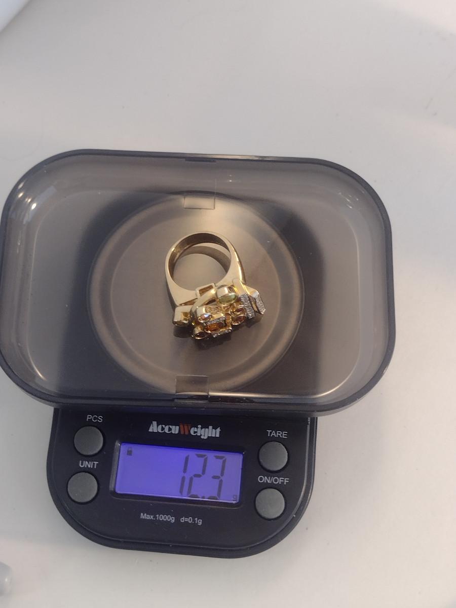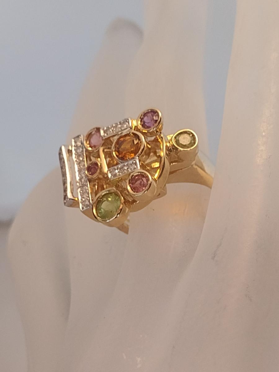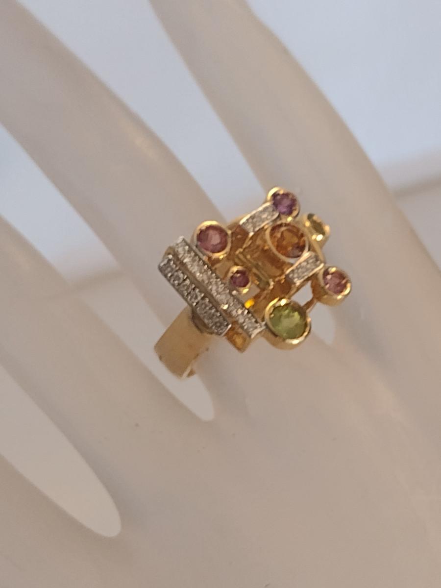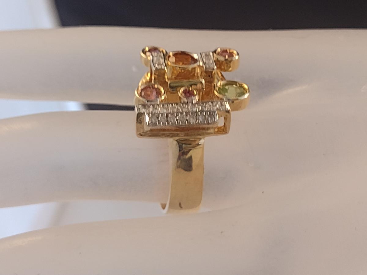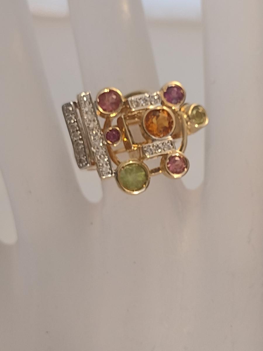 14 Karat Yellow Gold and Gemstone Ring- Size 6- Approx Weight 12.3 Grams (#21). Multiple gemstones- possibly citrine, amethyst, peridot. Small, clear accent stones test as diamonds.