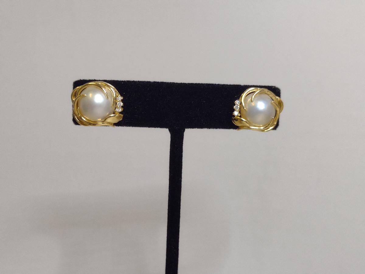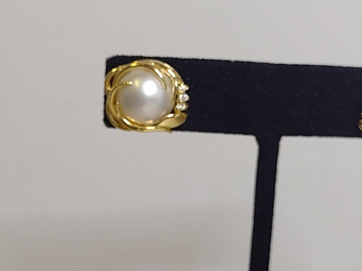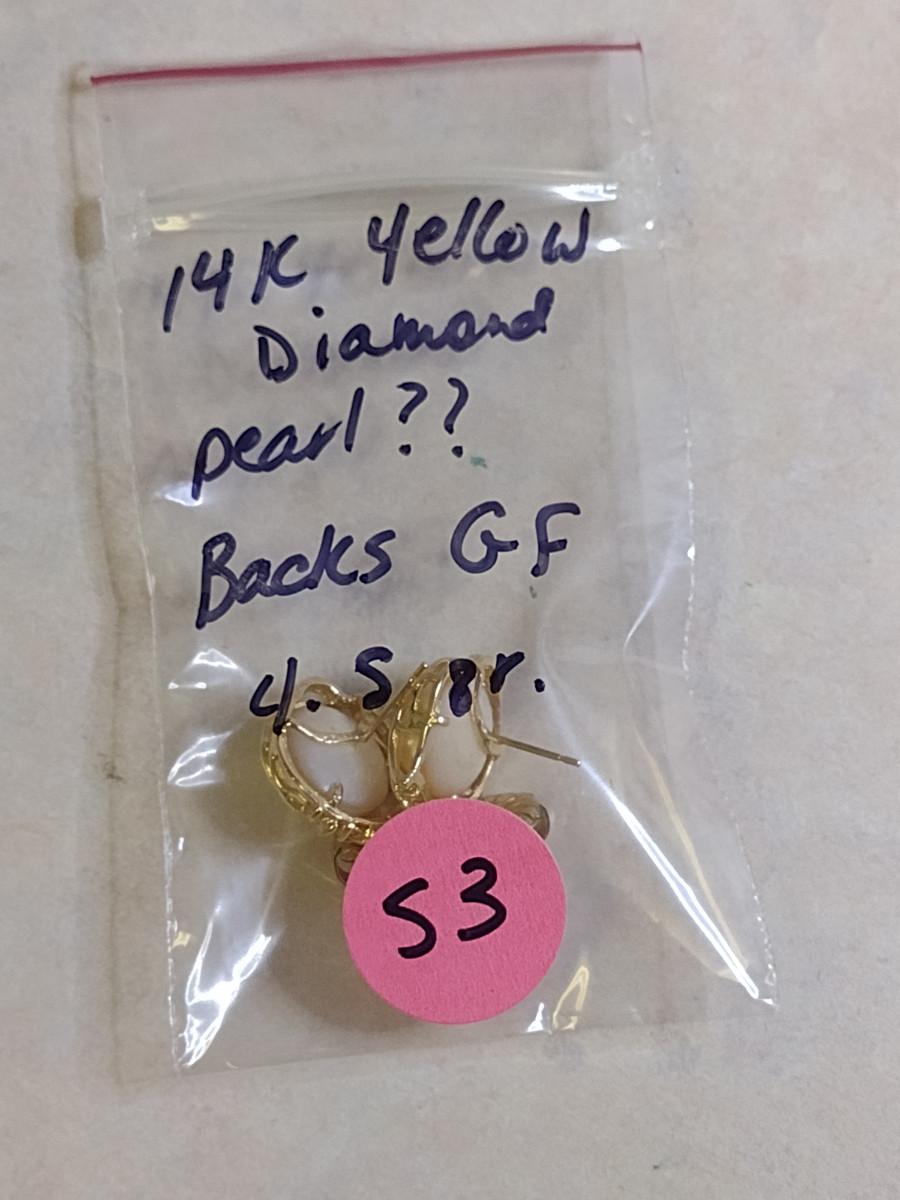 14 Karat Yellow Gold and Pearl Post Earrings with Diamond Accents- Approx Total Weight 4.5 Grams (#53). Test with Gemoro confirms diamonds. Pearls are untested. Backs are only gold filled and are not included in weight. A 6.75% NC sales tax will be added to the jewelry invoice amount at the end of the sale. Coins are exempt from state sales tax.