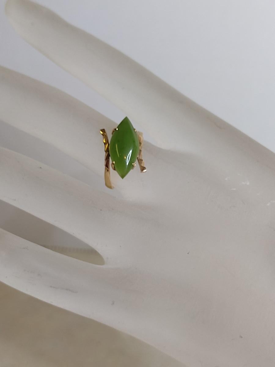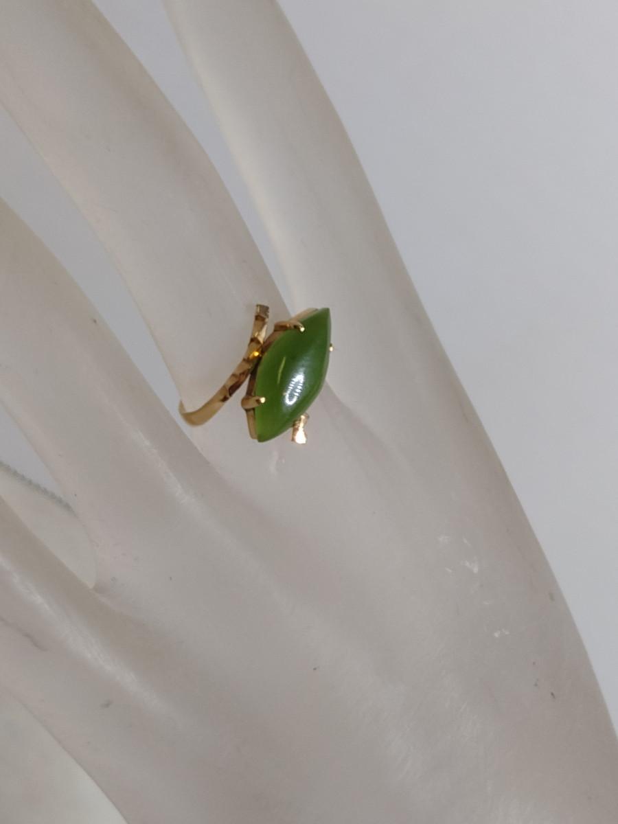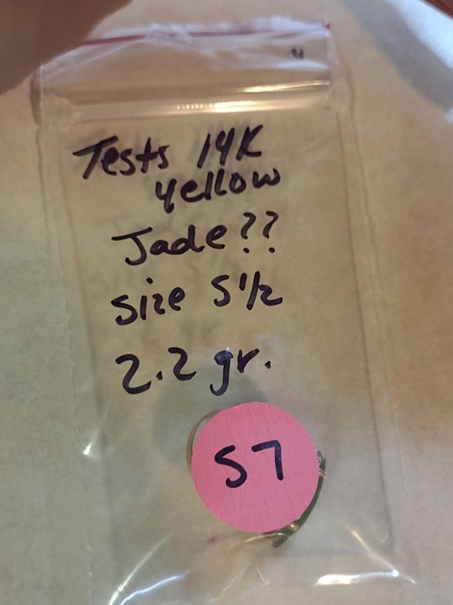 14 Karat Yellow Gold and Stone Ring- Approx Size 5 1/2 and Total Weight 2.2 Grams (#57). Item acid tests as 14 Karat. Stone is possibly jade. A 6.75% NC sales tax will be added to the jewelry invoice amount at the end of the sale. Coins are exempt from state sales tax.