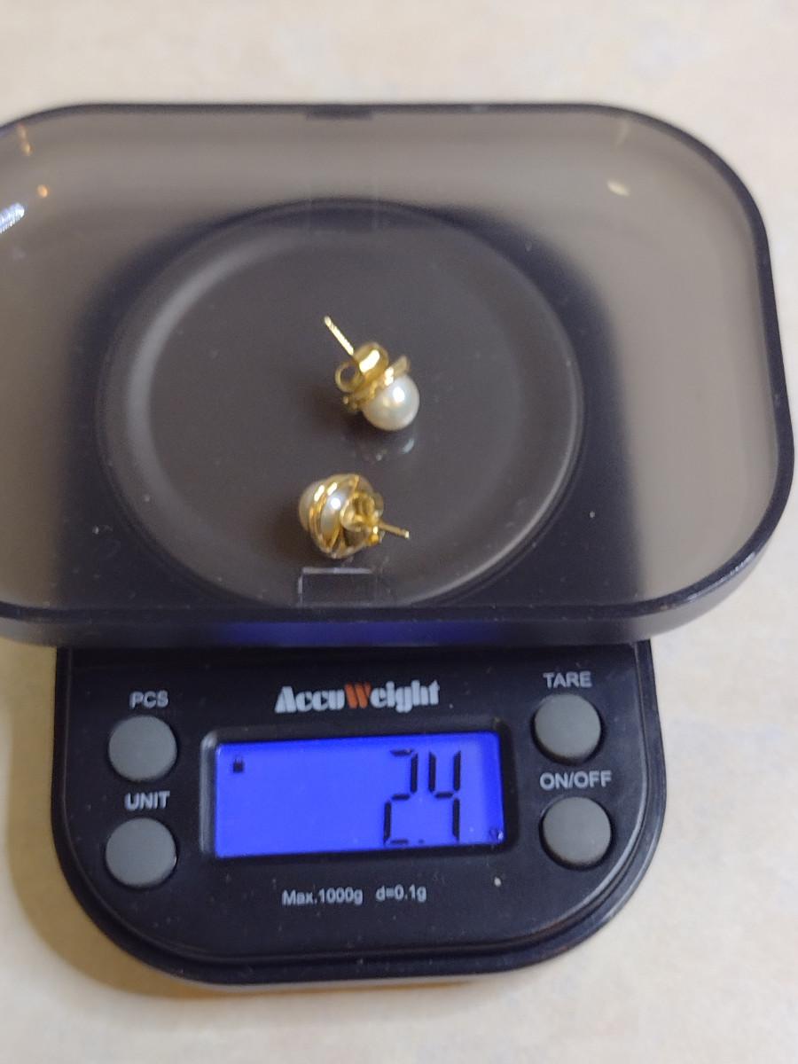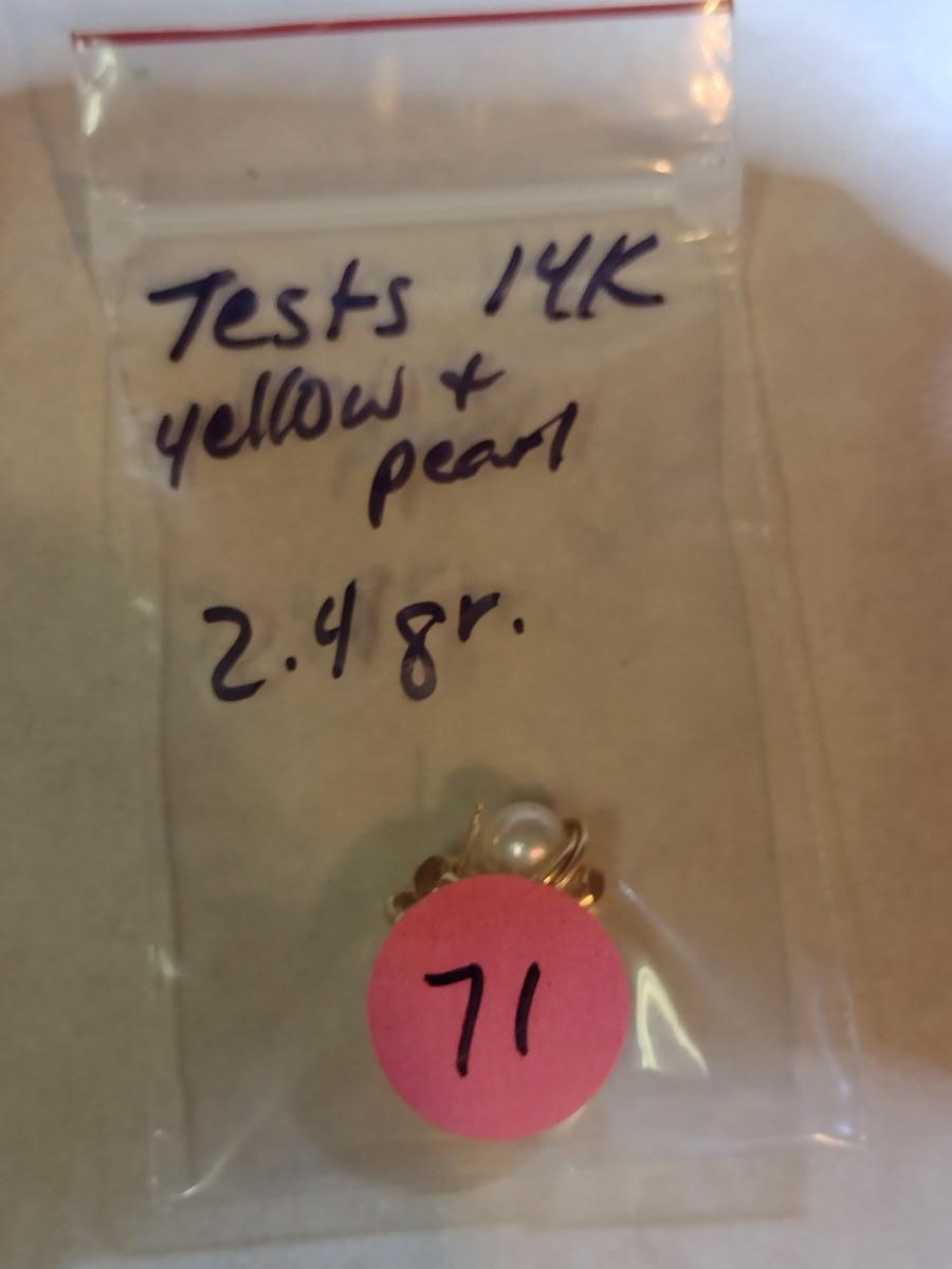 14 Karat Yellow Gold and Pearl Post Earrings- Approx Total Weight 2.4 Grams (#71). Item acid tests as 14 Karat. A 6.75% NC sales tax will be added to the jewelry invoice amount at the end of the sale. Coins are exempt from state sales tax.