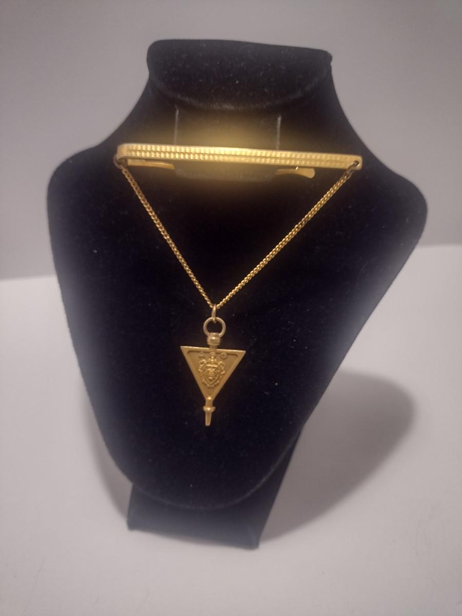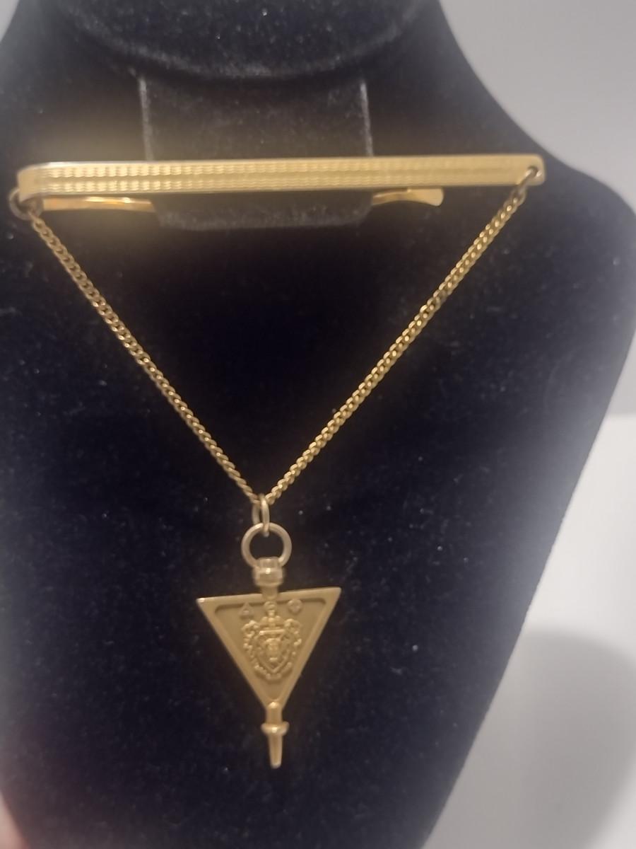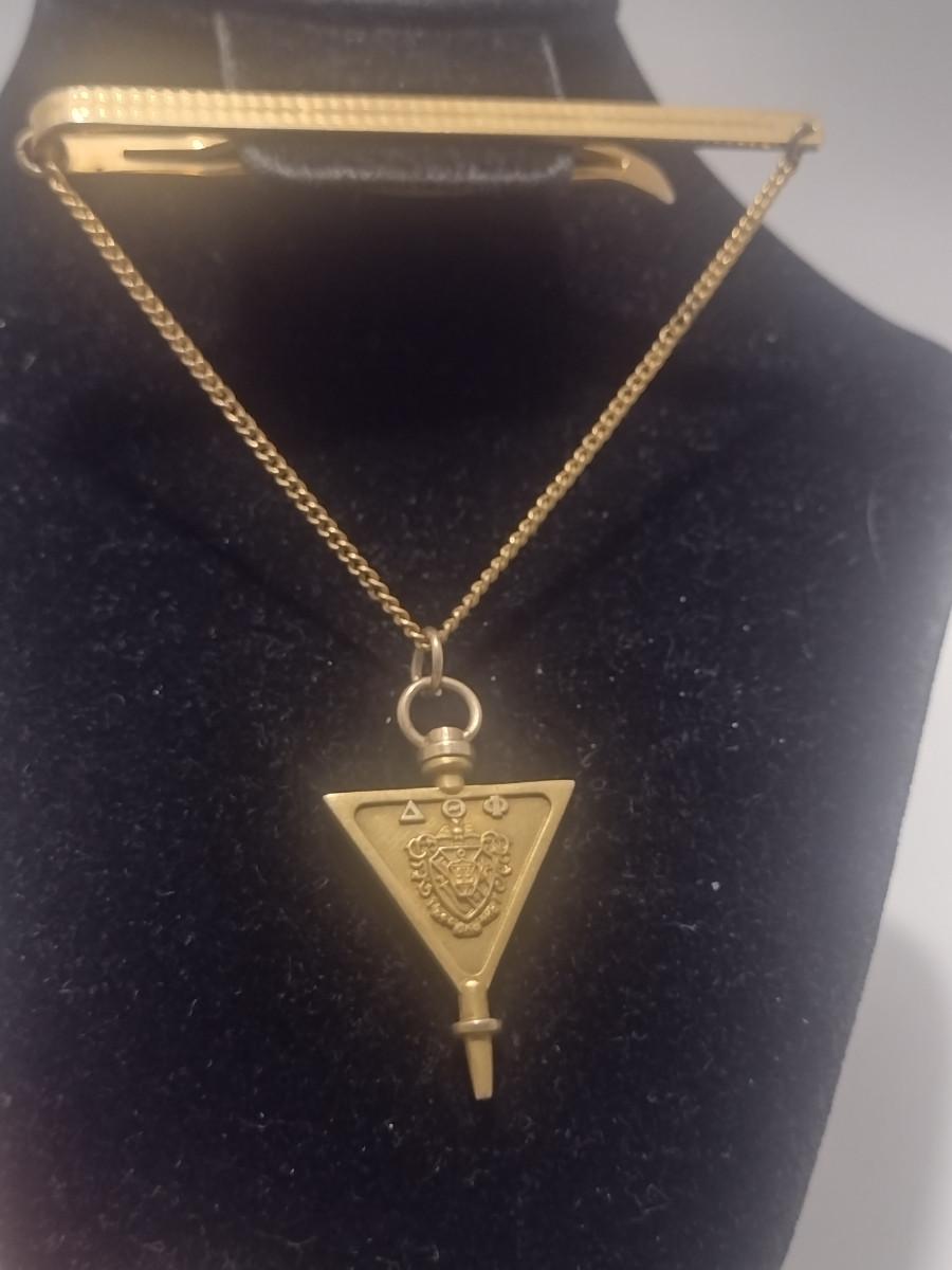 14 Karat Yellow Gold Delta Theta Phi Fraternity Pin Tie Clip- Approx Total Weight 4.94 Grams (#3). Only the key portion is 14 karat, tie clip and chain are not included in weight.