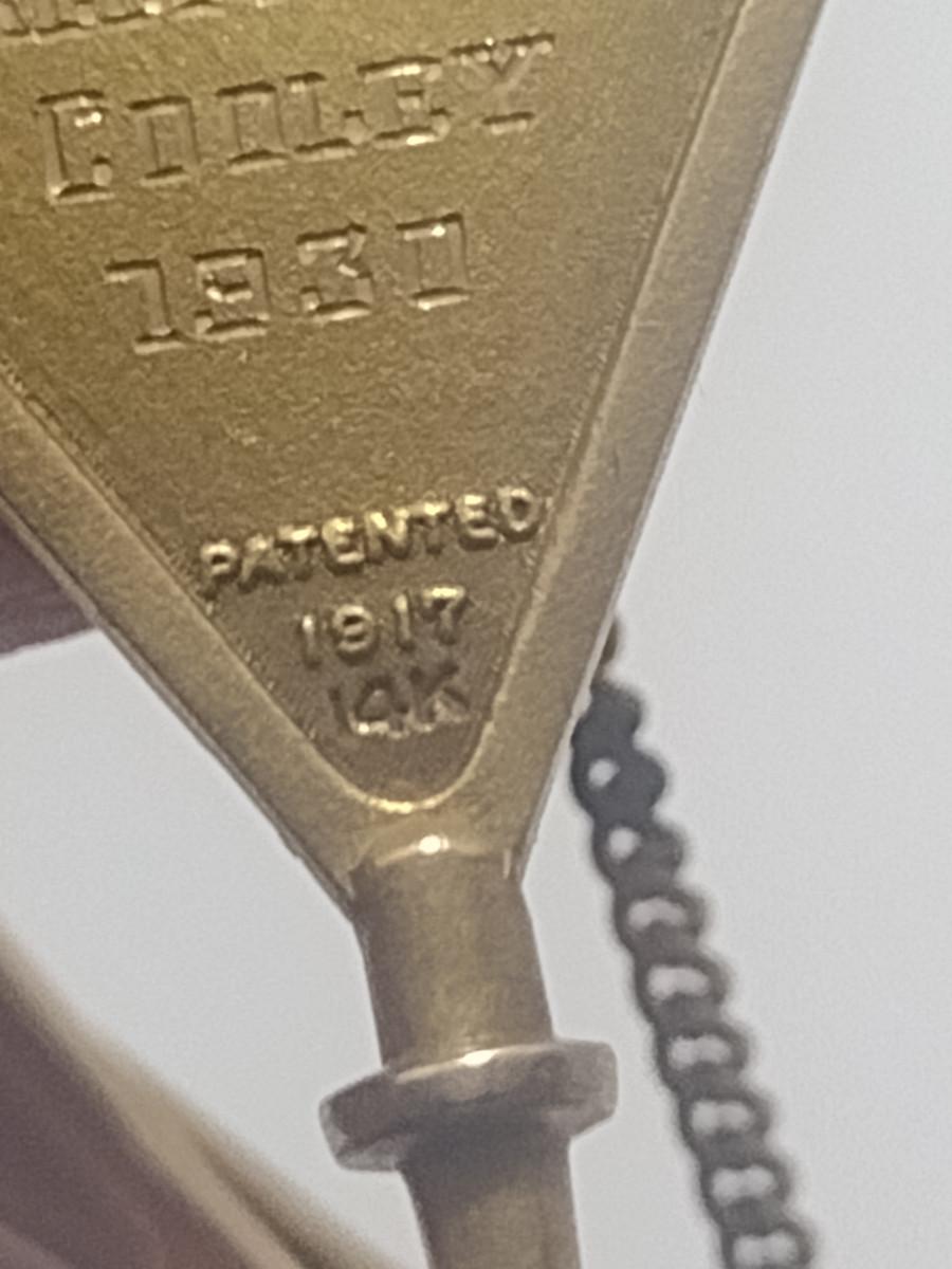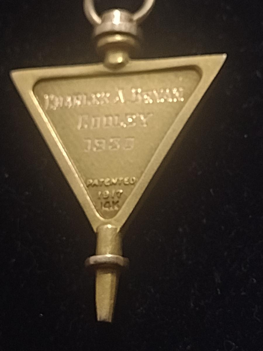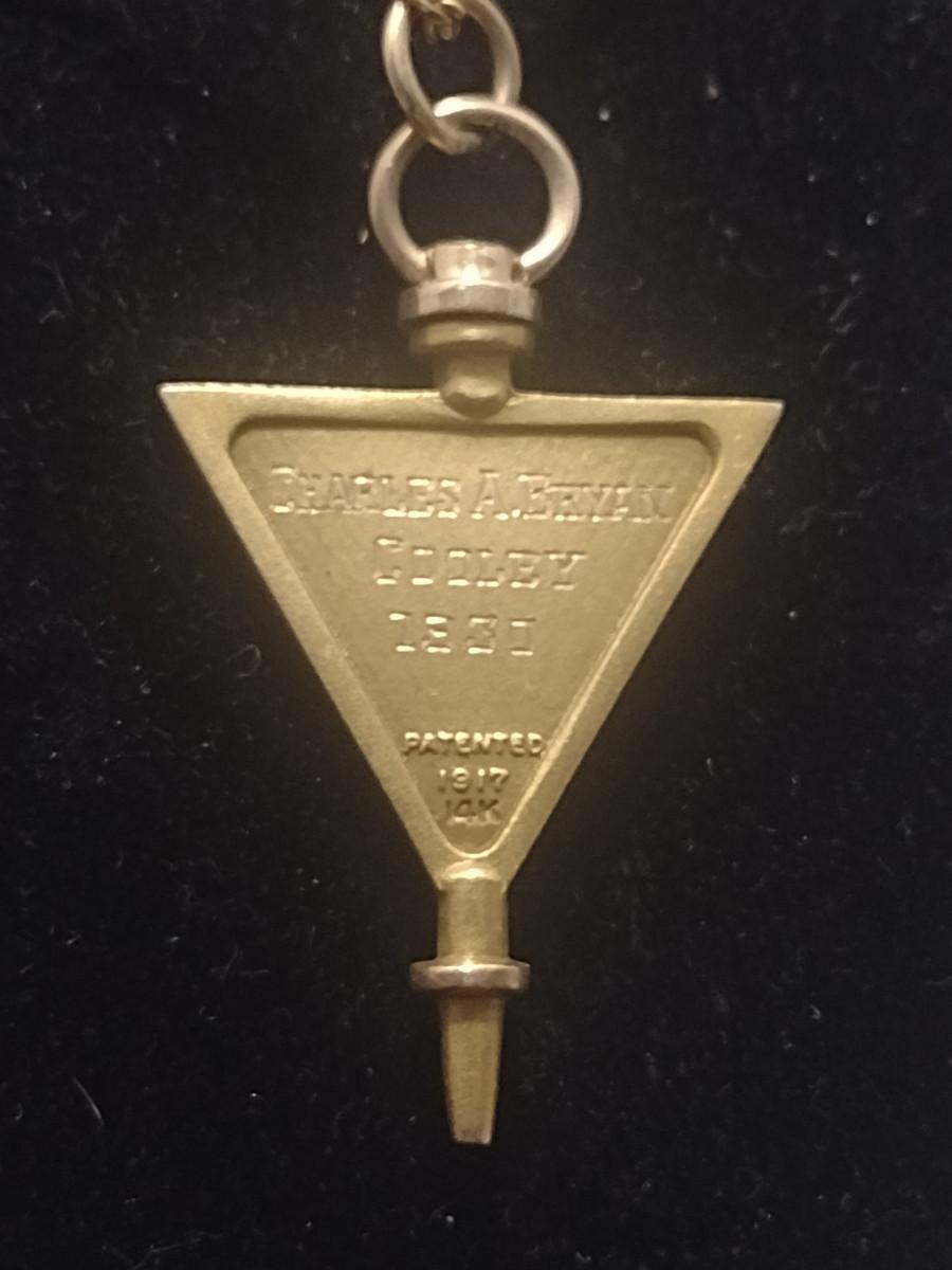 14 Karat Yellow Gold Delta Theta Phi Fraternity Pin Tie Clip- Approx Total Weight 4.94 Grams (#3). Only the key portion is 14 karat, tie clip and chain are not included in weight.