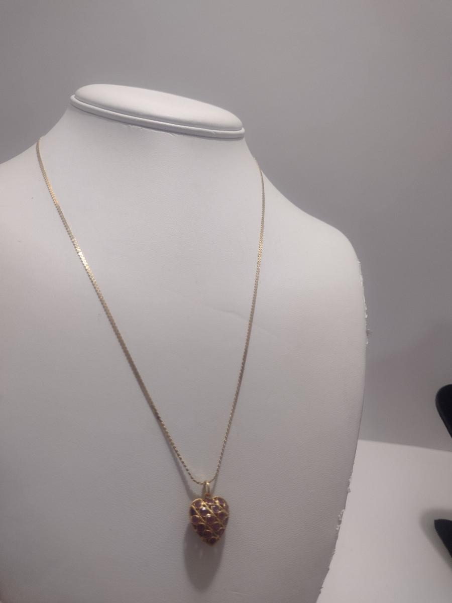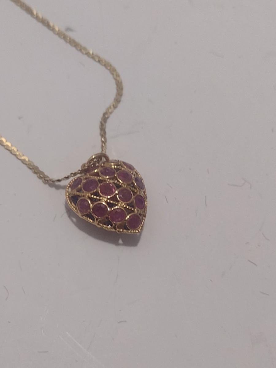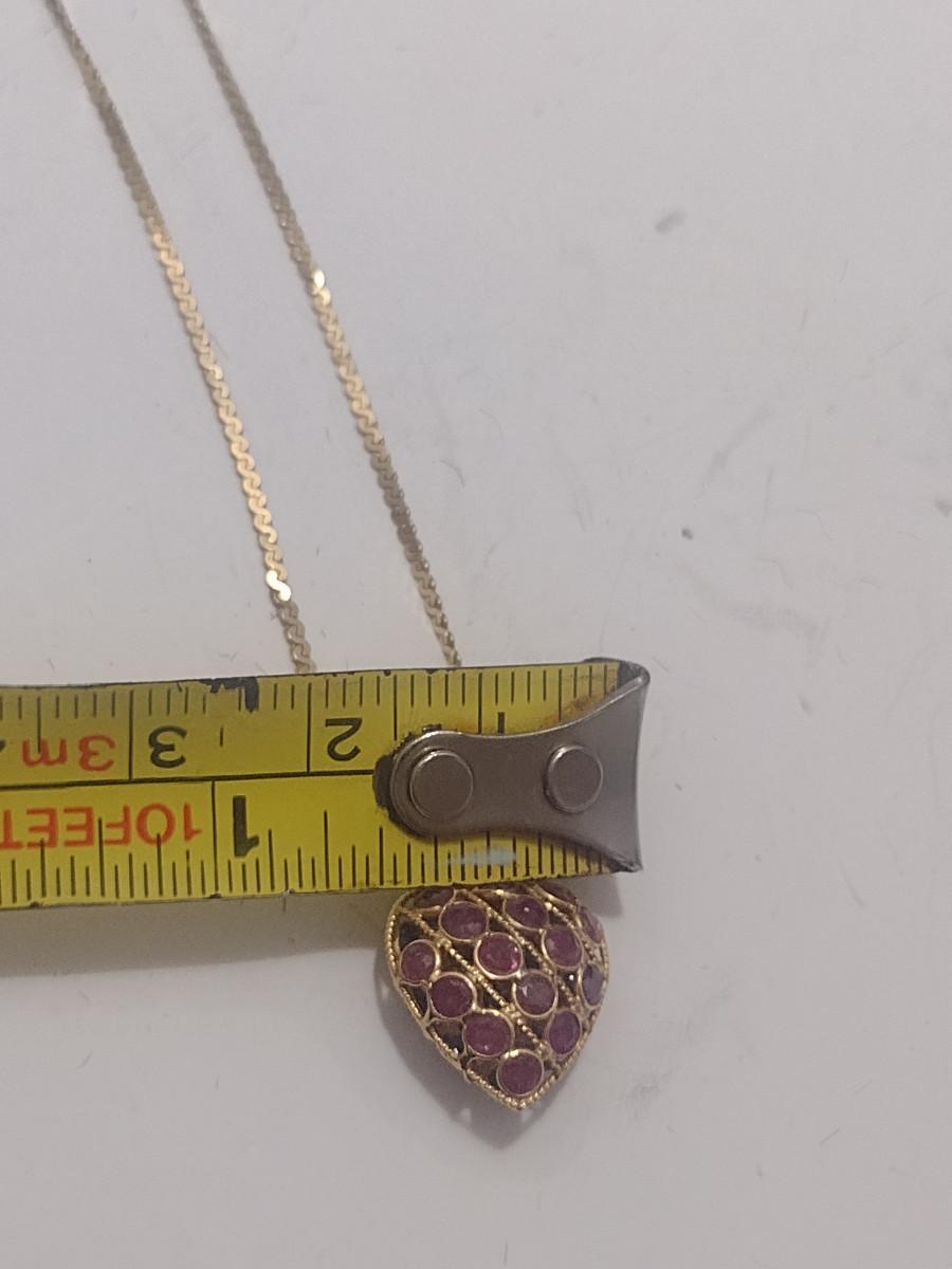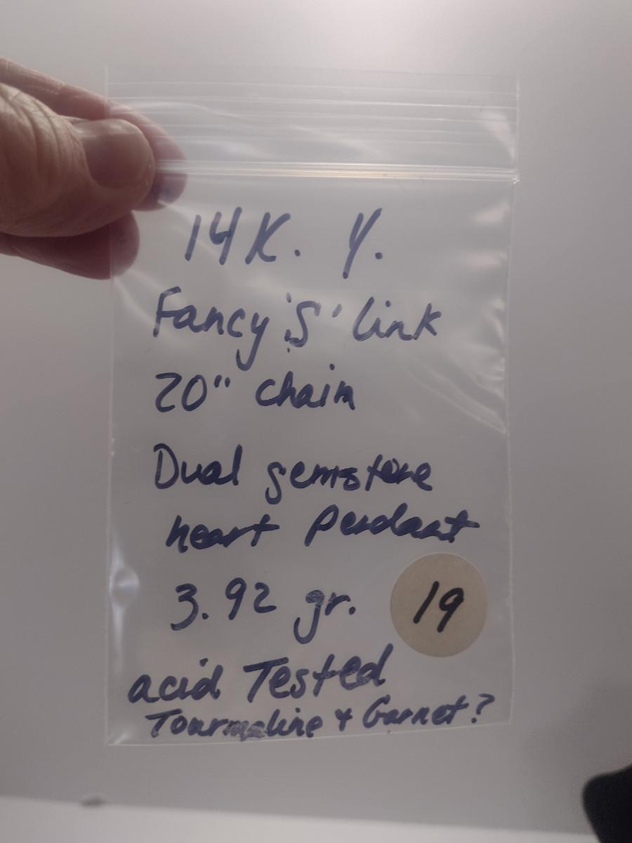 14 Karat Yellow Gold Fancy 'S' Link Necklace with Dual Gemstone Heart Pendant- Approx Total Weight 3.92 Grams (#19). Necklace is approx 20" long. Item is acid tested. Gemstones in pendant possibly garnet and tourmaline.