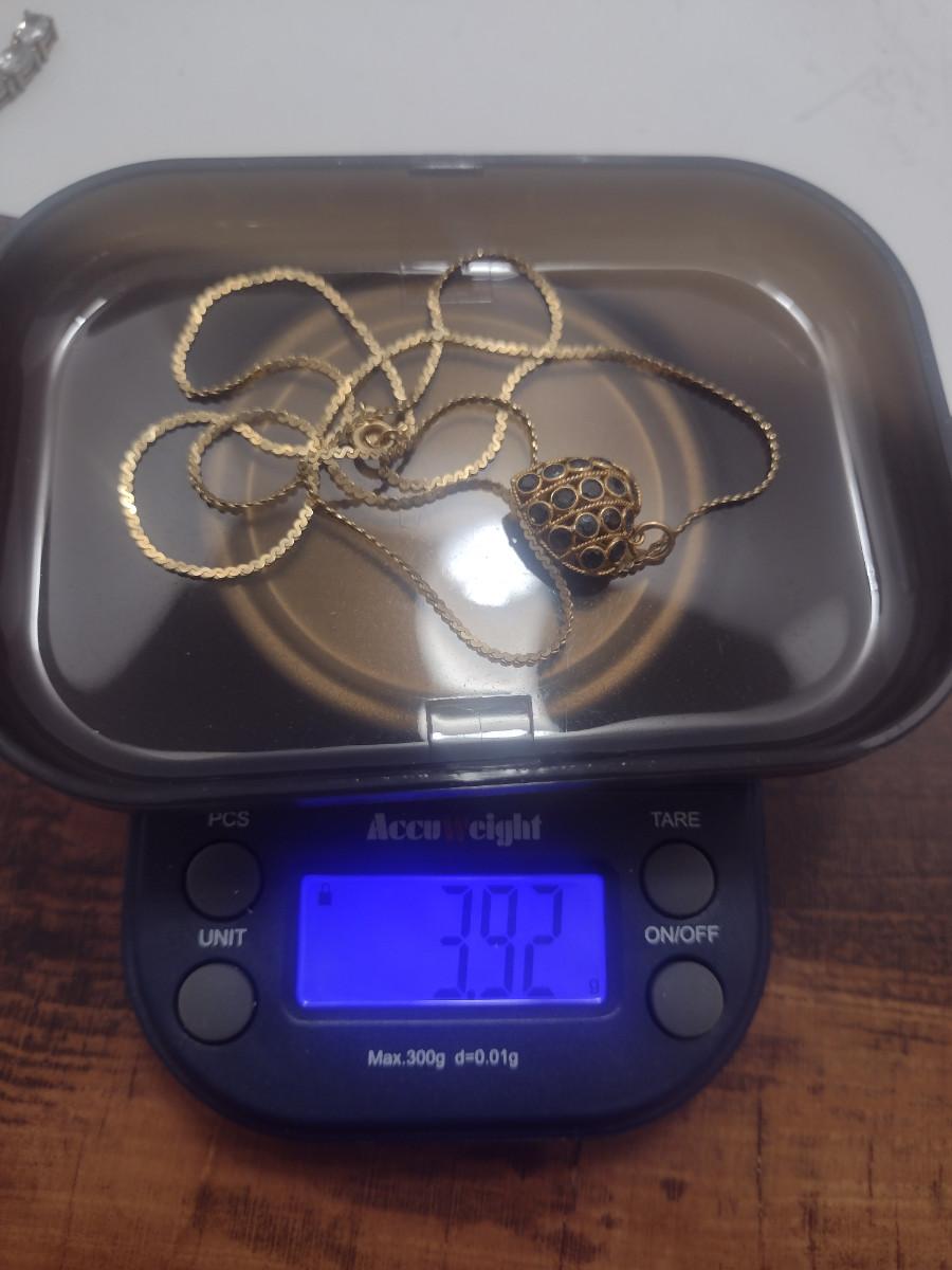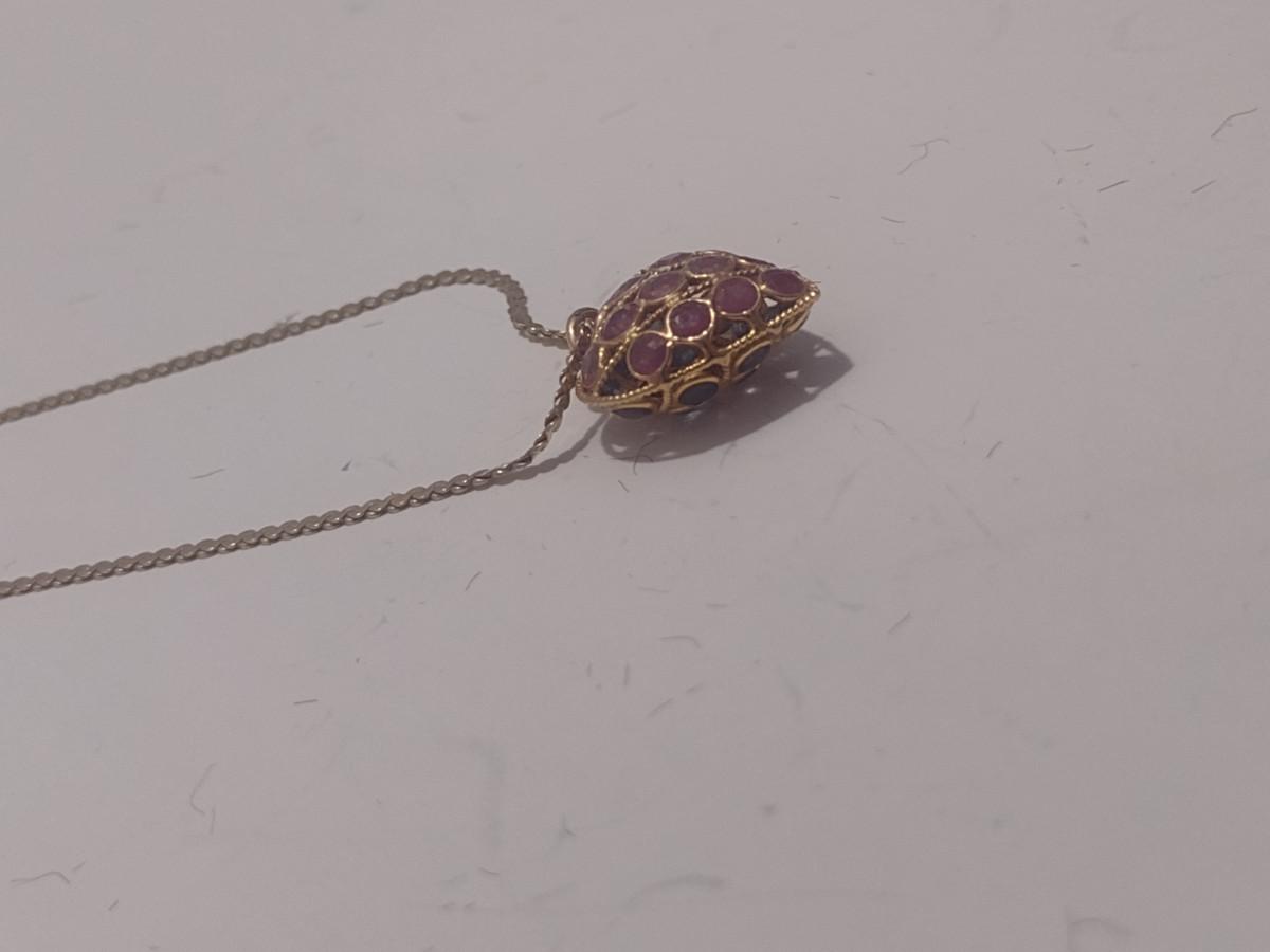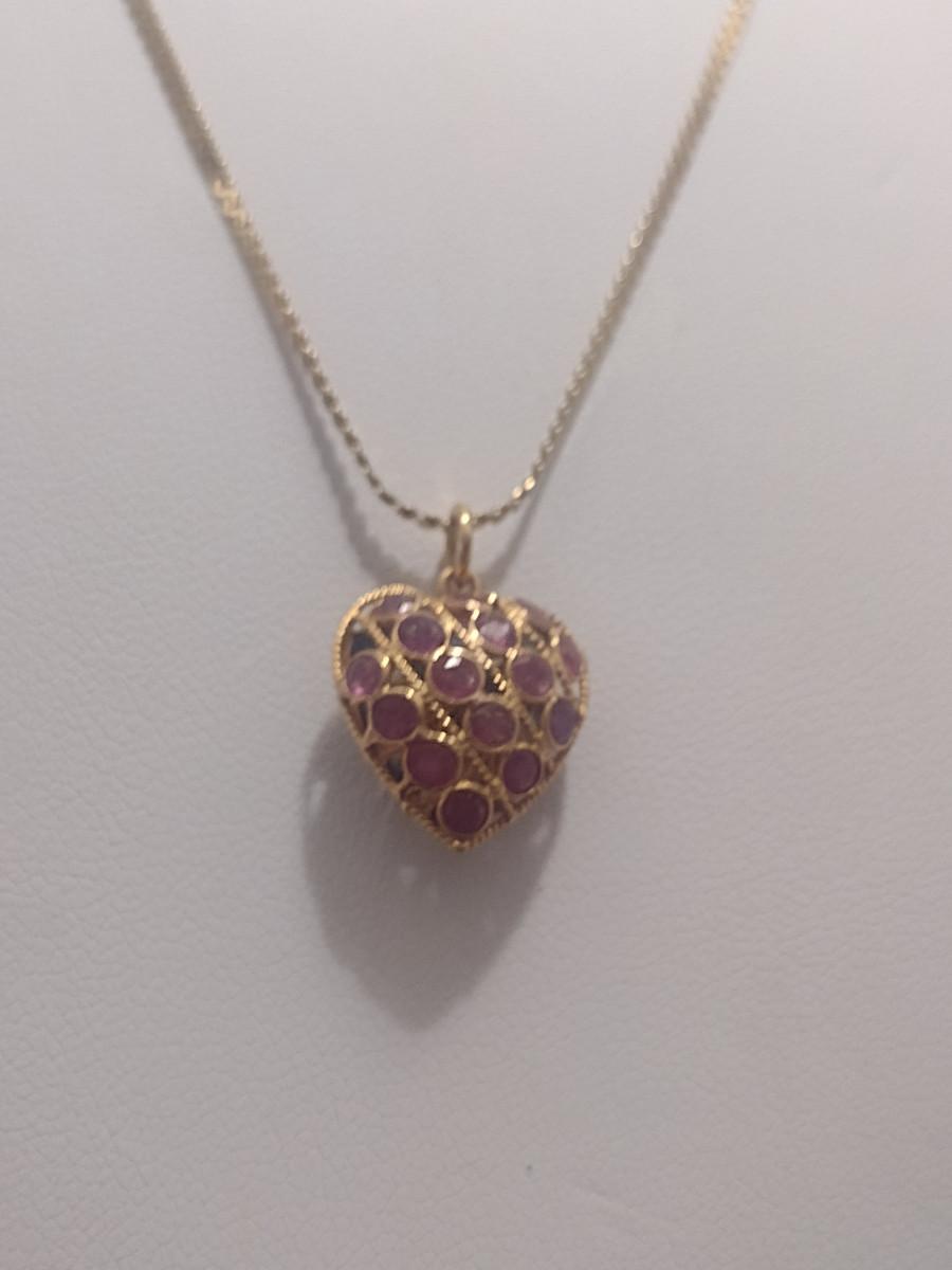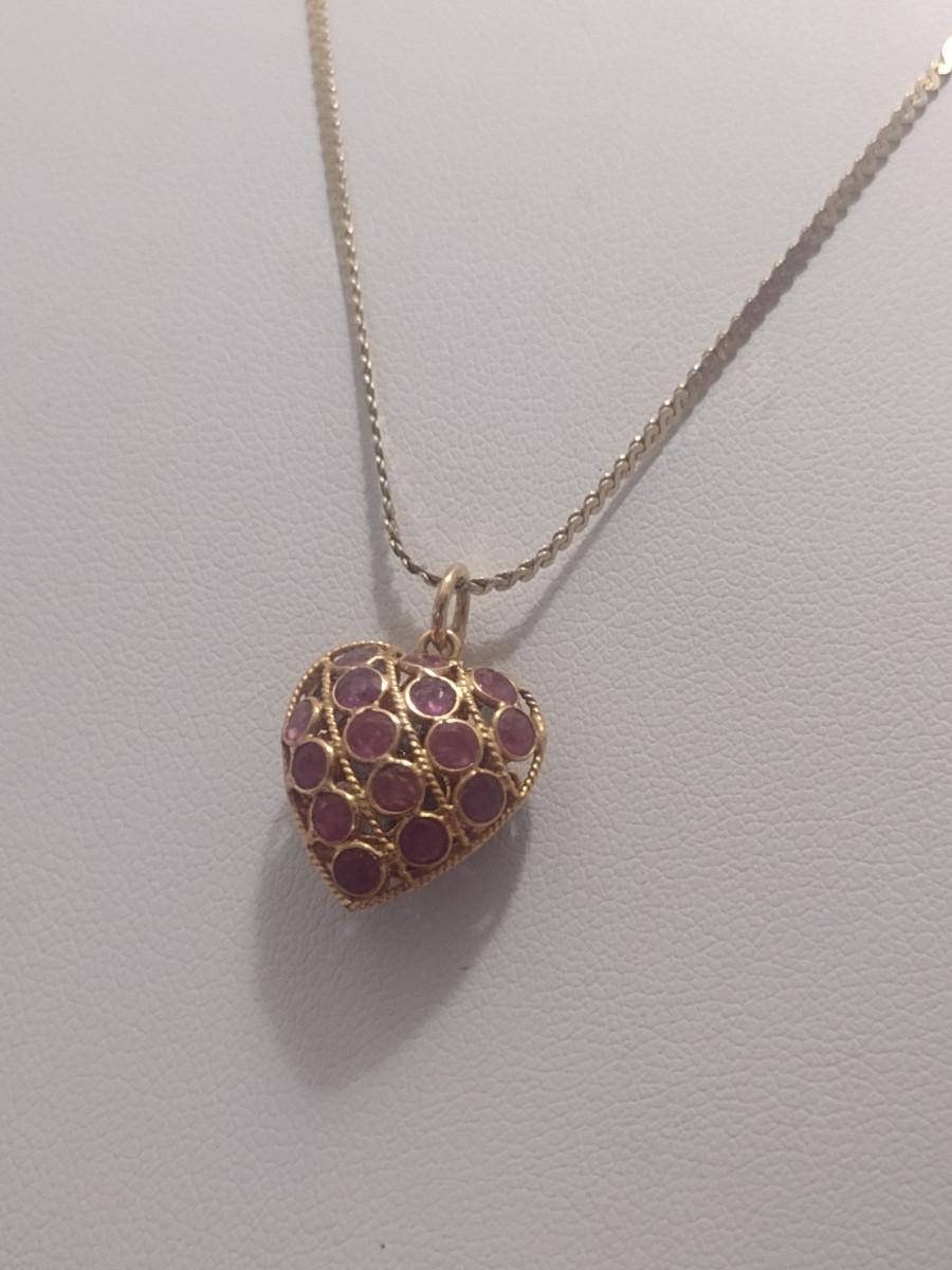 14 Karat Yellow Gold Fancy 'S' Link Necklace with Dual Gemstone Heart Pendant- Approx Total Weight 3.92 Grams (#19). Necklace is approx 20" long. Item is acid tested. Gemstones in pendant possibly garnet and tourmaline.