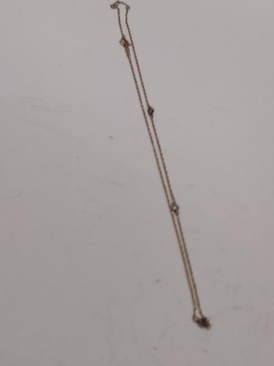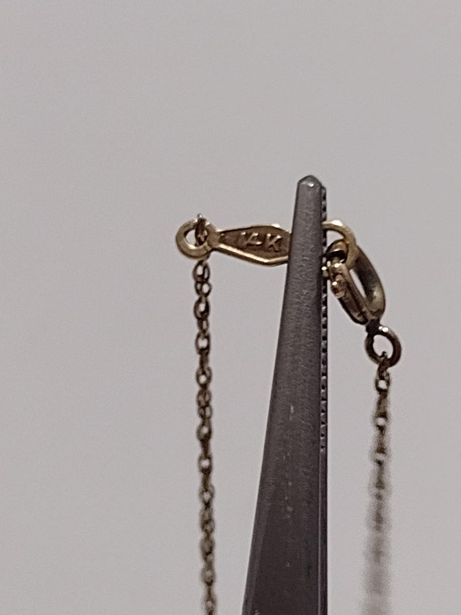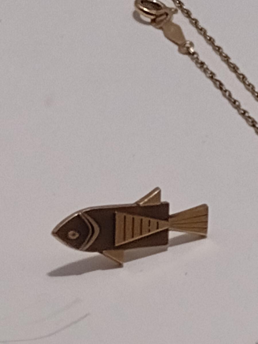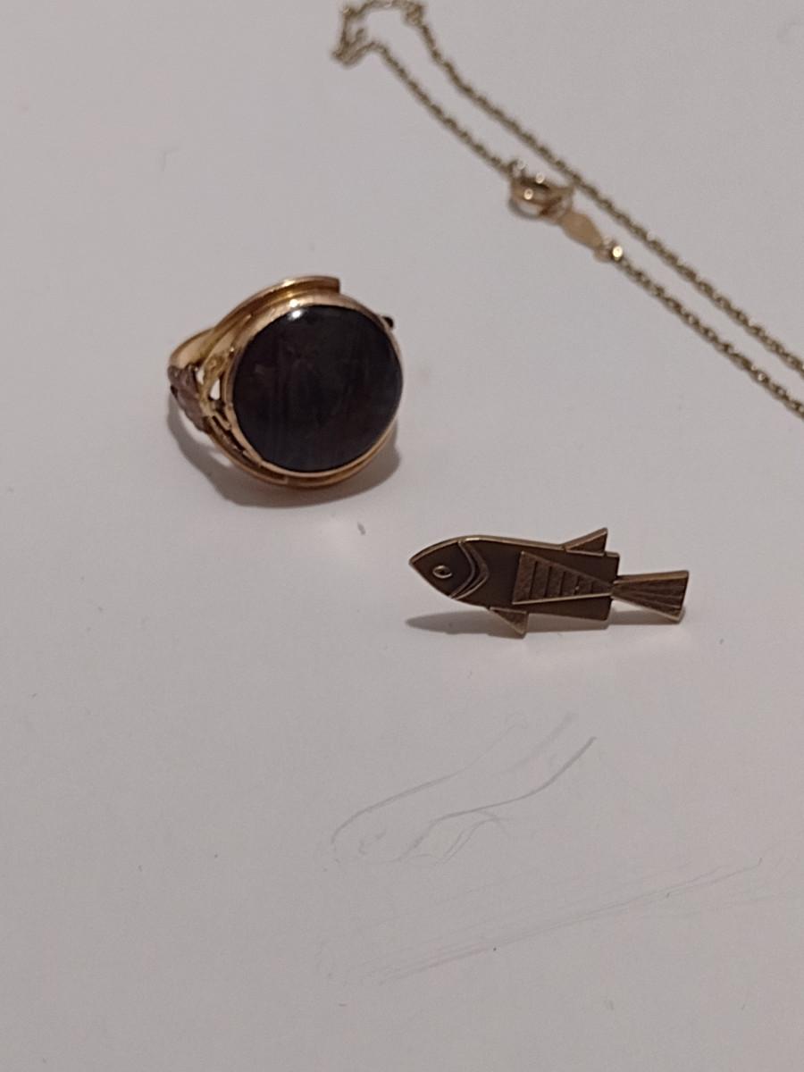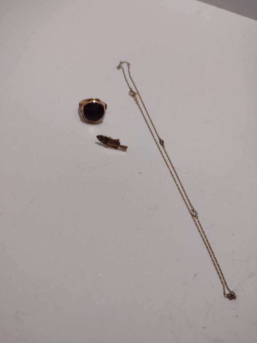 14 Karat Yellow Gold Jewelry- Broken/Incomplete- Approx Total Weight 5.13 Grams (#27). Necklace and ring are broken. Ring has gemstone included in weight shown. Fish tie pin has no back.