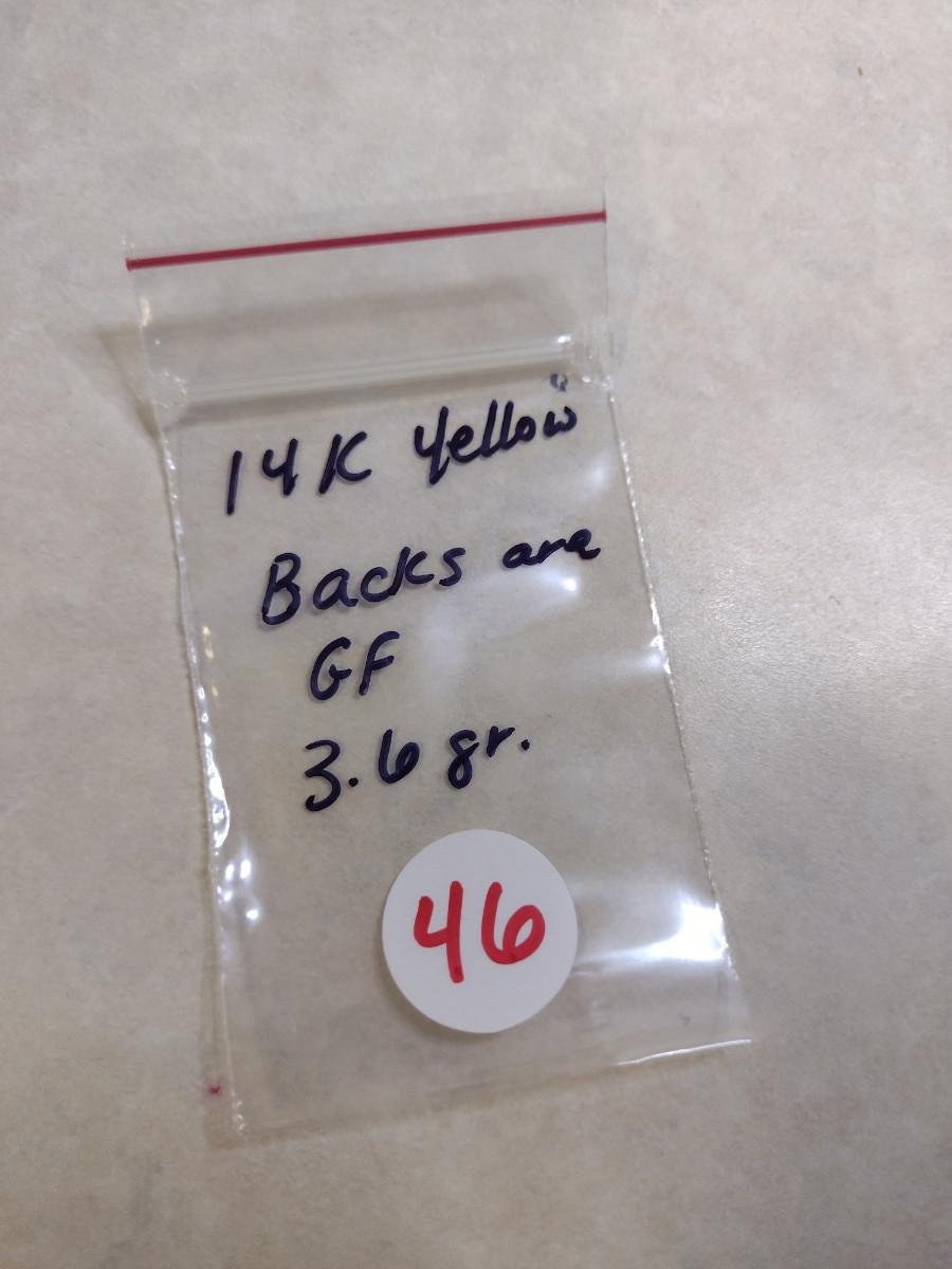 14 Karat Yellow Gold Post Earrings- Approx Total Weight 3.6 Grams (#46). Backs are only gold filled and are not included in weight. A 6.75% NC sales tax will be added to the jewelry invoice amount at the end of the sale. Coins are exempt from state sales tax.