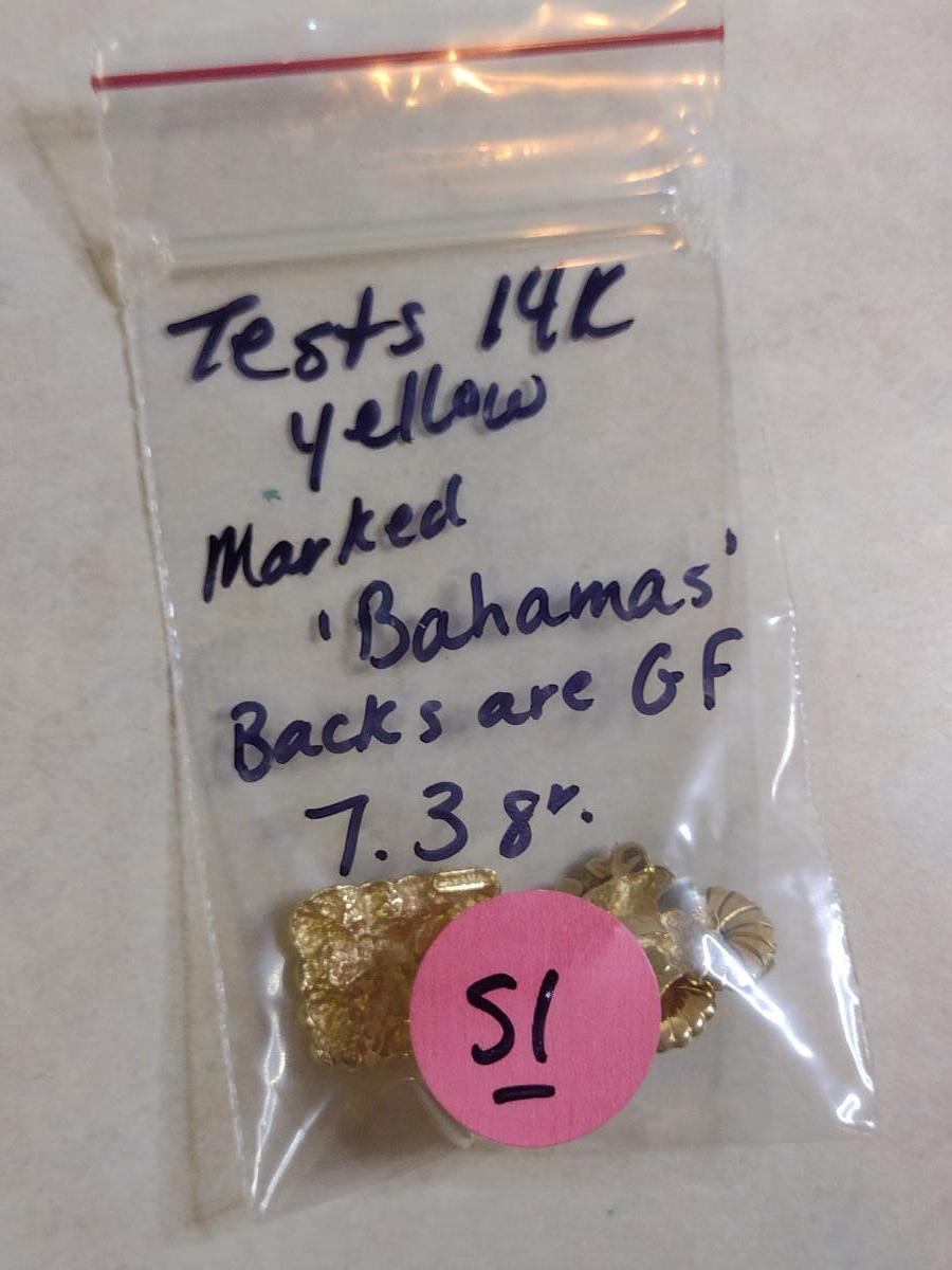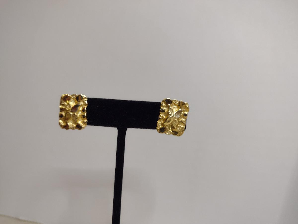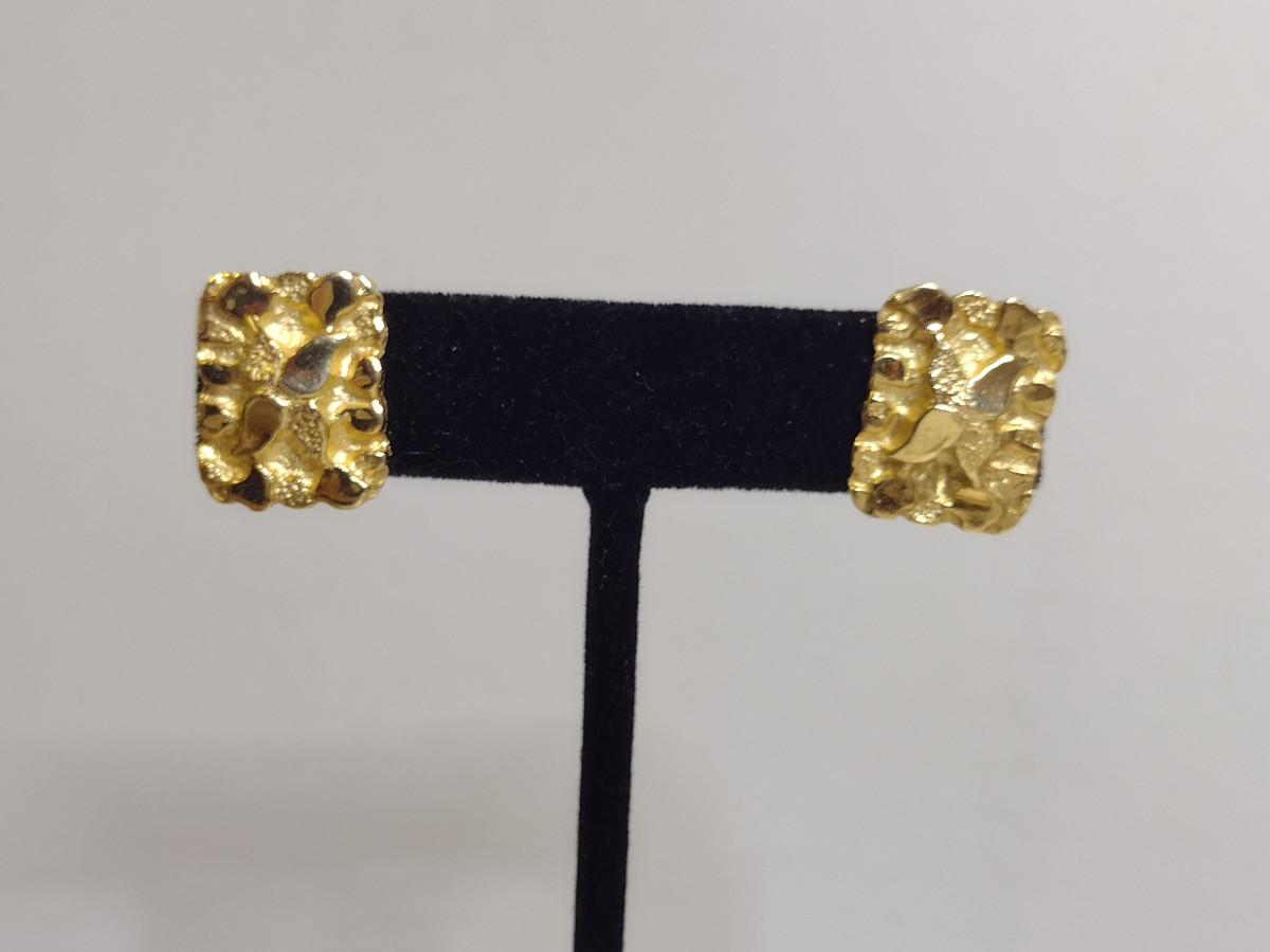 14 Karat Yellow Gold Post Earrings- Gold Nugget Design- Approx Total Weight 7.3 Grams (#51). Item is marked 'Bahamas' and acid tests as 14 Karat. Backs are only gold filled, and are not included in weight. A 6.75% NC sales tax will be added to the jewelry invoice amount at the end of the sale. Coins are exempt from state sales tax.