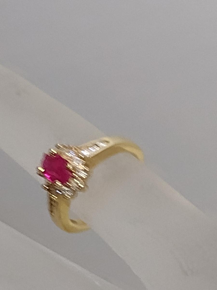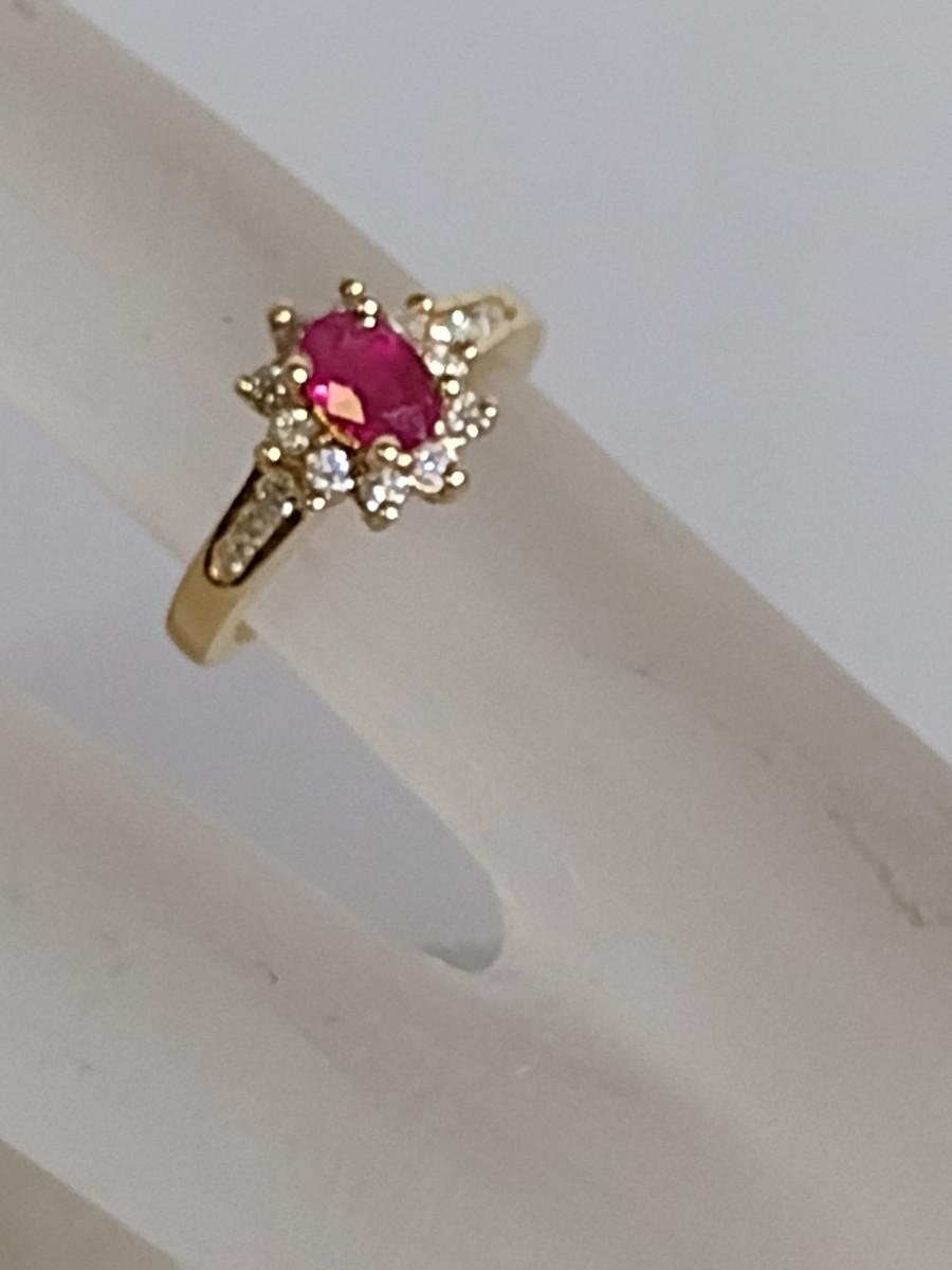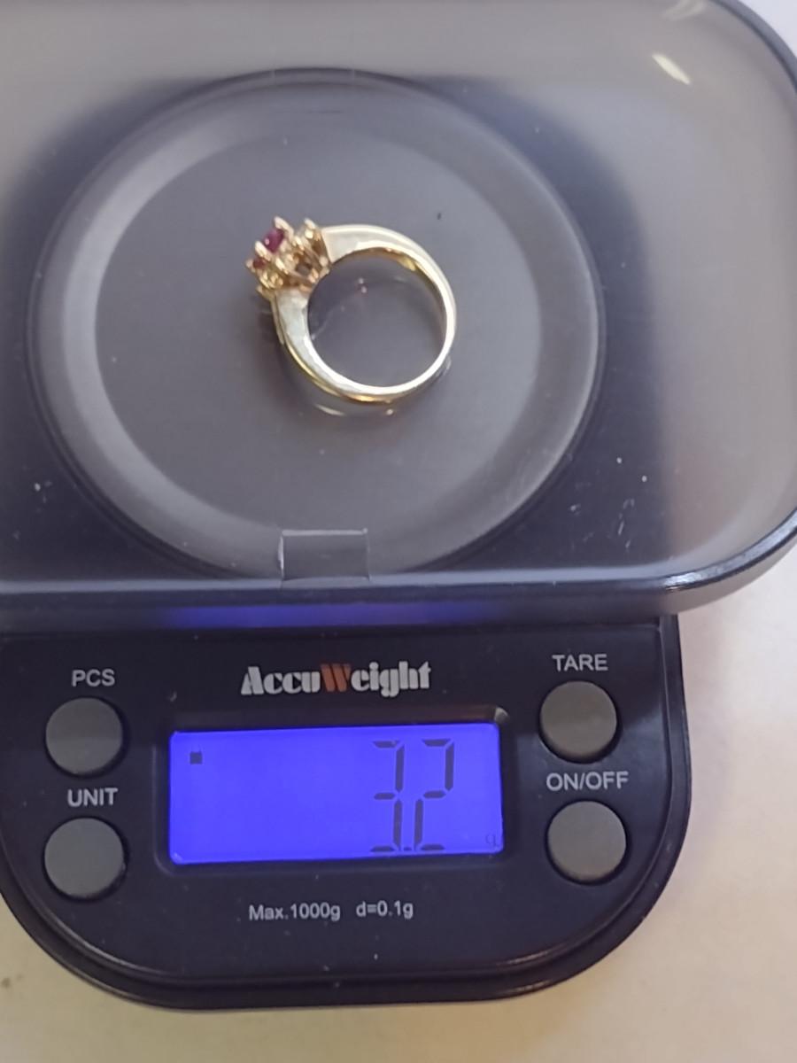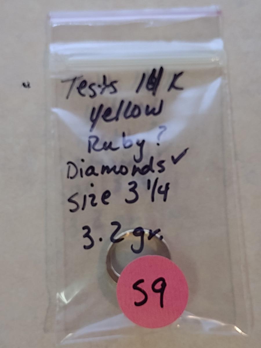 14 Karat Yellow Gold Ring with Gemstone and Diamonds- Approx Size 3 1/4 and Total Weight 3.2 Grams (#59). Item acid tests as 14 Karat. Diamonds test positive with Gemoro. Gemstone is possibly ruby. A 6.75% NC sales tax will be added to the jewelry invoice amount at the end of the sale. Coins are exempt from state sales tax.