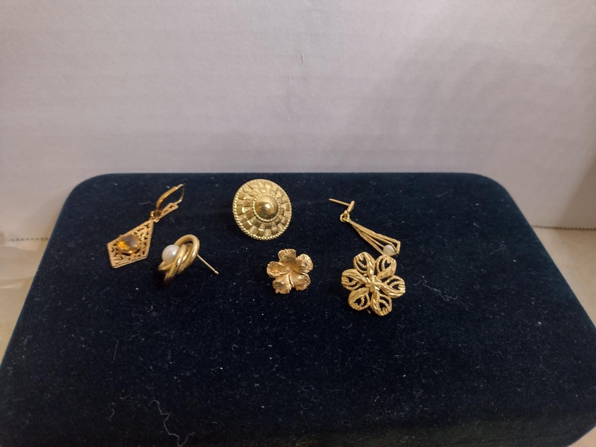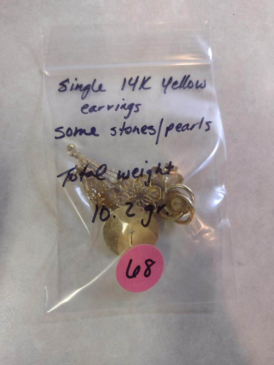 14 Karat Yellow Gold Single Earrings- Approx Total Weight 10.2 Grams (#68). Earrings are single only and have no matches. Some have gemstones/pearls. A 6.75% NC sales tax will be added to the jewelry invoice amount at the end of the sale. Coins are exempt from state sales tax.