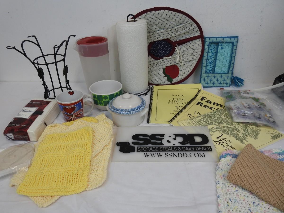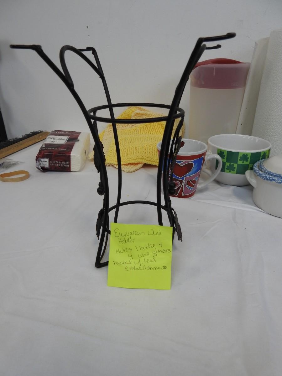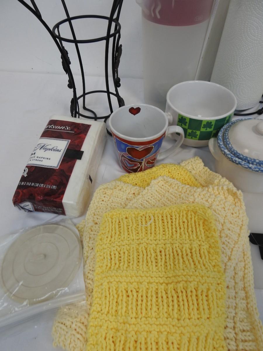 14+ Kitchen Lot: Wine Bottle Holder, Paper Towel Holder, Cups, Dish Cloths, etc