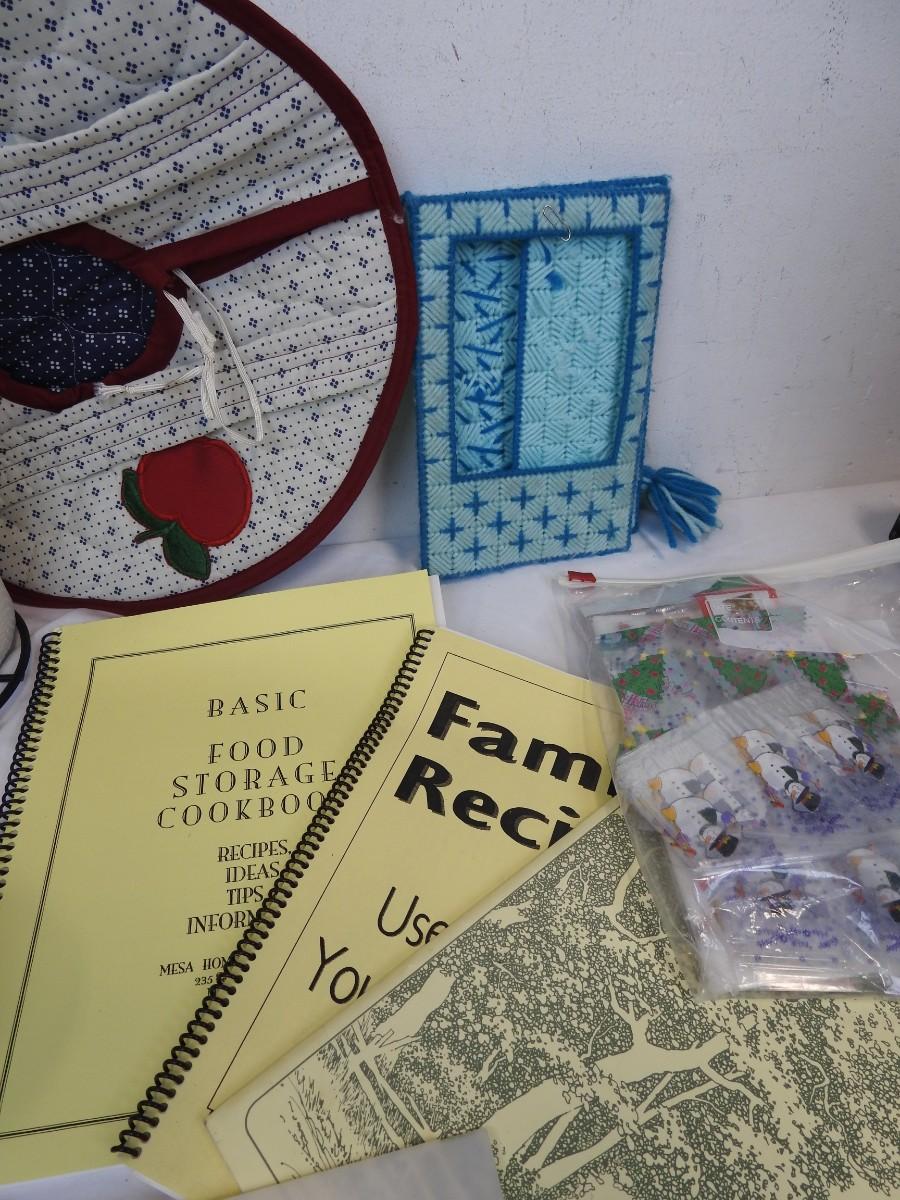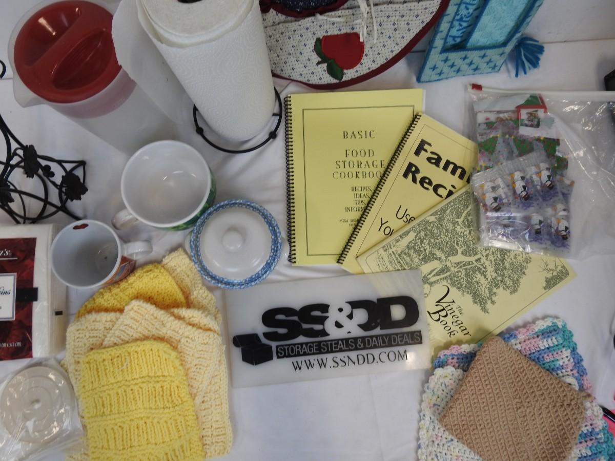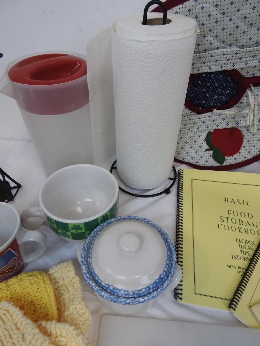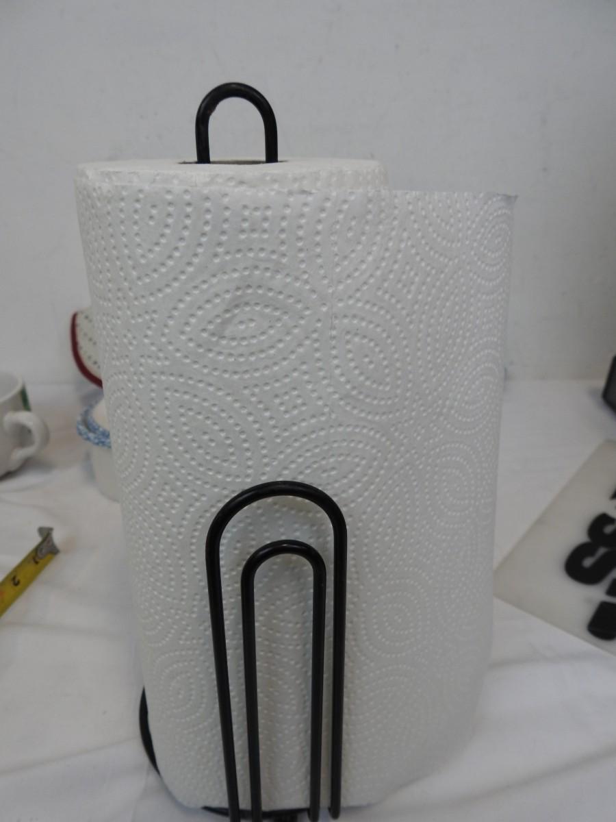 14+ Kitchen Lot: Wine Bottle Holder, Paper Towel Holder, Cups, Dish Cloths, etc