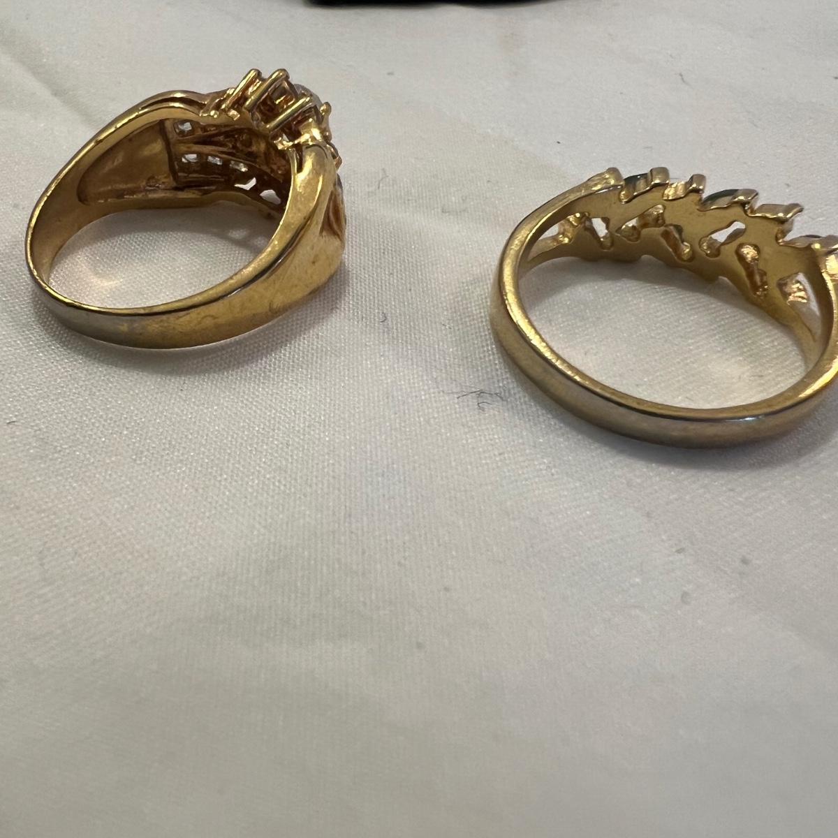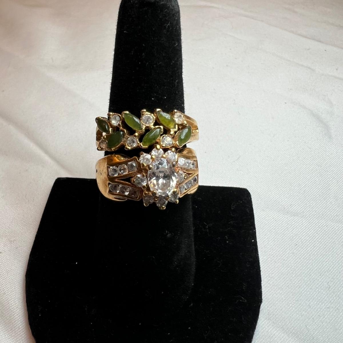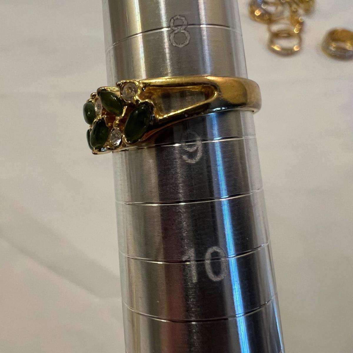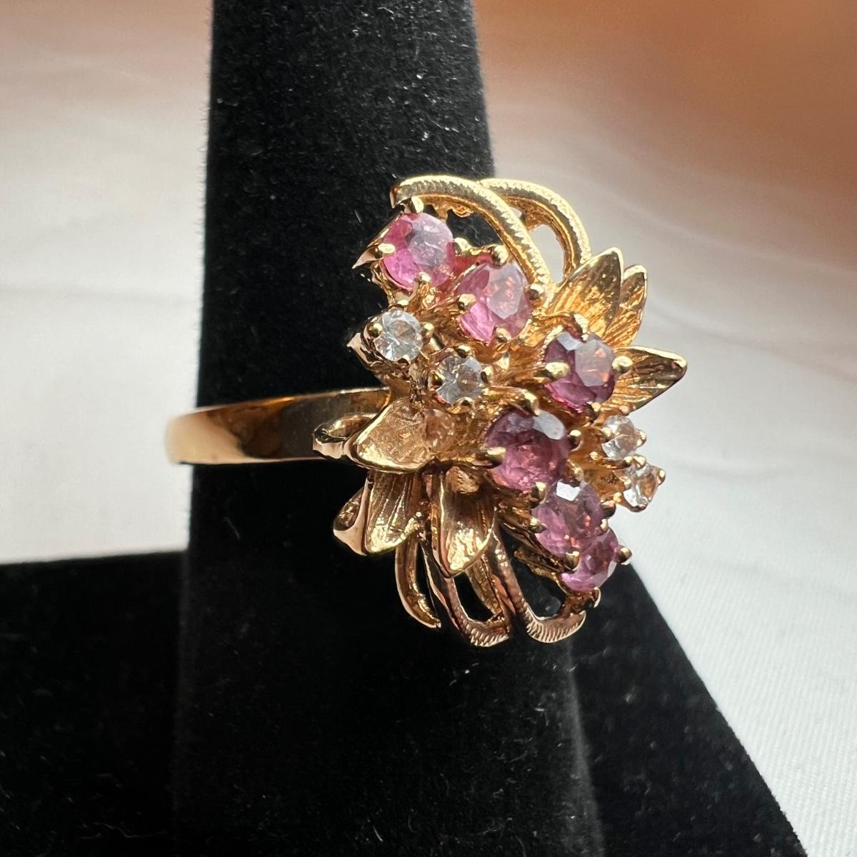 This stunning 14K gold plated ring has a cluster of four clear stones and six purple stones. Clear stones did not test positive on our diamond tester, and the other stones appear to be amethyst but we cannot verify them. Lot also includes 11 more rings that are but one gold colored metal and most have faux gem stones. See images for full inventory and sizes.