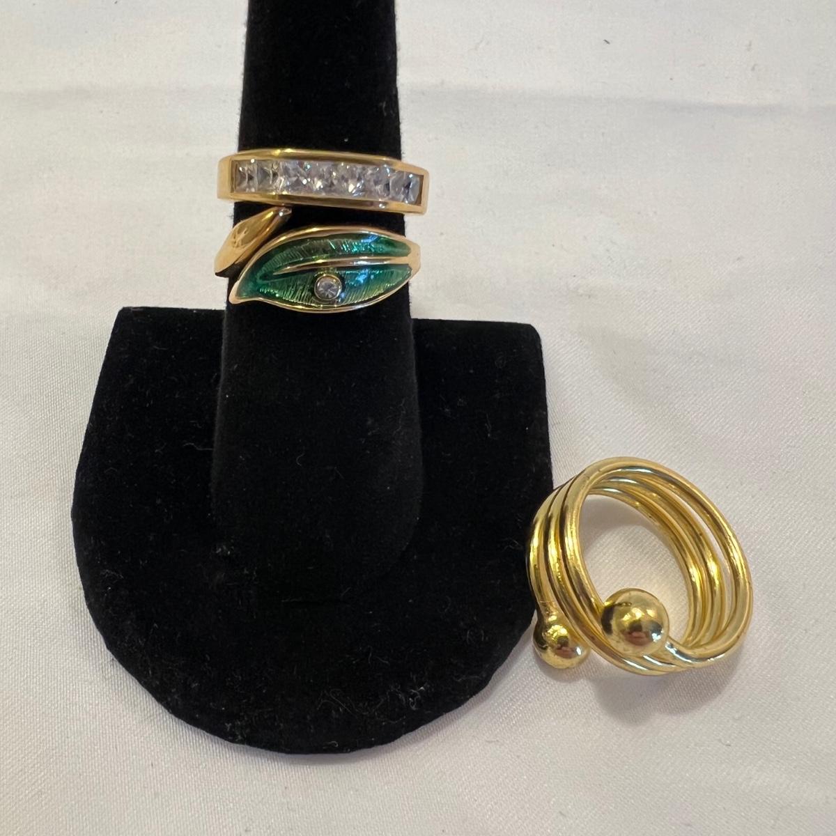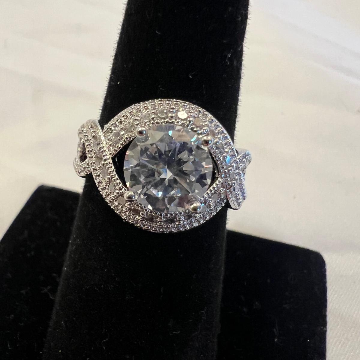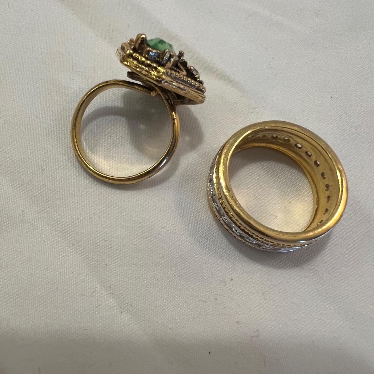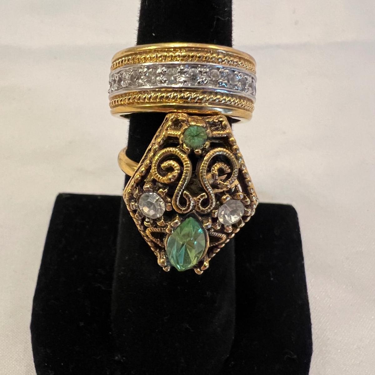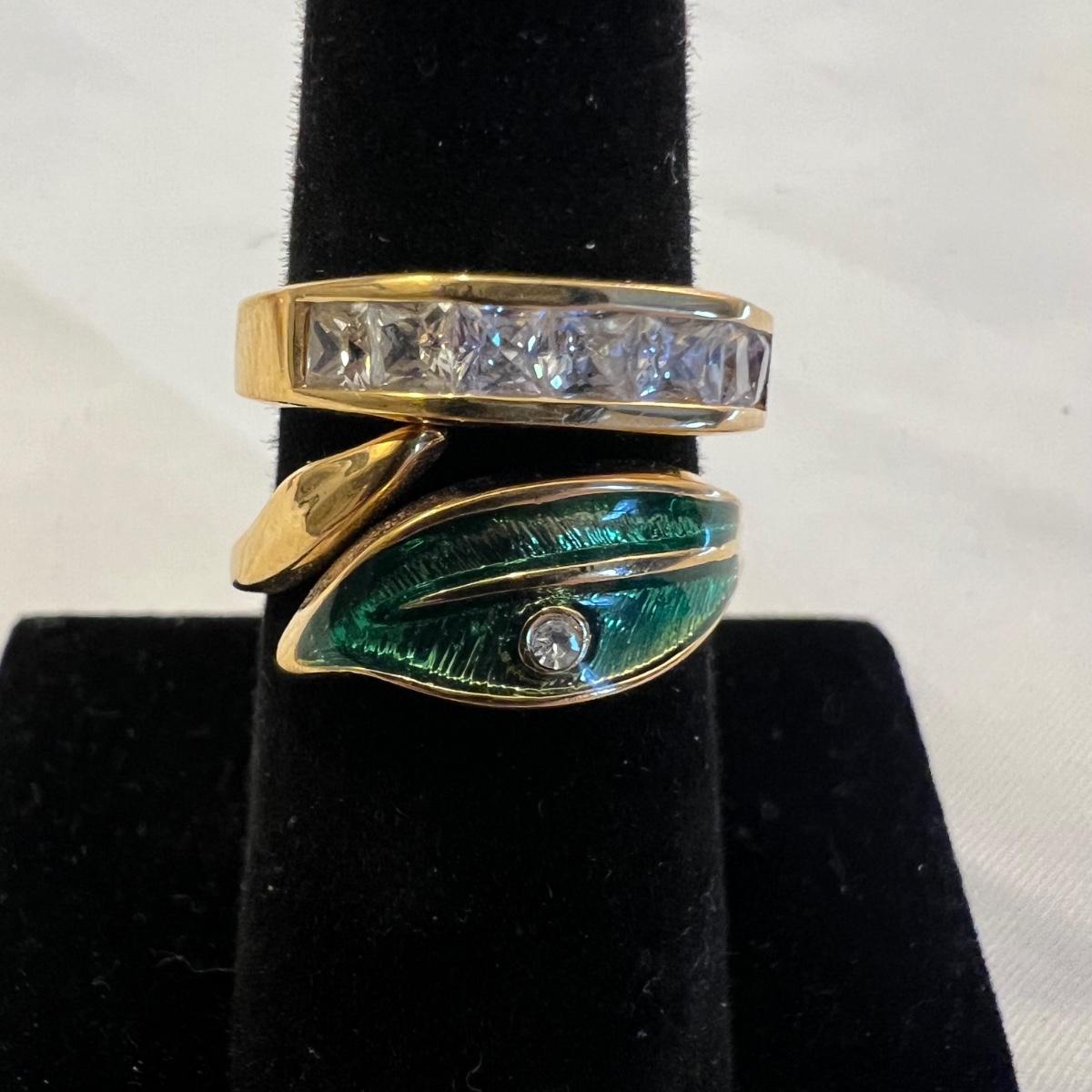 This stunning 14K gold plated ring has a cluster of four clear stones and six purple stones. Clear stones did not test positive on our diamond tester, and the other stones appear to be amethyst but we cannot verify them. Lot also includes 11 more rings that are but one gold colored metal and most have faux gem stones. See images for full inventory and sizes.