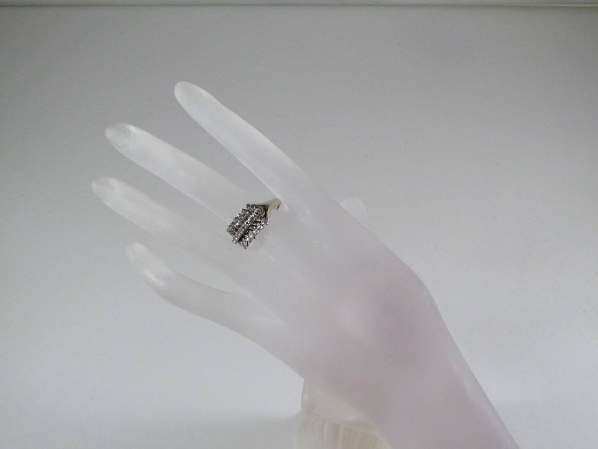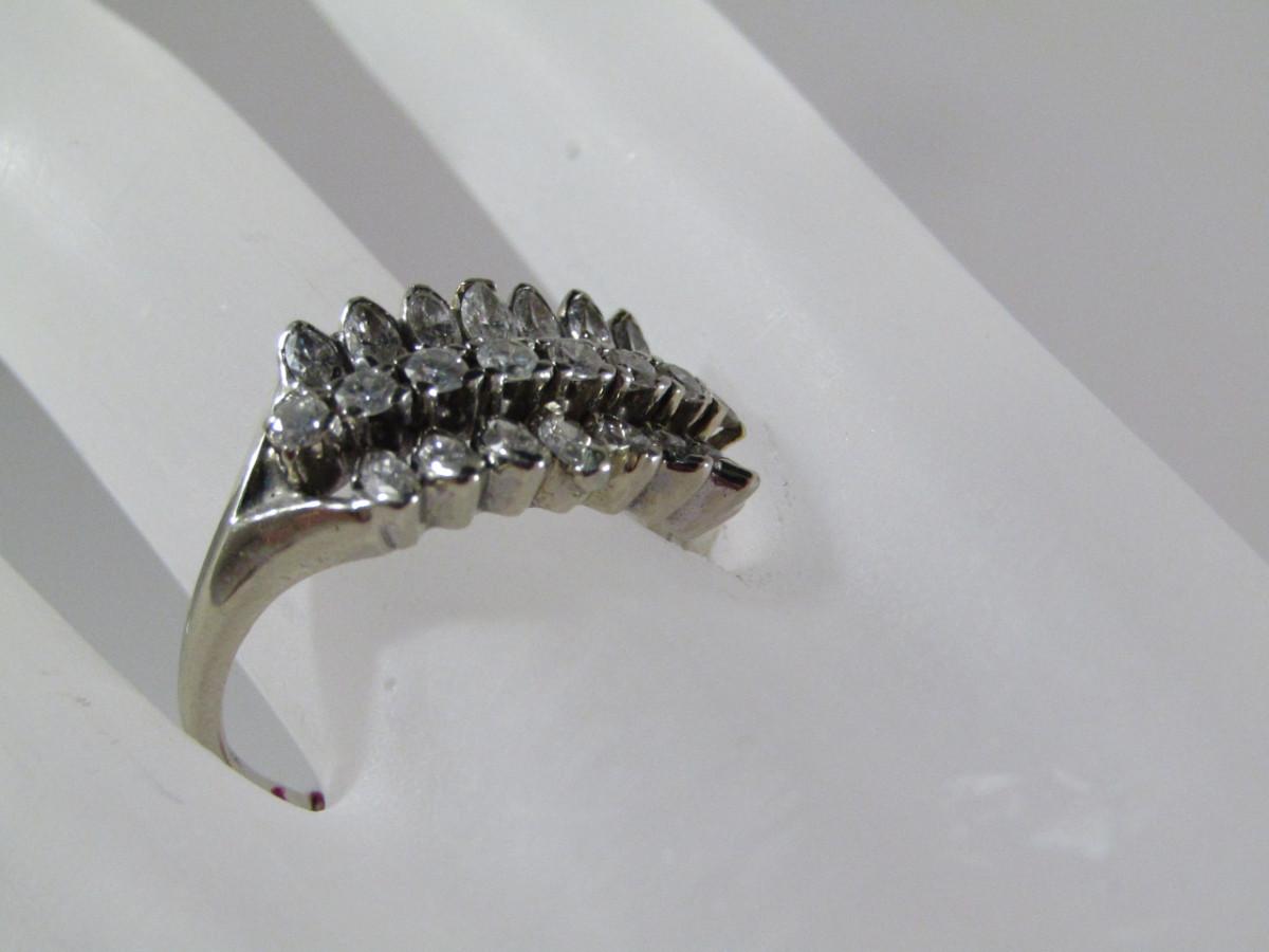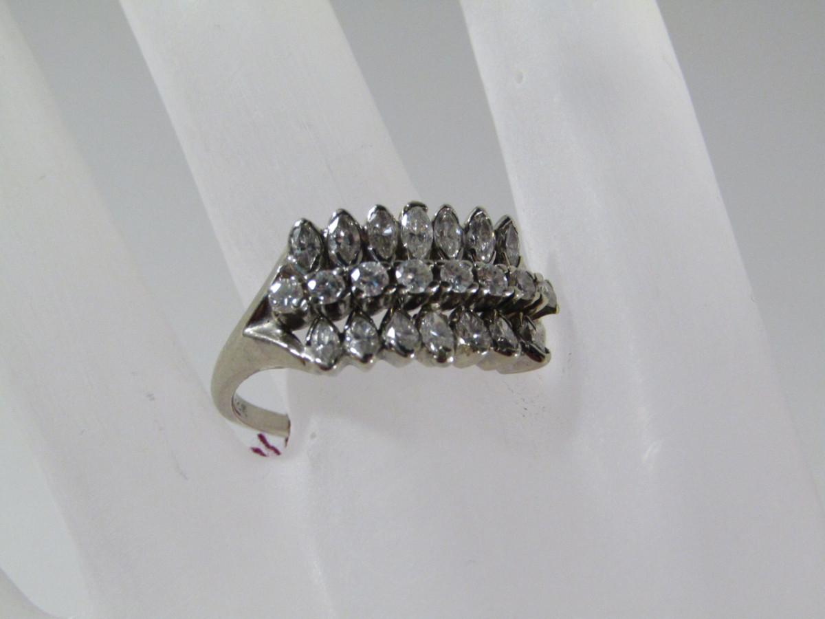 14 Kt White Gold and Diamond Ring- Size 8 3/4- Approx Weight 3.7 dwt (#18). Three rows of diamonds: middle are full cut, top and bottom are marquise cut for a total of approx 1 carat. They are of SI clarity, near colorless.