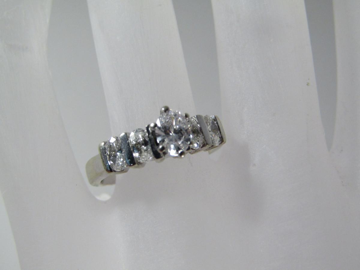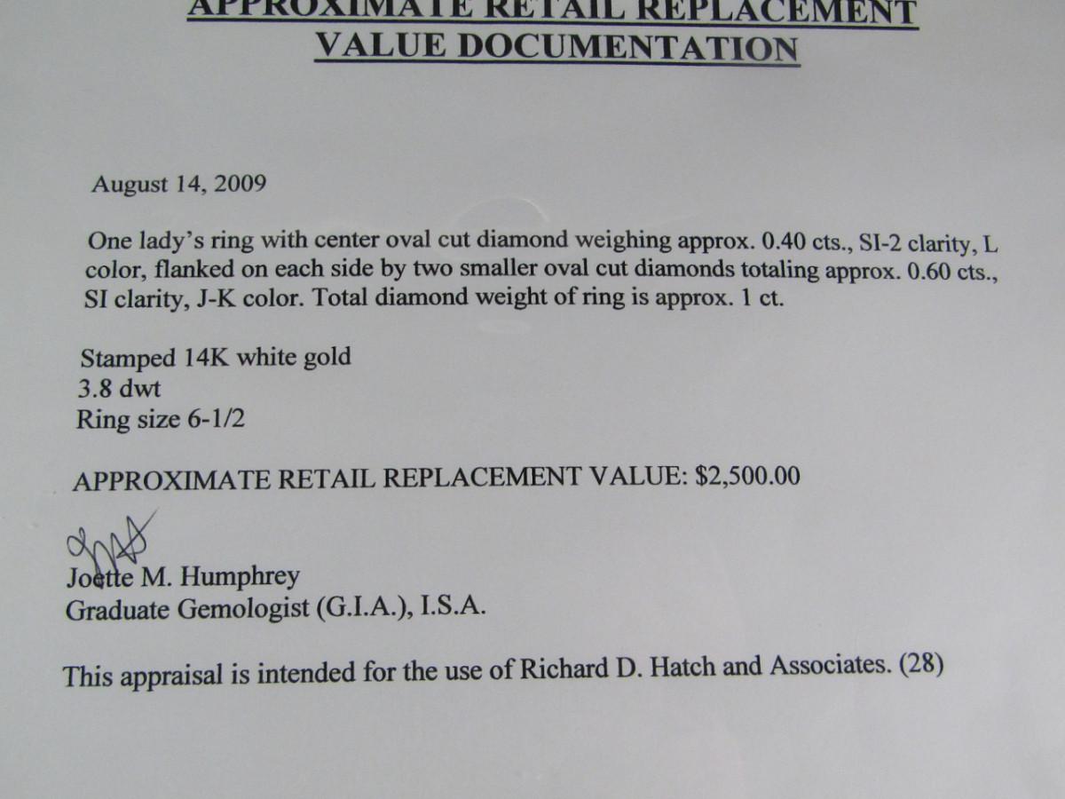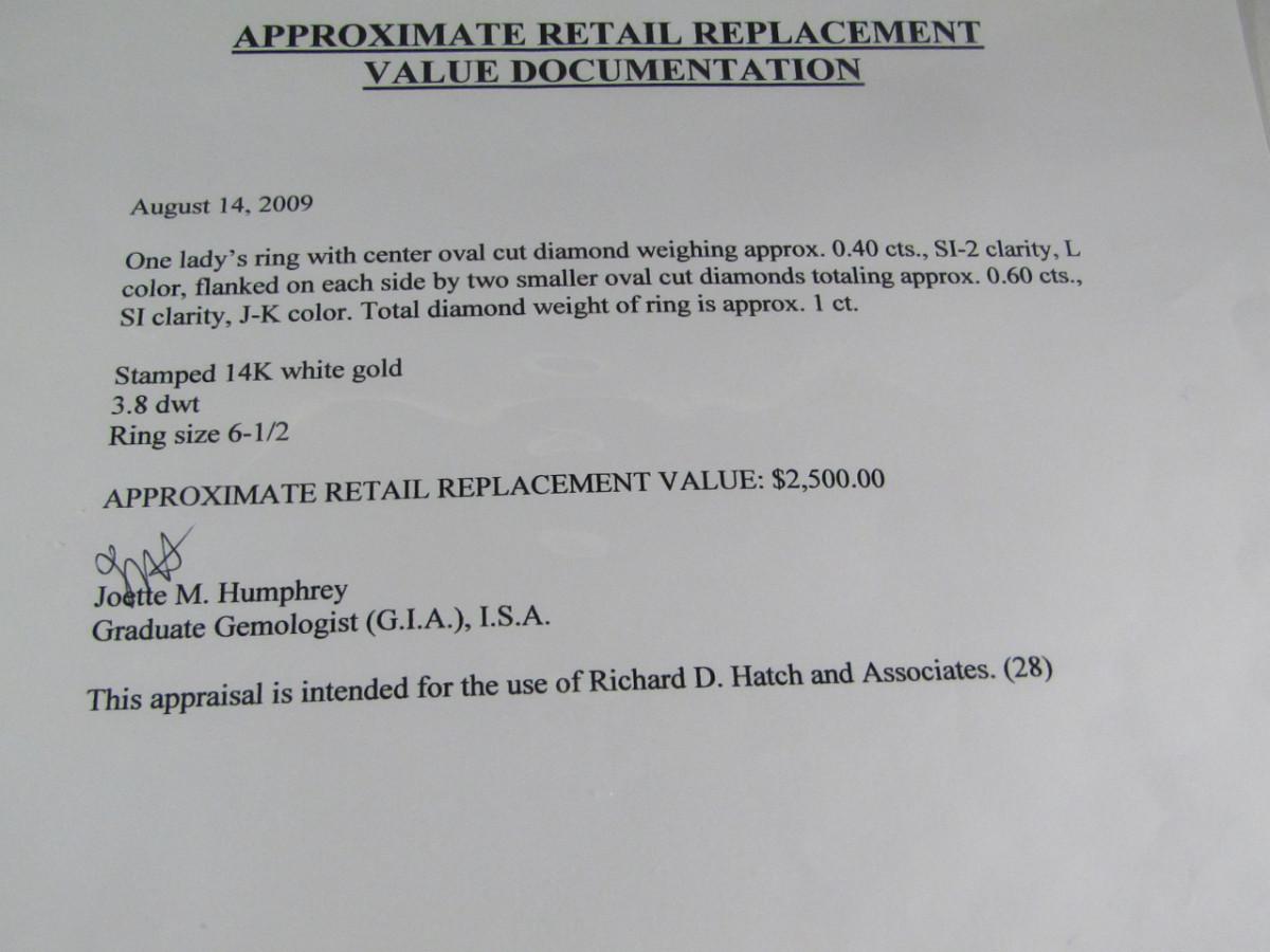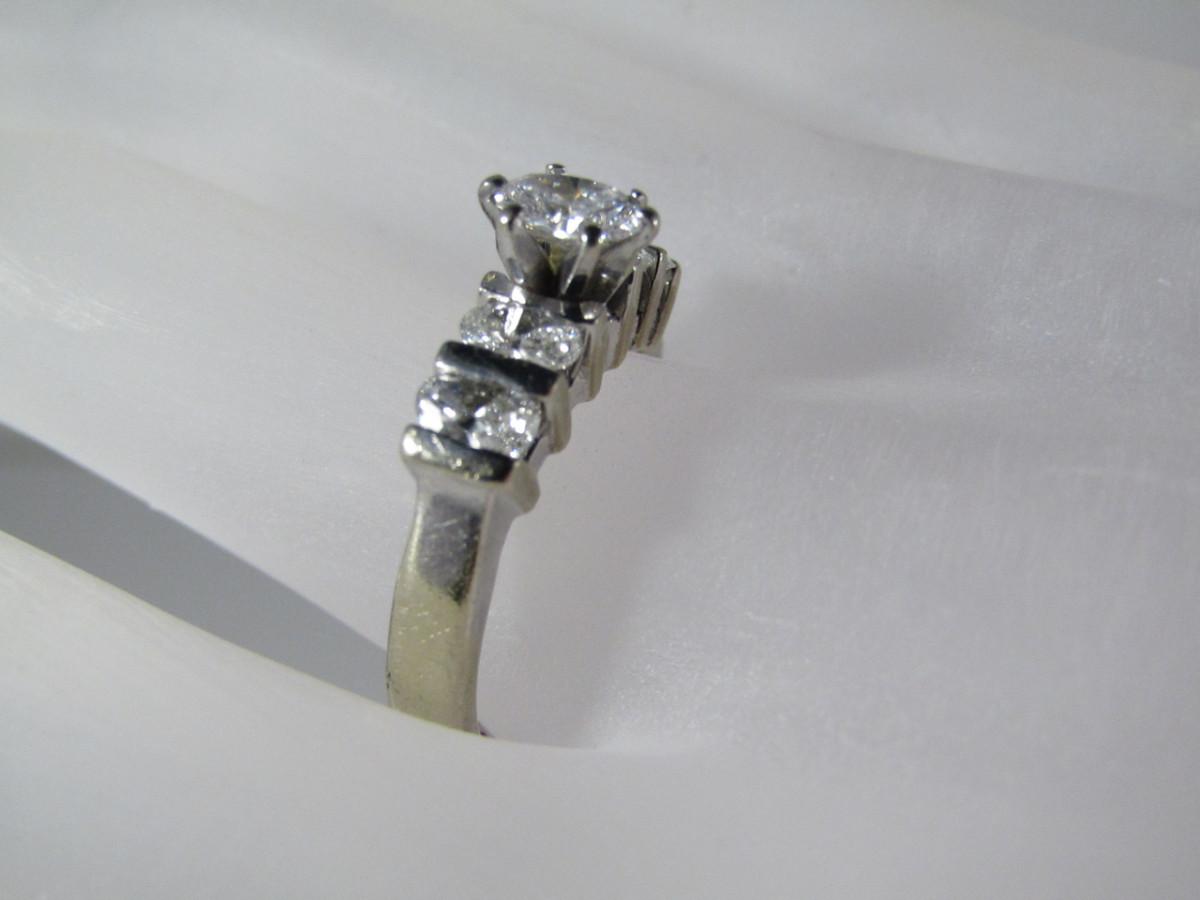 14 Kt White Gold Diamond Ring- Size 6 1/2- Approx Weight 3.8 dwt (#31). Please see attached assessment for information regarding stone quality and weight.