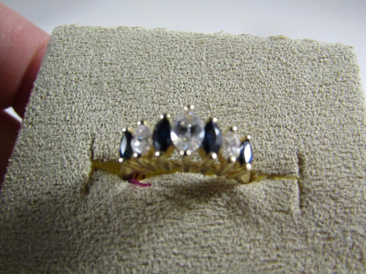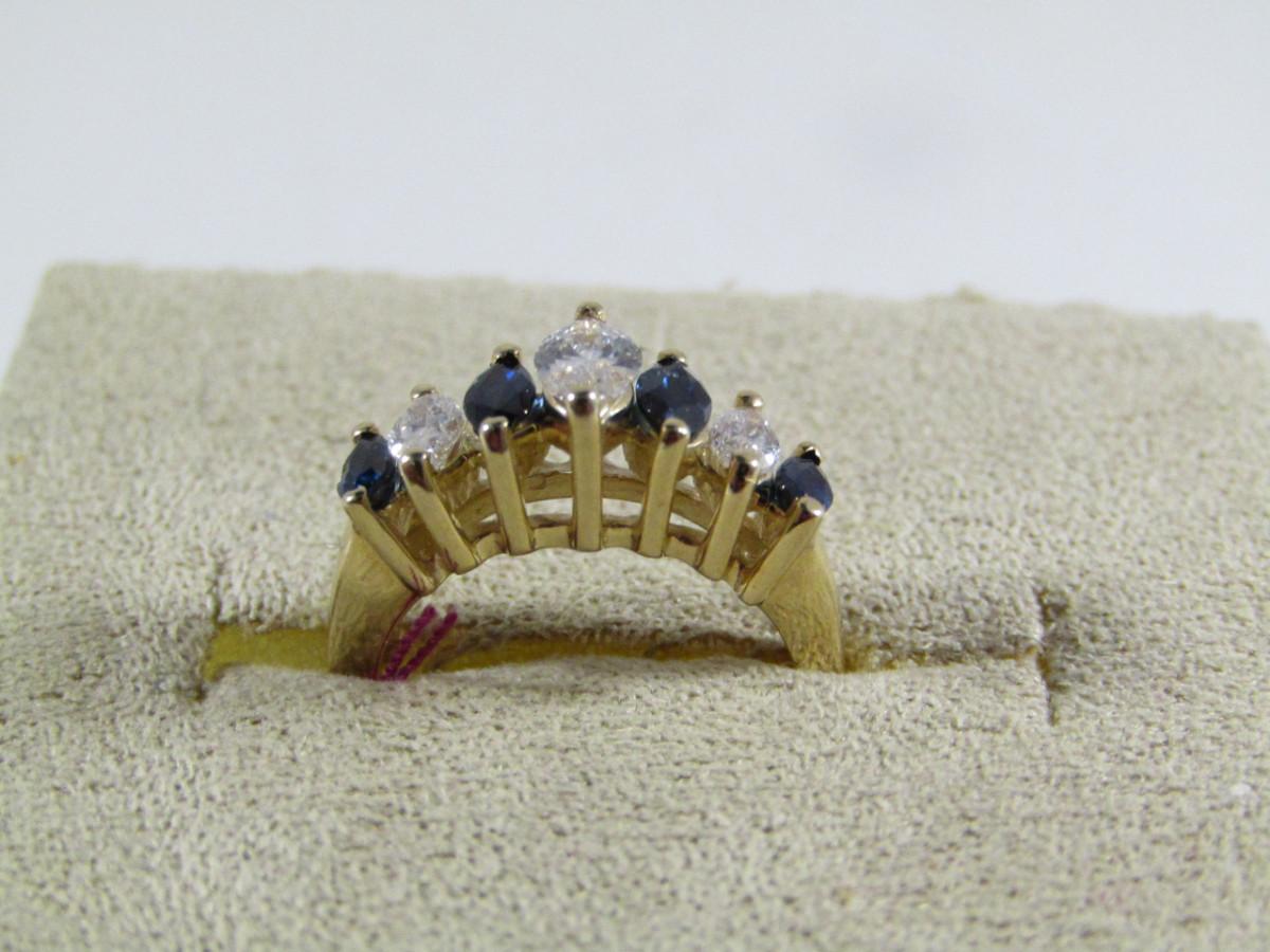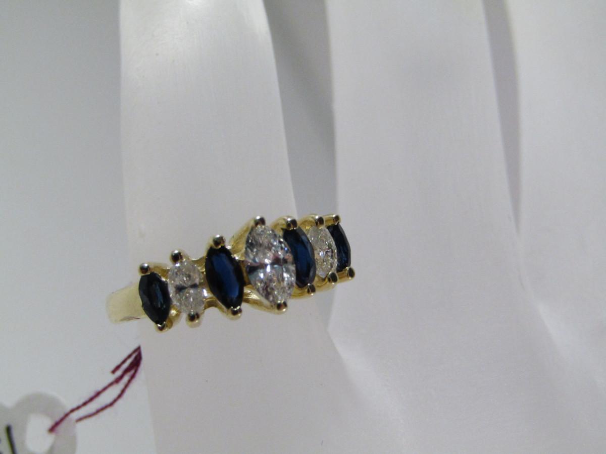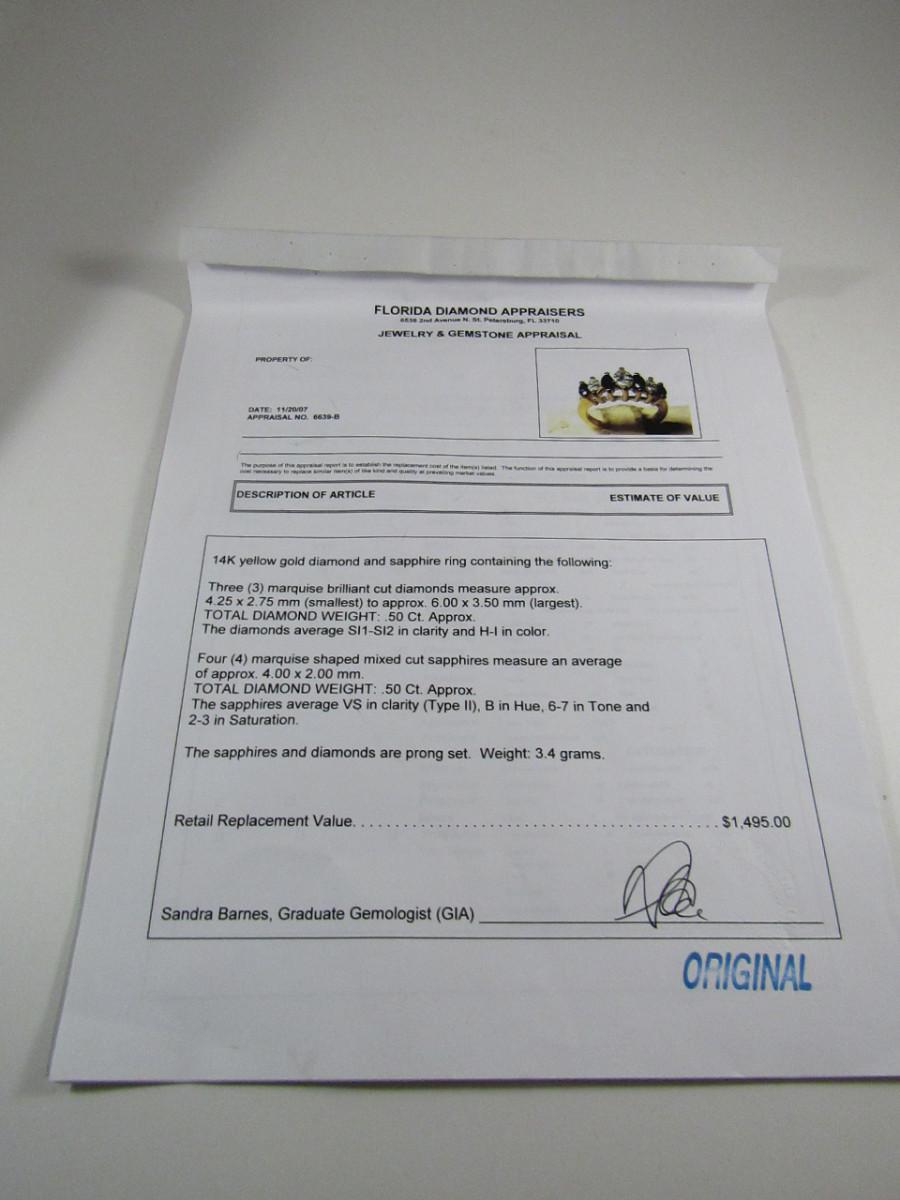 14 Kt Yellow Gold Sapphire and Diamond Ring- Size 3- Approx Weight 3.4 Grams (#20). Three marquise cut diamonds that total approx .50 carat- average clarity: SI1-SI2, color is H-I. Four marquise cut sapphires that total approx .50 carat- they average VS in clarity, B in Hue, 6-7 in Tone, and 2-3 in Saturation.
