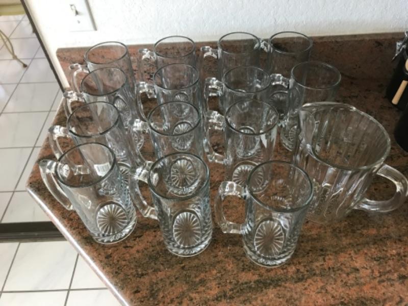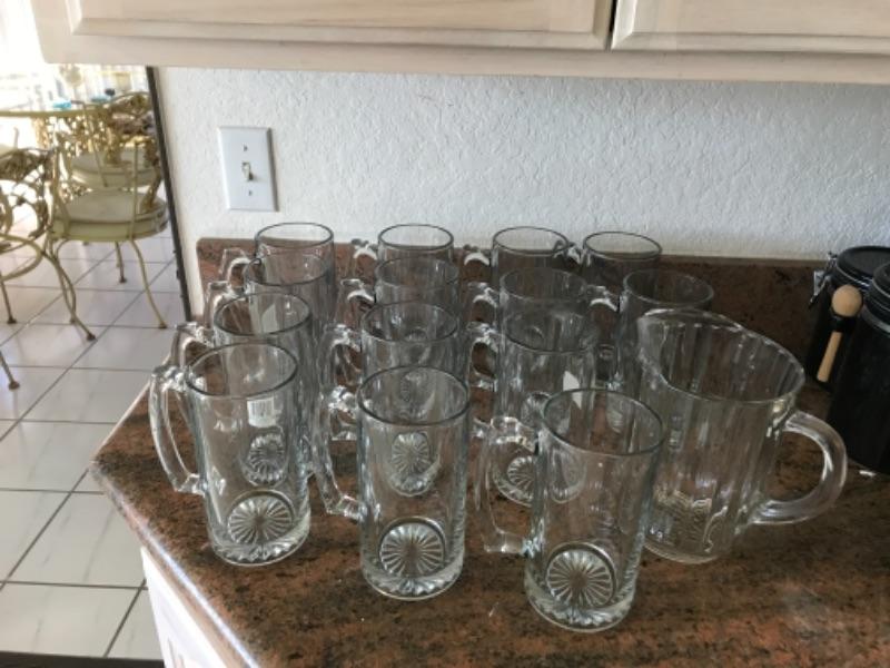 14 large glass beer mugs with handles and one glass pitcher with handles YD#022-0083