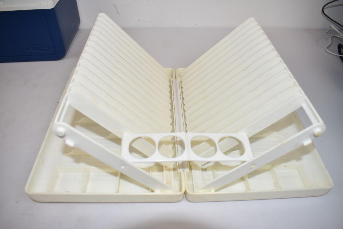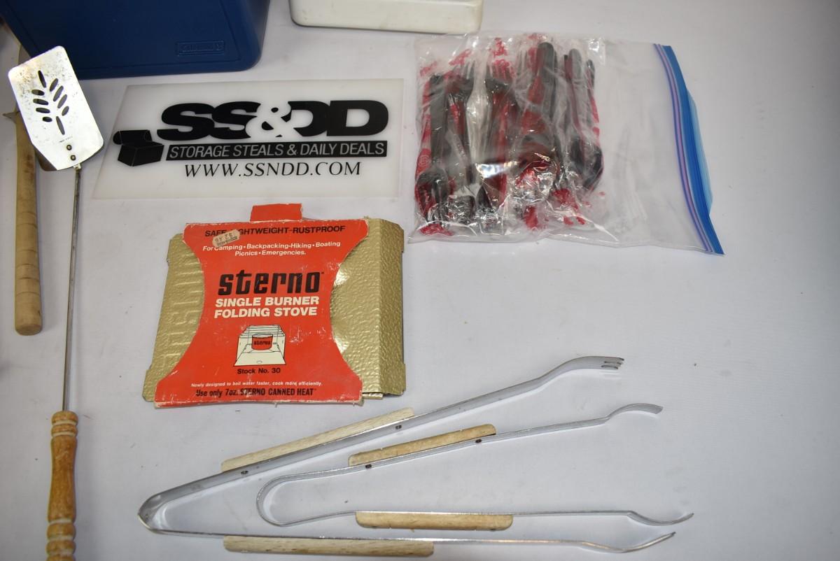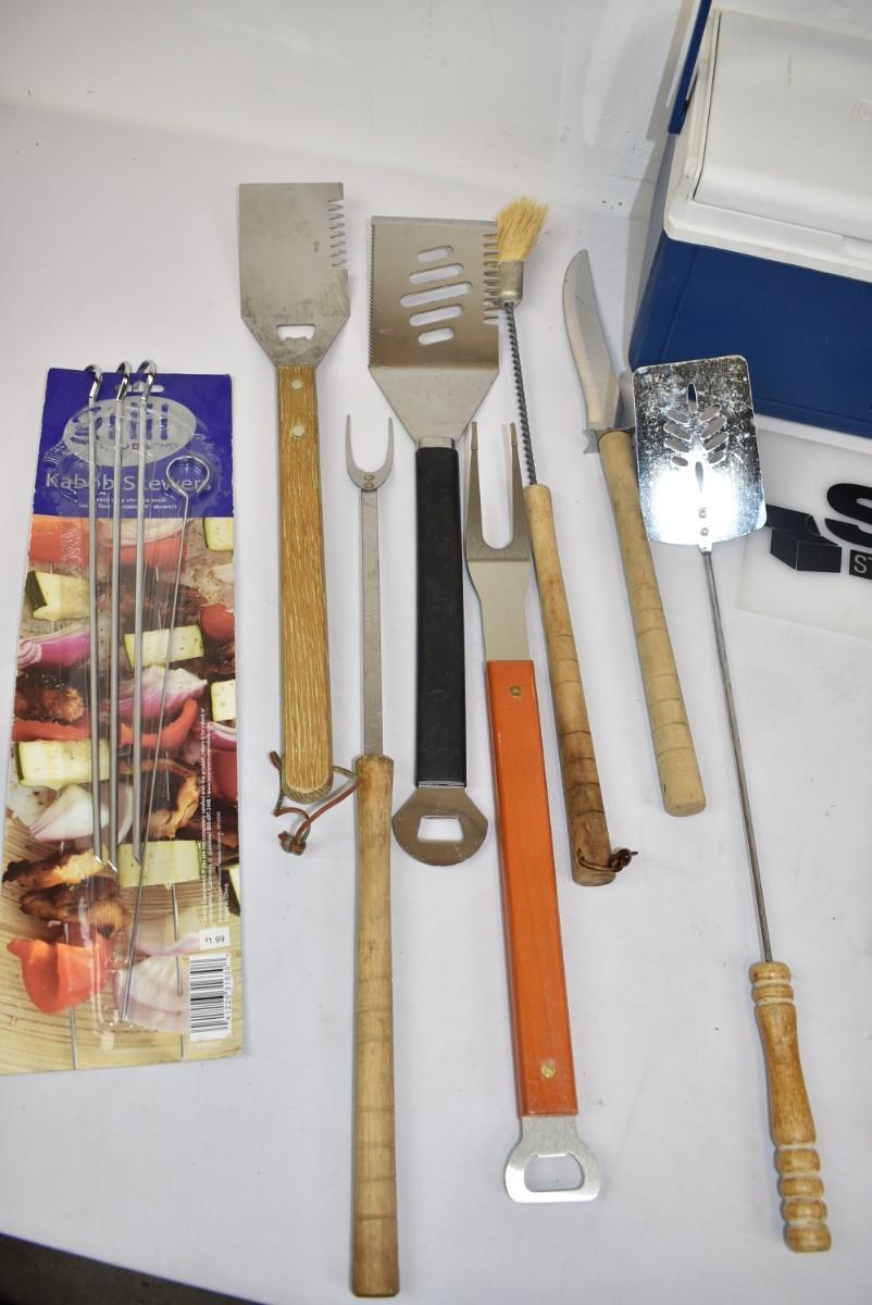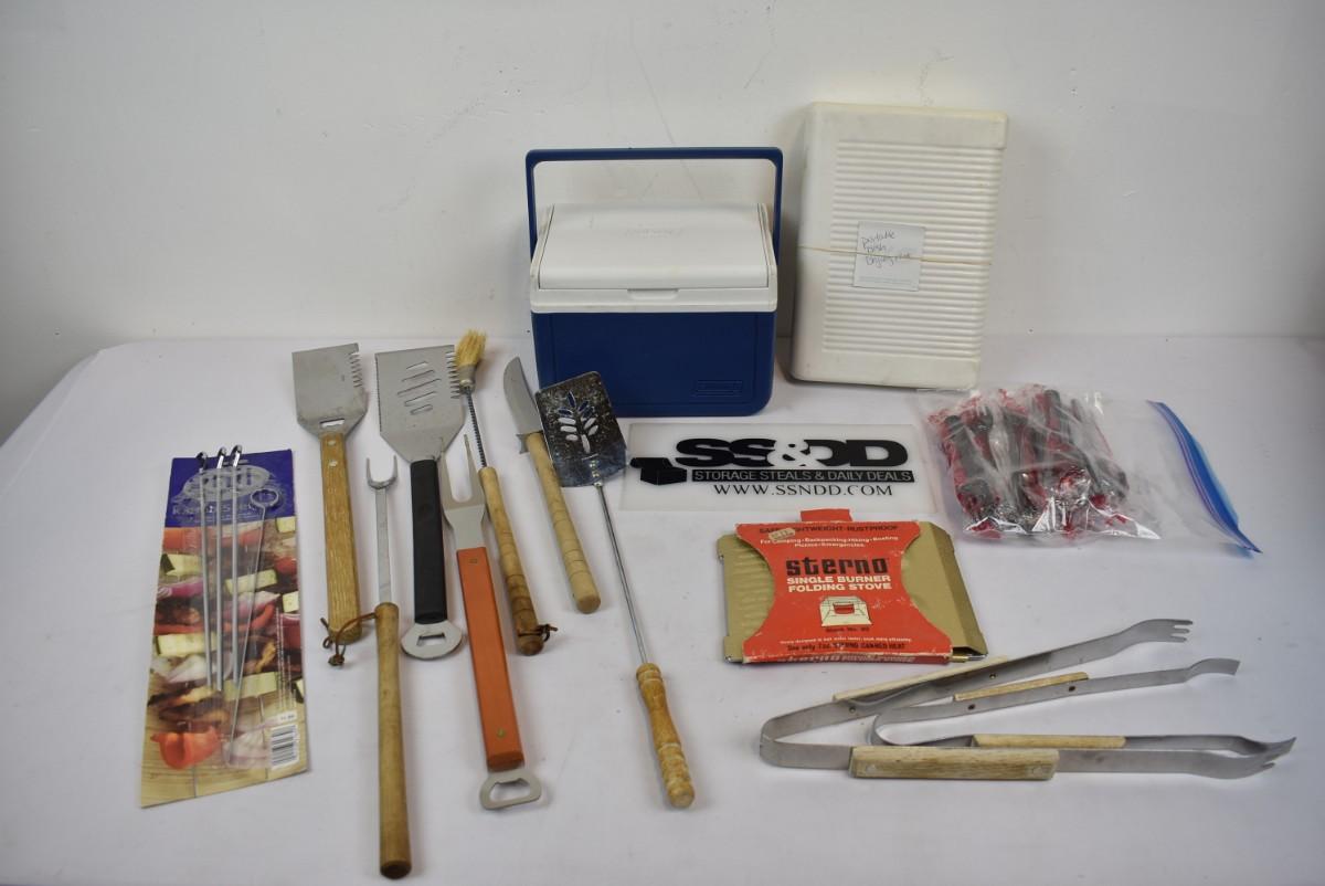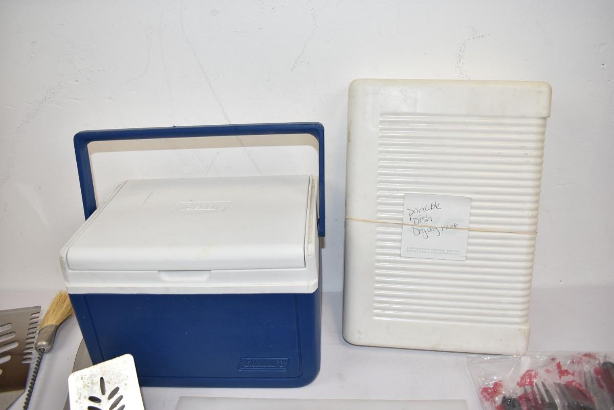 14+ pc Camping/Outdoor Eating/Grill/BBQ: Small Cooler, Portable Dish Rack, Grill Utensils, etc