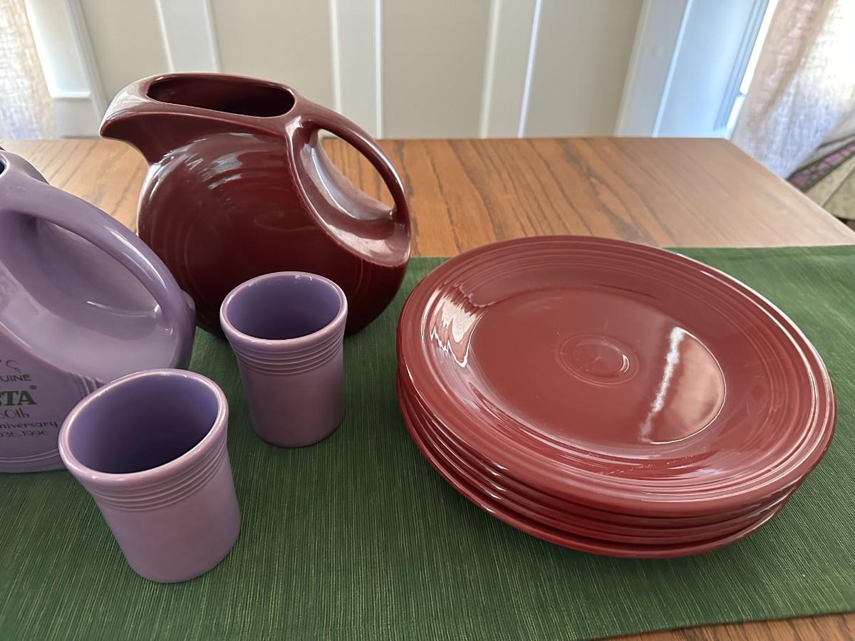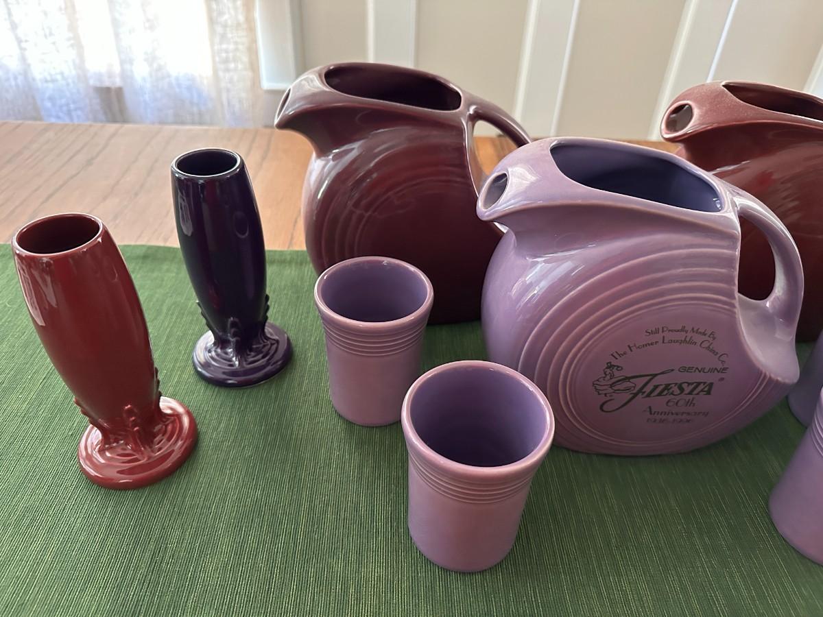 1 Lilac 60th Anniverary Pitcher w/ 4 Lilac Cups, 1 Purple Pitcher, 1 Maroon Pitcher, 1 Maroon & 1 Purple Bud Vase, 5 Maroon Dinner Plates