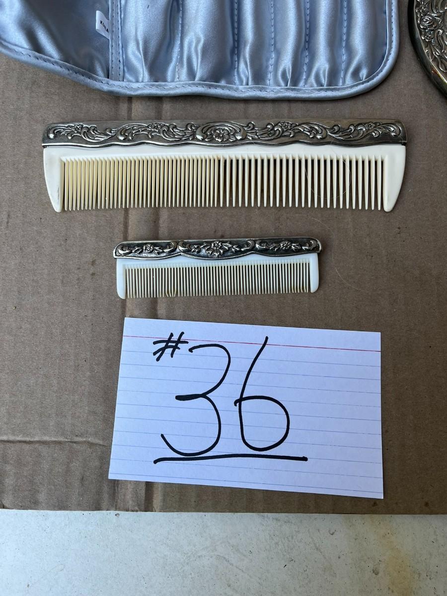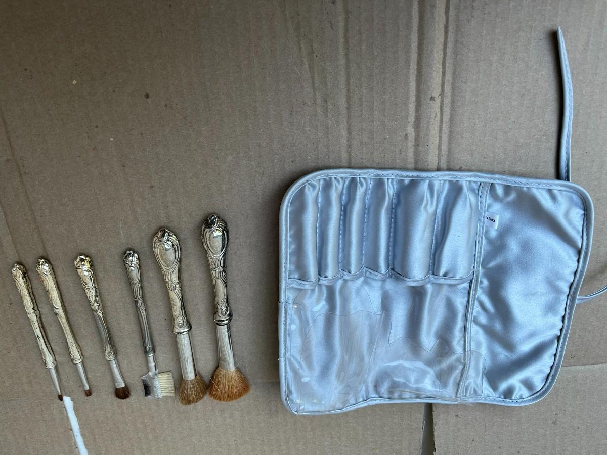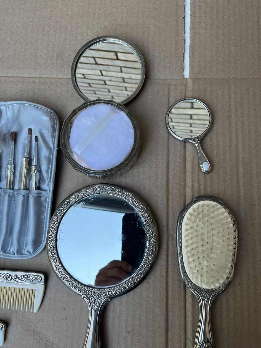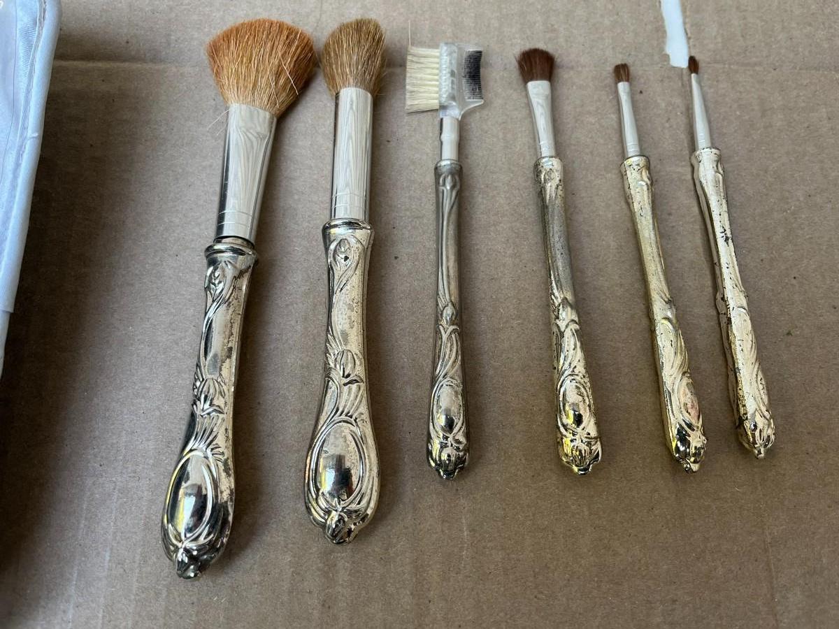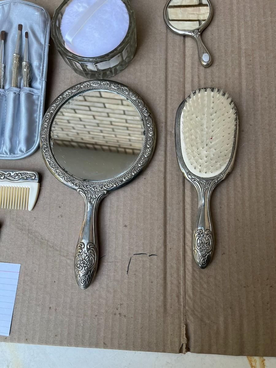 6 Brushes in a Case, 2 Handled Mirrors, 2 Combs, 1 Powder Container