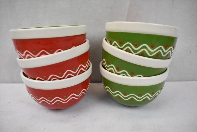 14 pc Holiday Dinnerware: 6 Bowls, 6 glasses, Creamer, Salt Shaker