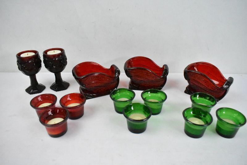 14 Piece Votive & Tea Light Candle Holders: 3 Red Sleds are Plastic and Everything Else is Glass