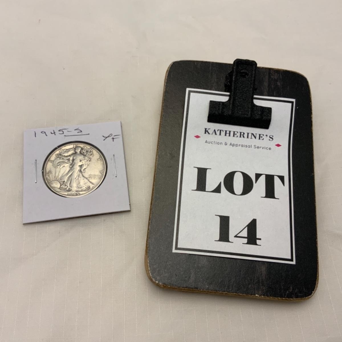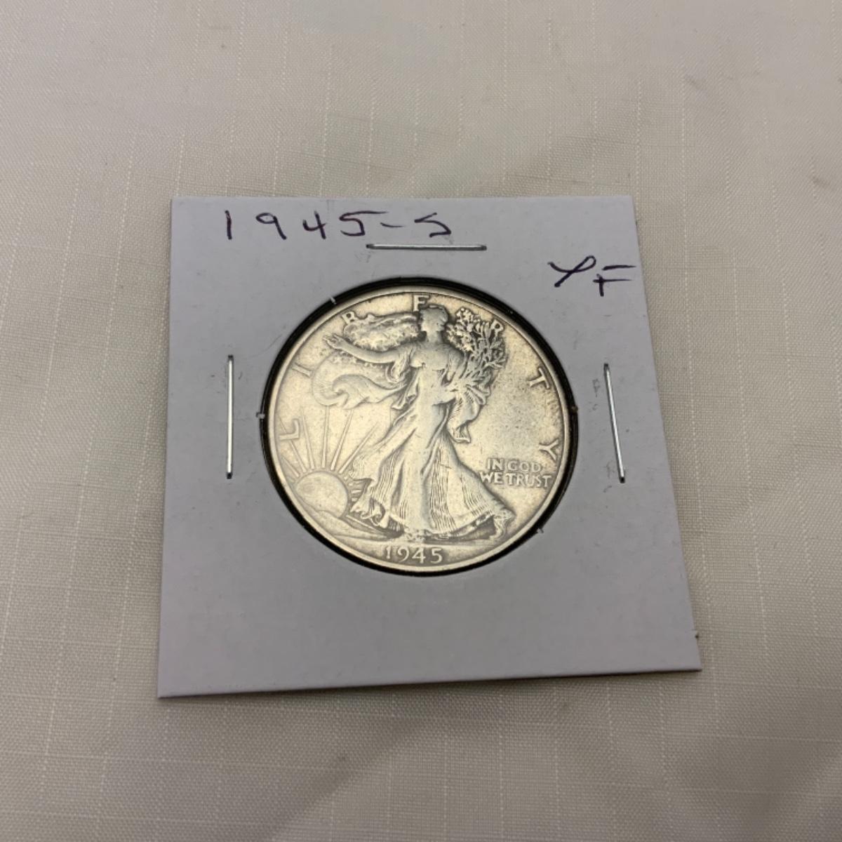 1945 S Walking Liberty Half Dollar. XF. Silver content is 90%. Please see photos for details and condition. ::: Shipping is available on this lot. If you require shipping you must let us know at the close of the auction. We will coordinate with you after the item has been won. Shipping fees will include insurance up to or exceeding the value of all items being mailed. If you have any questions regarding this lot please contact the auctioneer either via this website, by direct email or by phone. PICK UP TIMES and other important information can be found in the TERMS and DESCRIPTION of the auction. Please take a look for pertinent information. Thanks!