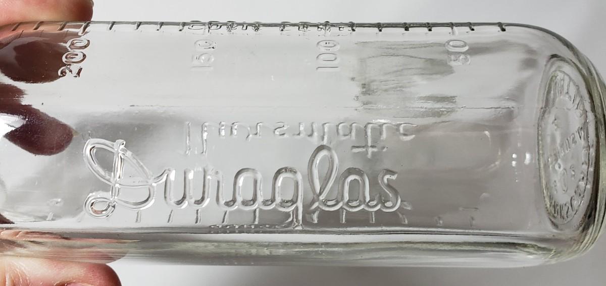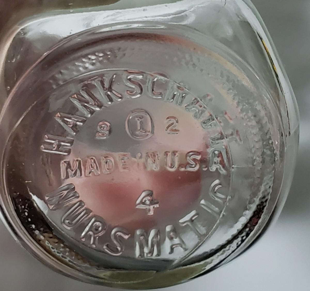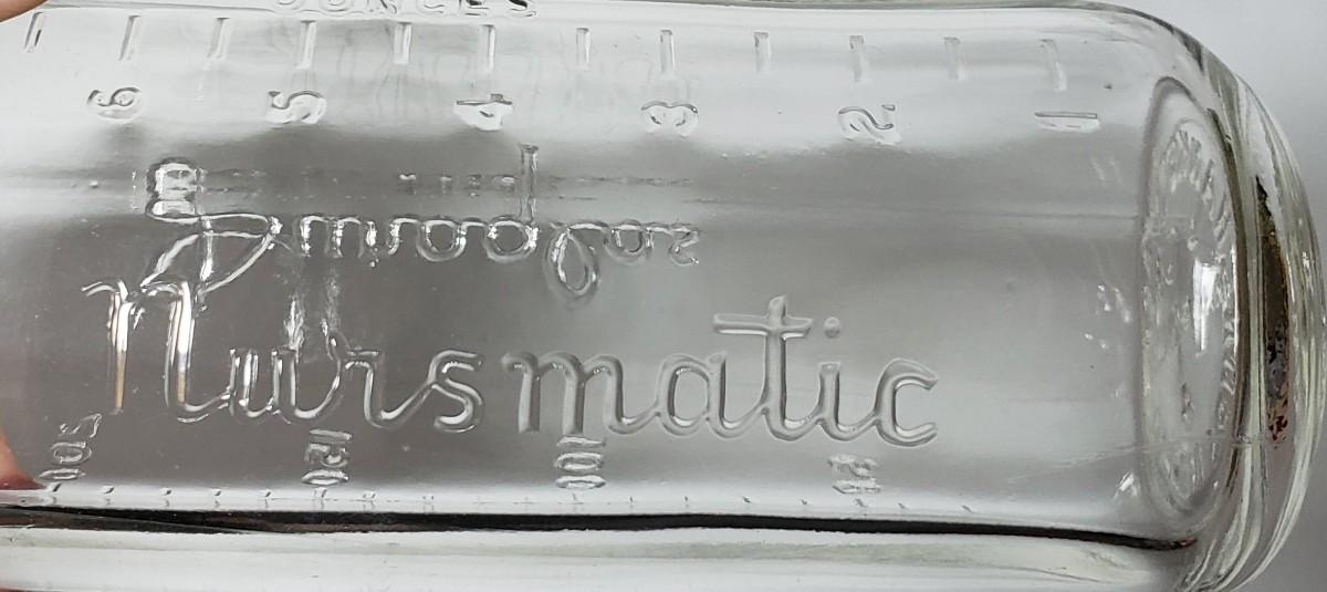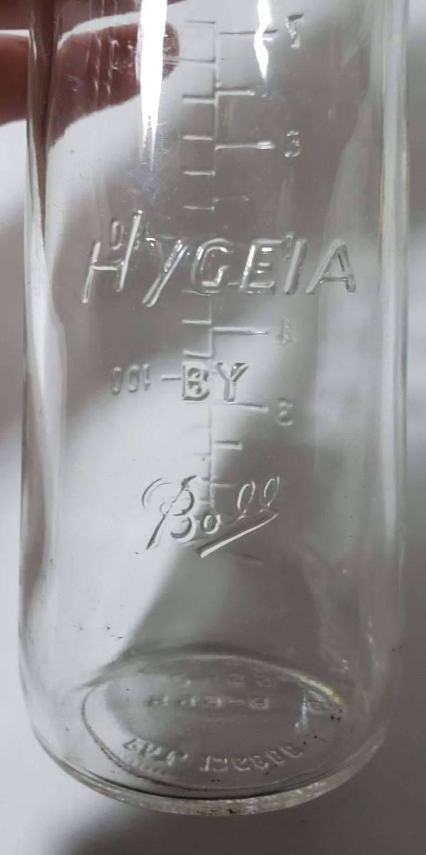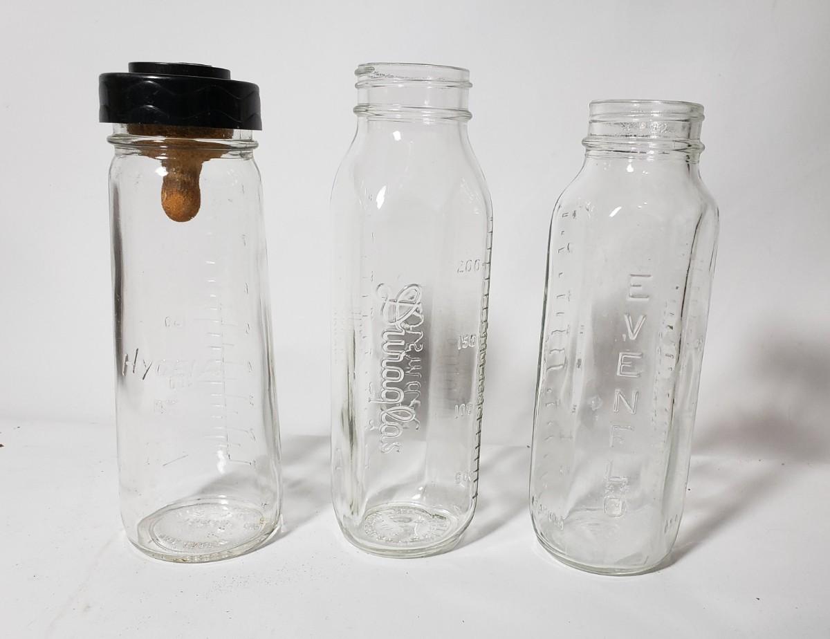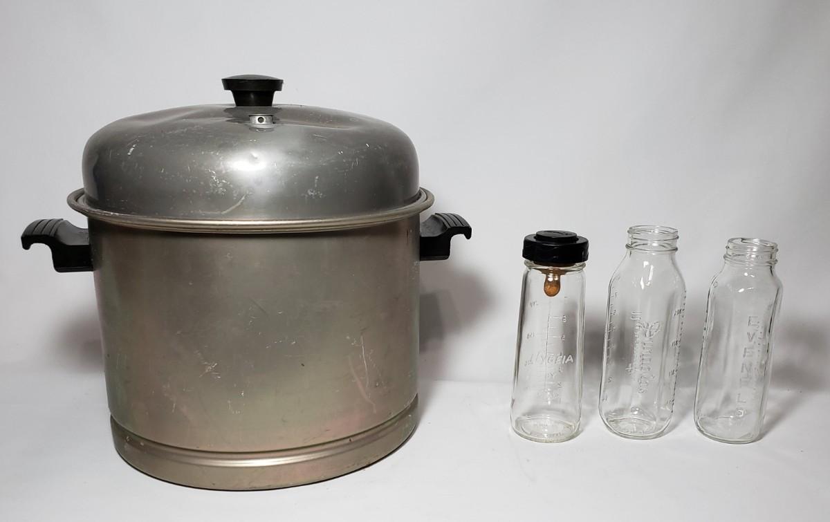 Sterilizing pot with bottle holder and 3 vintage glass bottles.