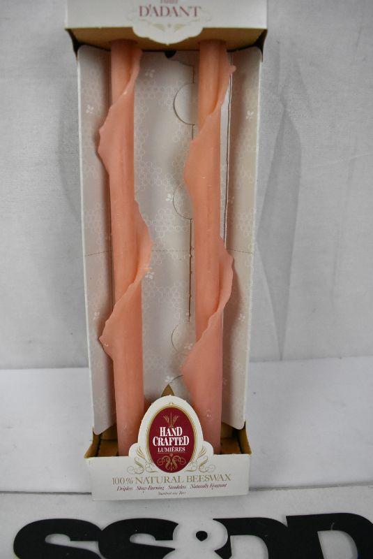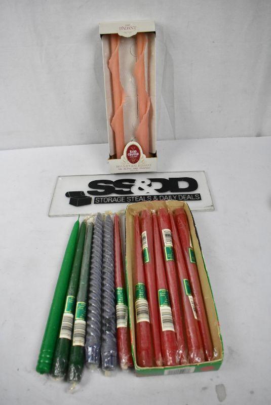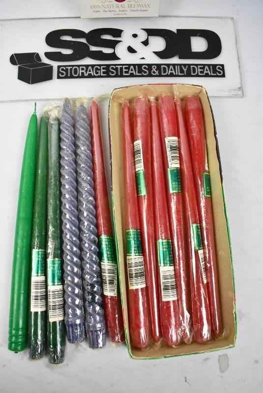 14 Taper Candles: 7 red, 3 green, 2 purple, 2 pink