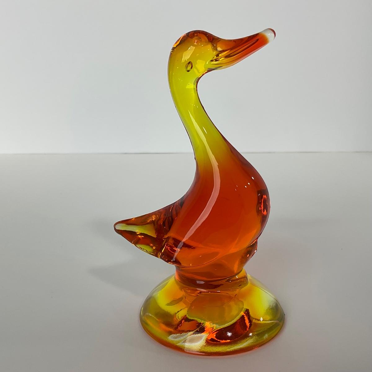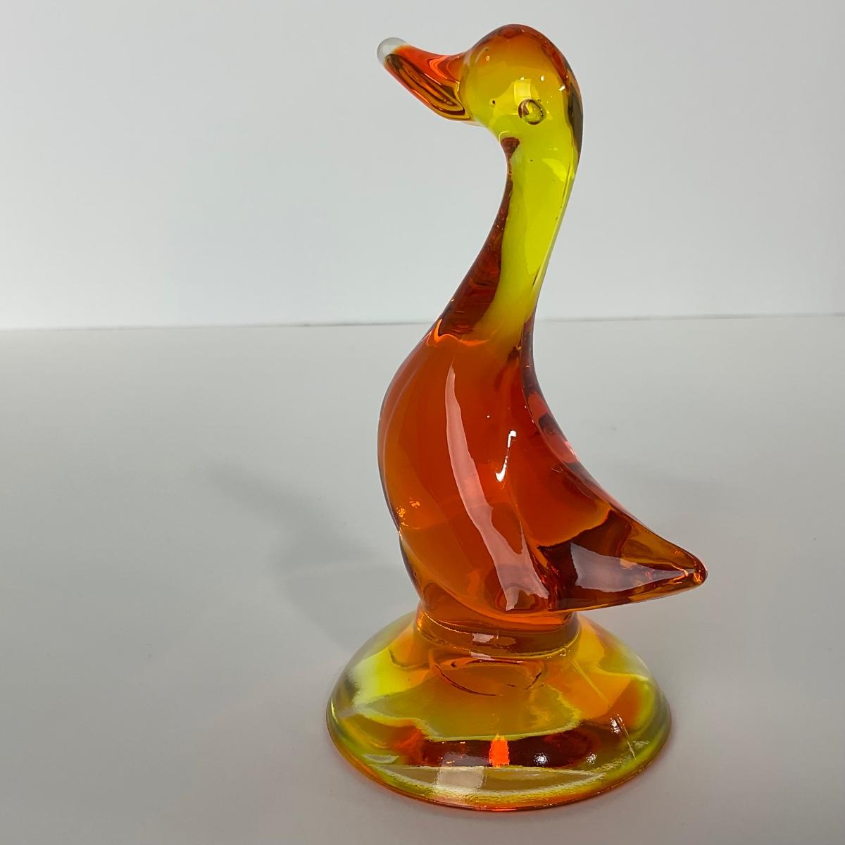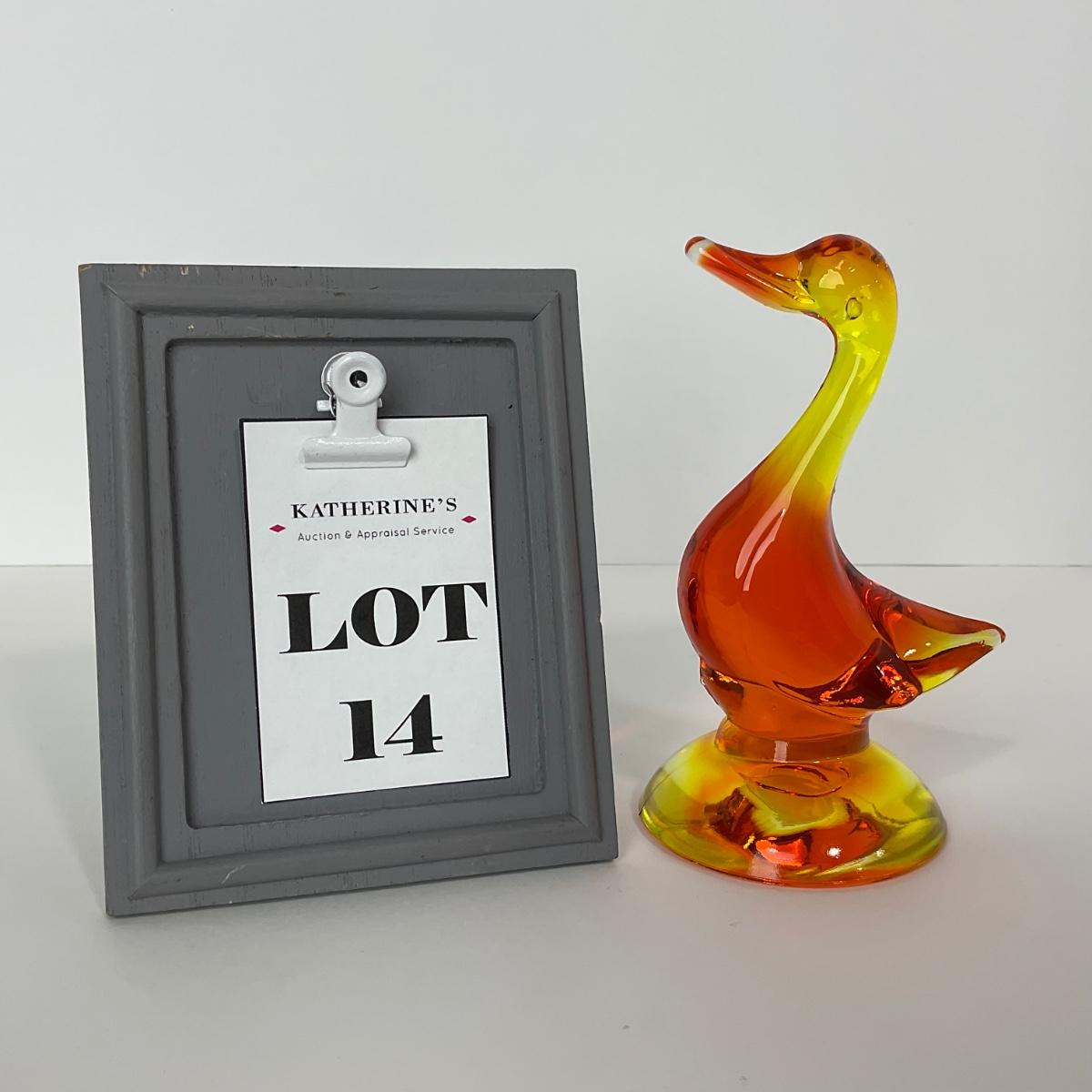 One Viking art glass Persimmon/Amberina Orange Epic duck figure. 5 1/4 inches tall. This piece has no damage, and appears to be in great shape with no visable chips, cracks, or broken pieces. Please see photos for details and condition. Any condition statement is given as a courtesy to a client, is an opinion, and should not be treated as a statement of fact. Reference to condition written, oral or within a condition report shall not be regarded as a full account of condition and may not include all defects, alterations, or restorations. Absence of a condition report does not imply a lot is flawless or lacking imperfections or damage. Katherine’s Auction & Appraisal Service shall have no responsibility for any error or omission. Returns shall not be accepted on the basis of condition. ::: Shipping is available on this lot. If you require shipping you must let us know at the close of the auction. We will coordinate with you after the item has been won. Shipping fees will include insurance up to or exceeding the value of all items being mailed. If you have any questions regarding this lot please contact the auctioneer either via this website, by direct email or by phone. PICK UP TIMES and other important information can be found in the TERMS and DESCRIPTION of the auction. Please take a look for pertinent information. Thanks!