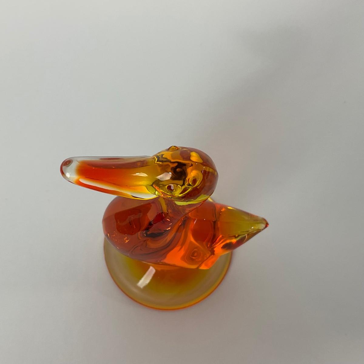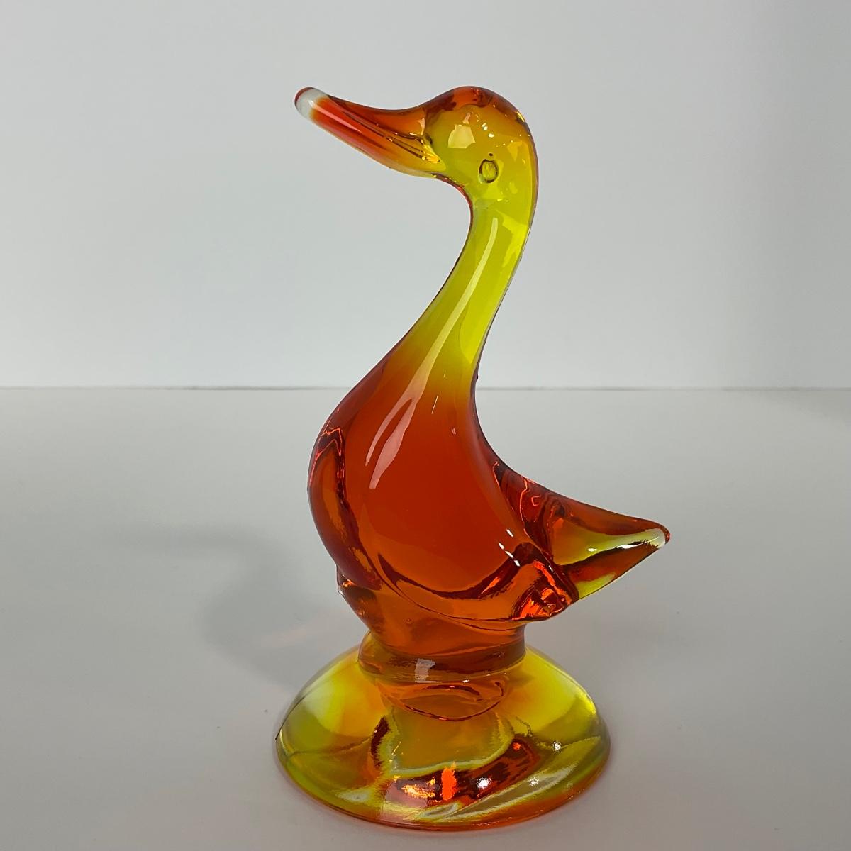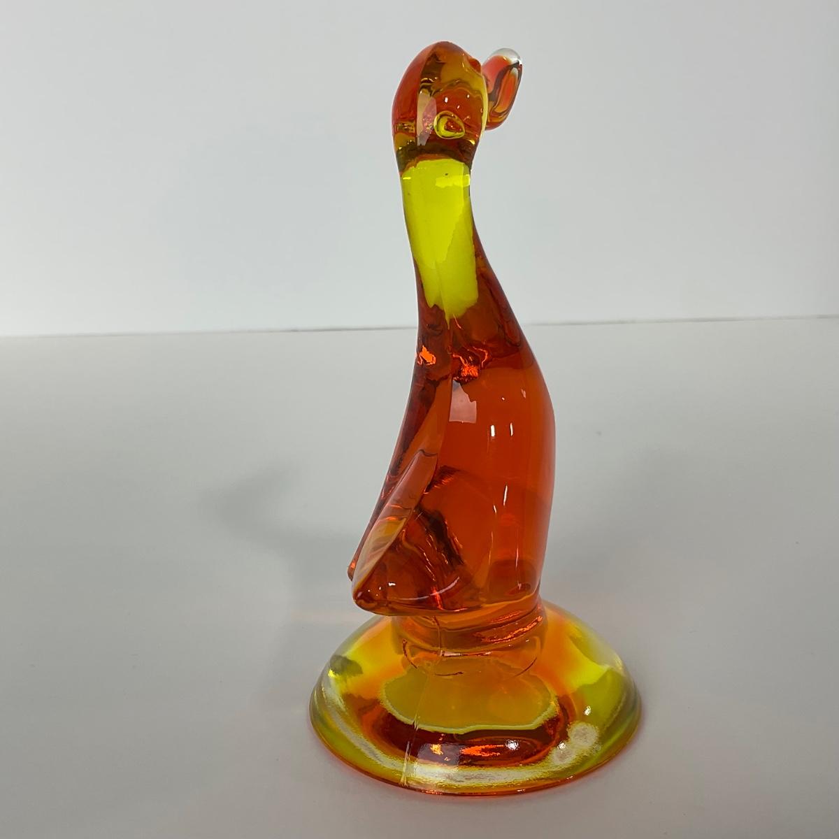 One Viking art glass Persimmon/Amberina Orange Epic duck figure. 5 1/4 inches tall. This piece has no damage, and appears to be in great shape with no visable chips, cracks, or broken pieces. Please see photos for details and condition. Any condition statement is given as a courtesy to a client, is an opinion, and should not be treated as a statement of fact. Reference to condition written, oral or within a condition report shall not be regarded as a full account of condition and may not include all defects, alterations, or restorations. Absence of a condition report does not imply a lot is flawless or lacking imperfections or damage. Katherine’s Auction & Appraisal Service shall have no responsibility for any error or omission. Returns shall not be accepted on the basis of condition. ::: Shipping is available on this lot. If you require shipping you must let us know at the close of the auction. We will coordinate with you after the item has been won. Shipping fees will include insurance up to or exceeding the value of all items being mailed. If you have any questions regarding this lot please contact the auctioneer either via this website, by direct email or by phone. PICK UP TIMES and other important information can be found in the TERMS and DESCRIPTION of the auction. Please take a look for pertinent information. Thanks!