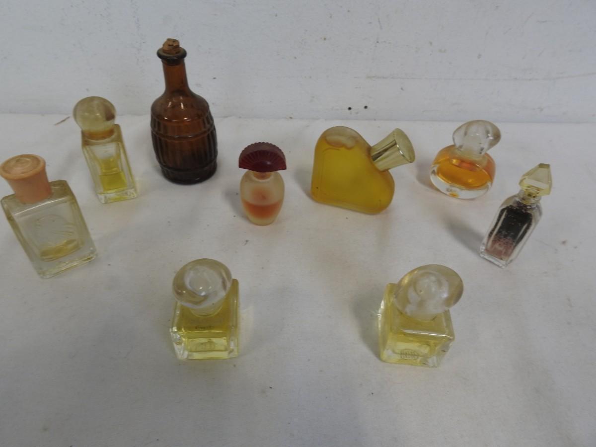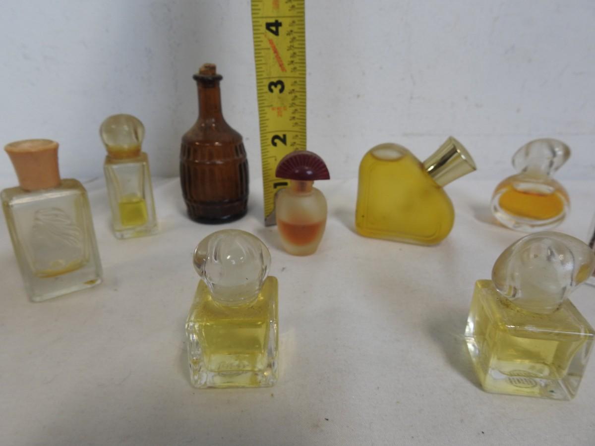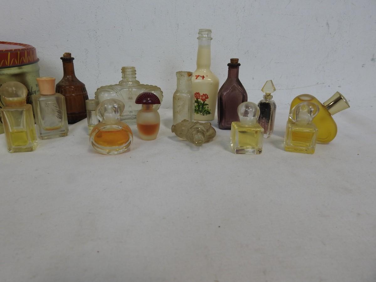 14 Vintage Bottles/Perfume & 1 Stopper: Various Sizes, Styles & Fragrances, Tin