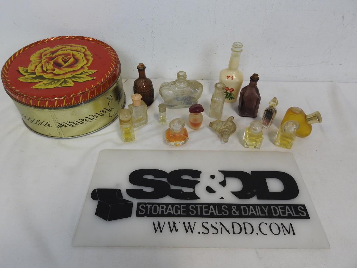 14 Vintage Bottles/Perfume & 1 Stopper: Various Sizes, Styles & Fragrances w/ Tin