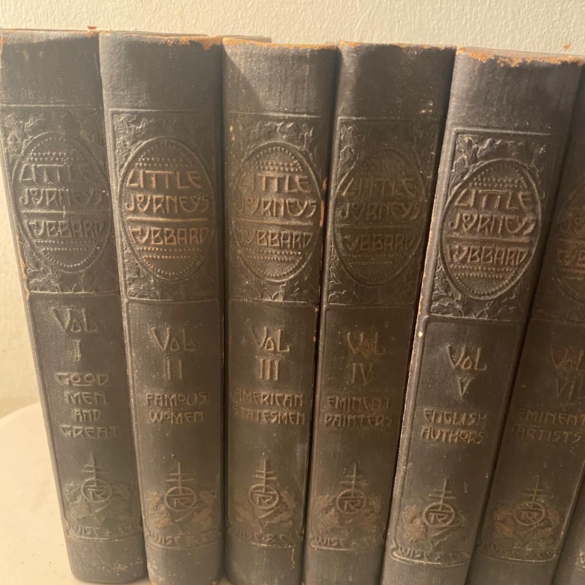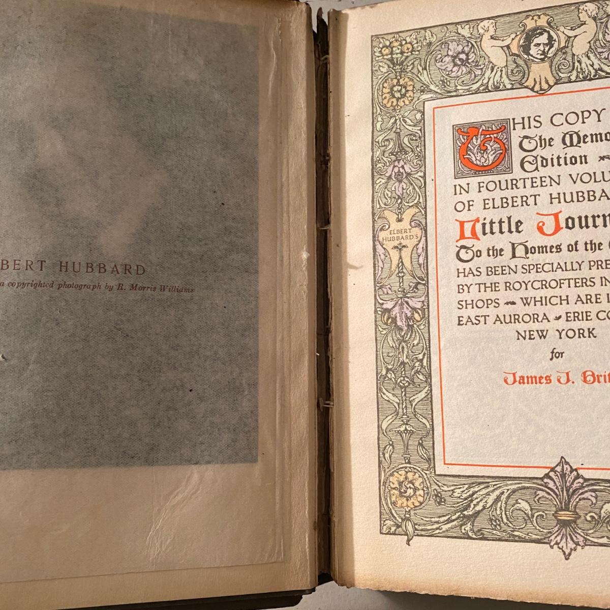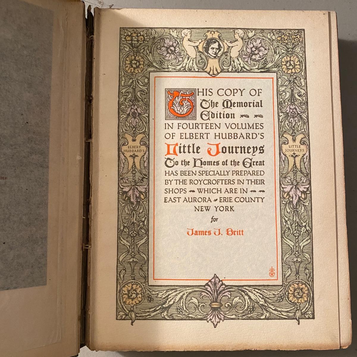 This Leather Bound set of Little Journeys by Elbert Hubbard was published in 1916 by The Roycrofters. It is a memorial edition. It appears to have been specially prepared in New York for James J. Britt. There is a special page in Volume one stating this and there are vintage book plates in the inside cover of each edition. It states there are 14 volumes, which there are 14 included here. A quick Wikipedia search states that Mr. Britt was a US Representative who passed away in Asheville in 1939. The first Volume has a split binding but the rest appear to be intact. Outside is worn with age. Shipping Available.