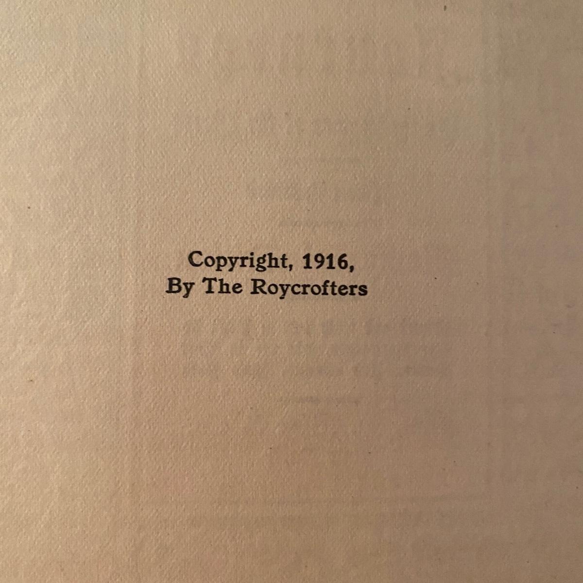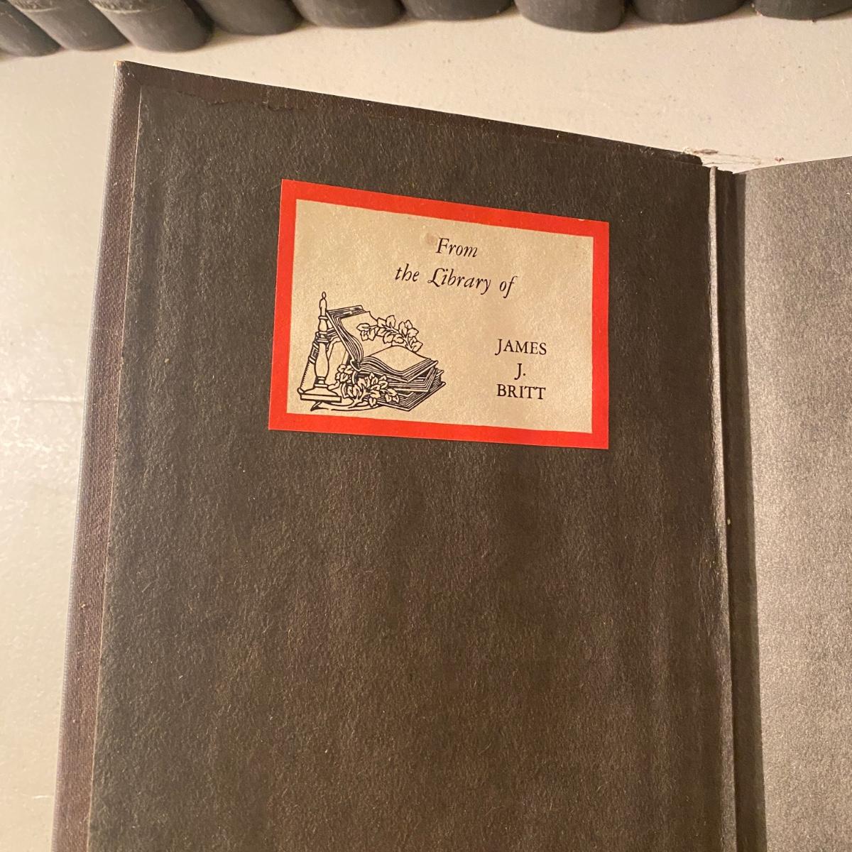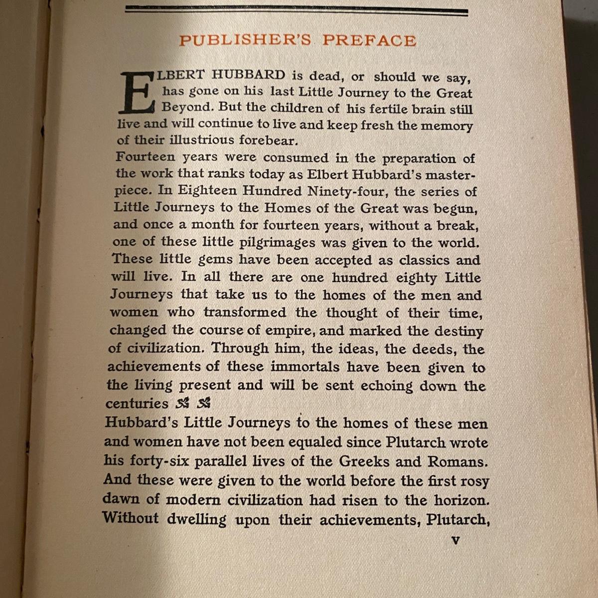 This Leather Bound set of Little Journeys by Elbert Hubbard was published in 1916 by The Roycrofters. It is a memorial edition. It appears to have been specially prepared in New York for James J. Britt. There is a special page in Volume one stating this and there are vintage book plates in the inside cover of each edition. It states there are 14 volumes, which there are 14 included here. A quick Wikipedia search states that Mr. Britt was a US Representative who passed away in Asheville in 1939. The first Volume has a split binding but the rest appear to be intact. Outside is worn with age. Shipping Available.