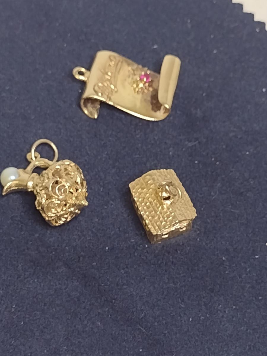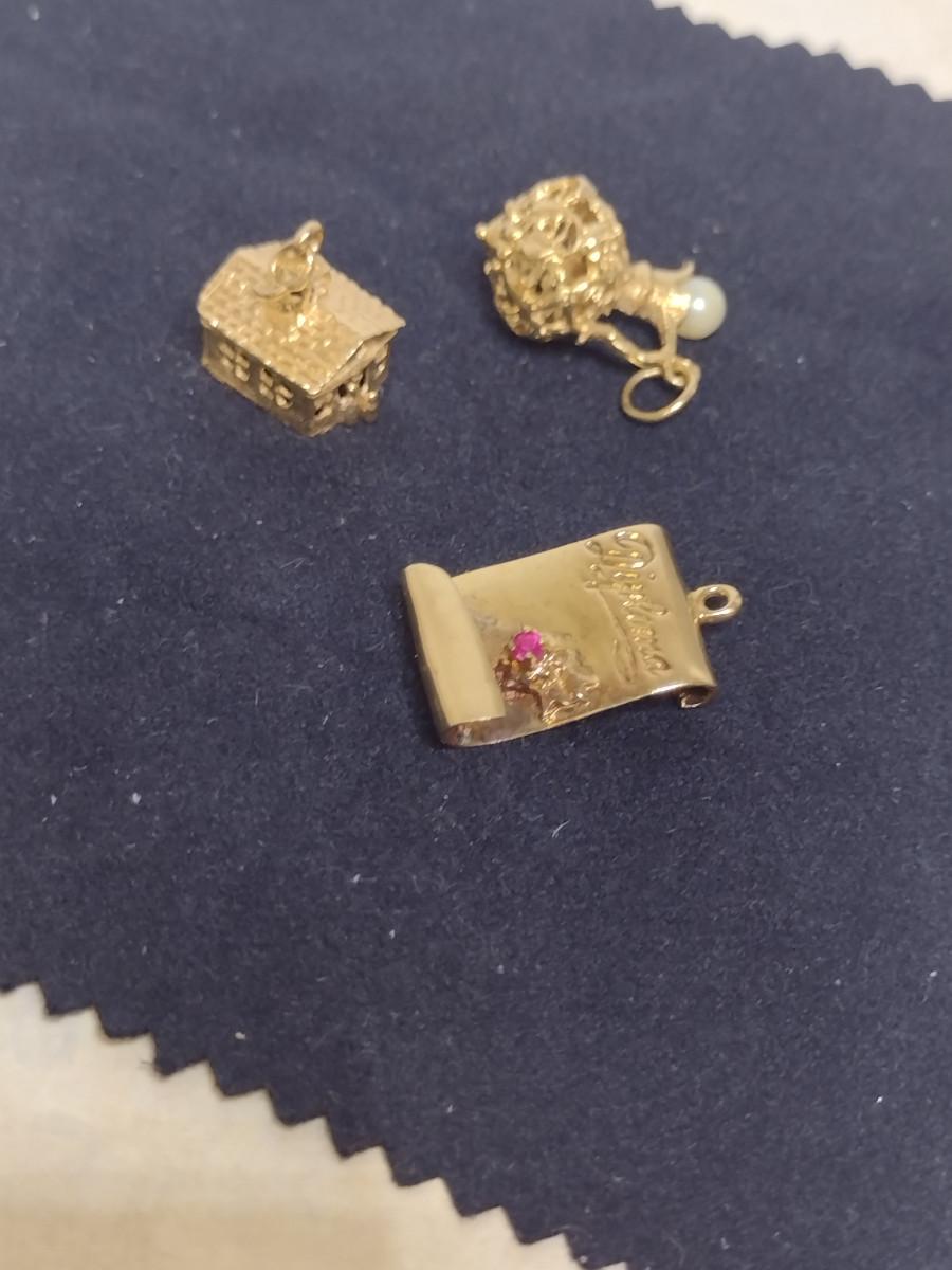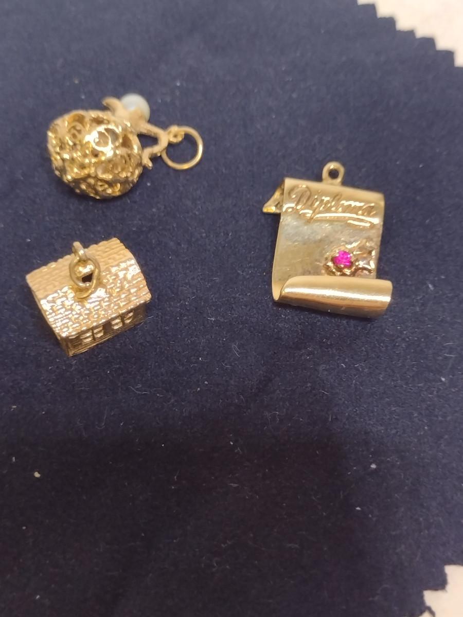 14 Yellow Gold Charms- Approx Total Weight 10.1 Grams (#61). Items acid test as 14 Karat. Diploma charm has gemstone (possibly ruby) and is monogrammed and dated. A 6.75% NC sales tax will be added to the jewelry invoice amount at the end of the sale. Coins are exempt from state sales tax.