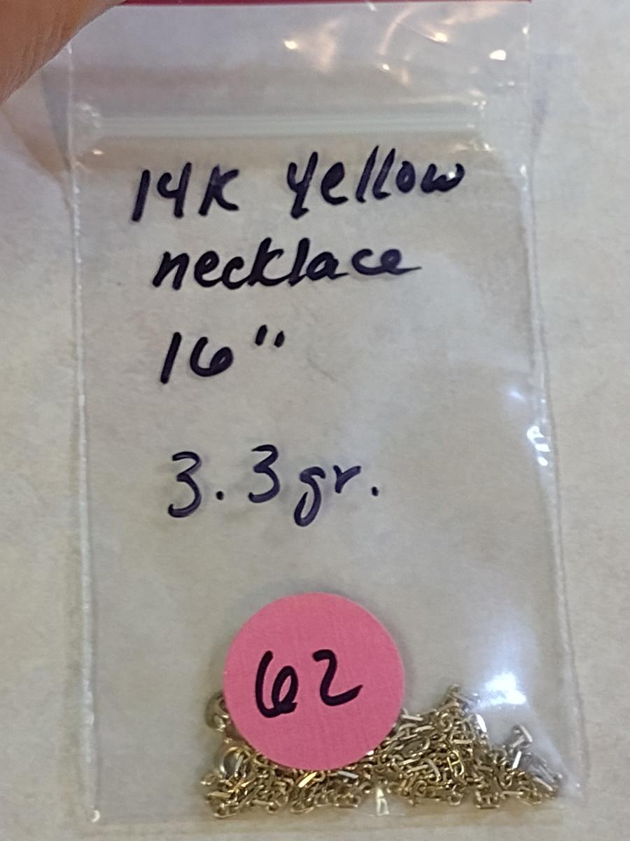 14 Yellow Gold Necklace- Approx 16" Long and Total Weight 3.3 Grams (#62). A 6.75% NC sales tax will be added to the jewelry invoice amount at the end of the sale. Coins are exempt from state sales tax.