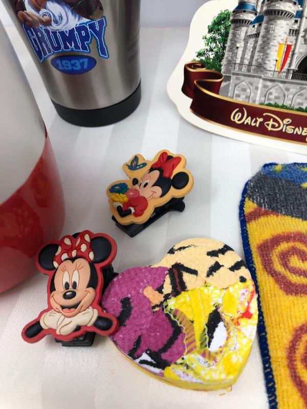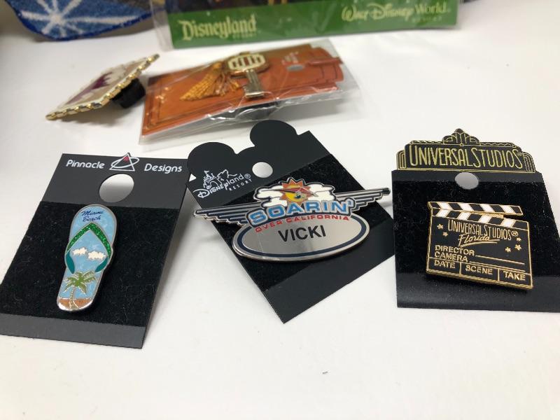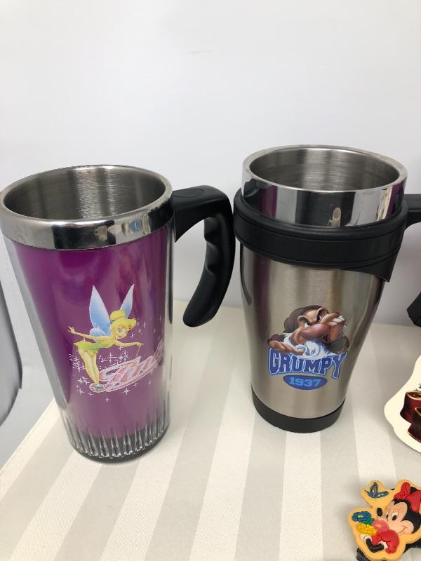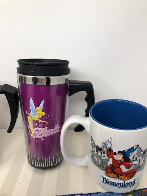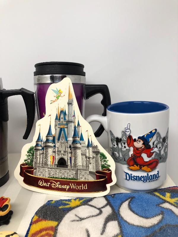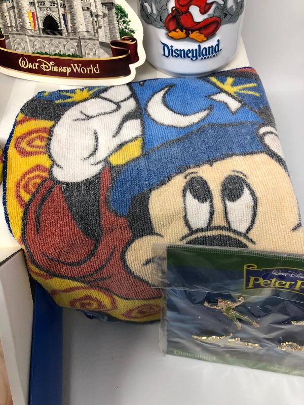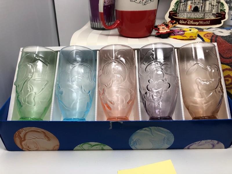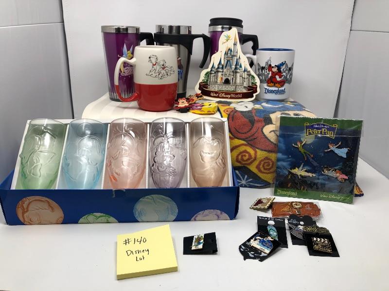 5 Disney glass Drinking glasses. Souvenir Pins, Mugs, Mickey washcloth and some other trinkets.