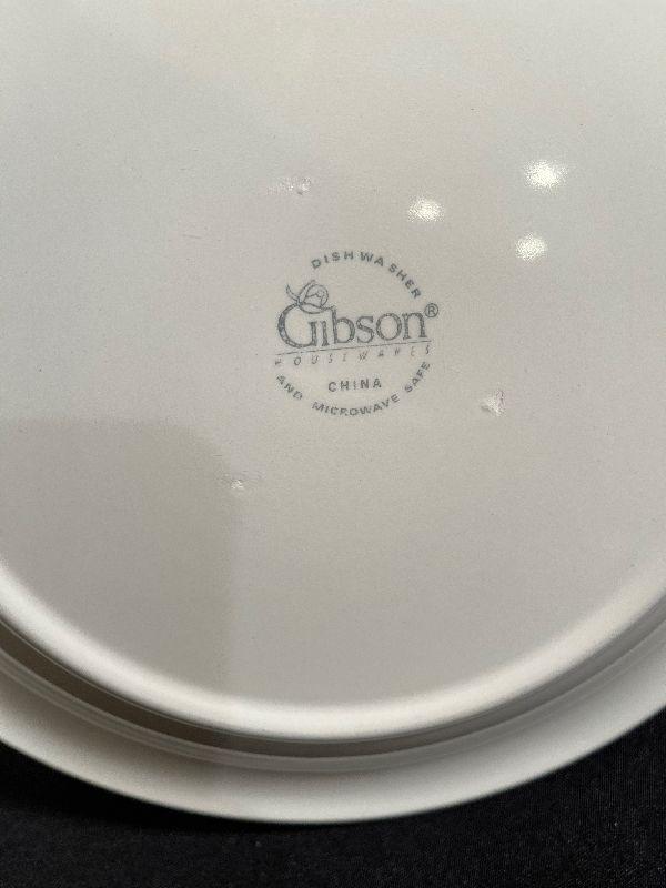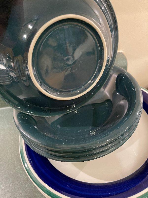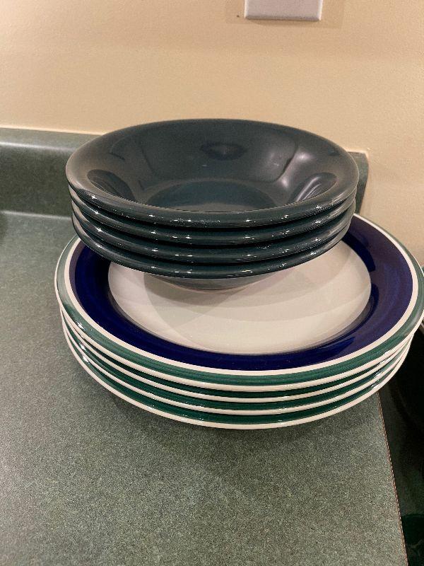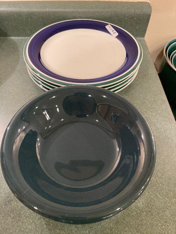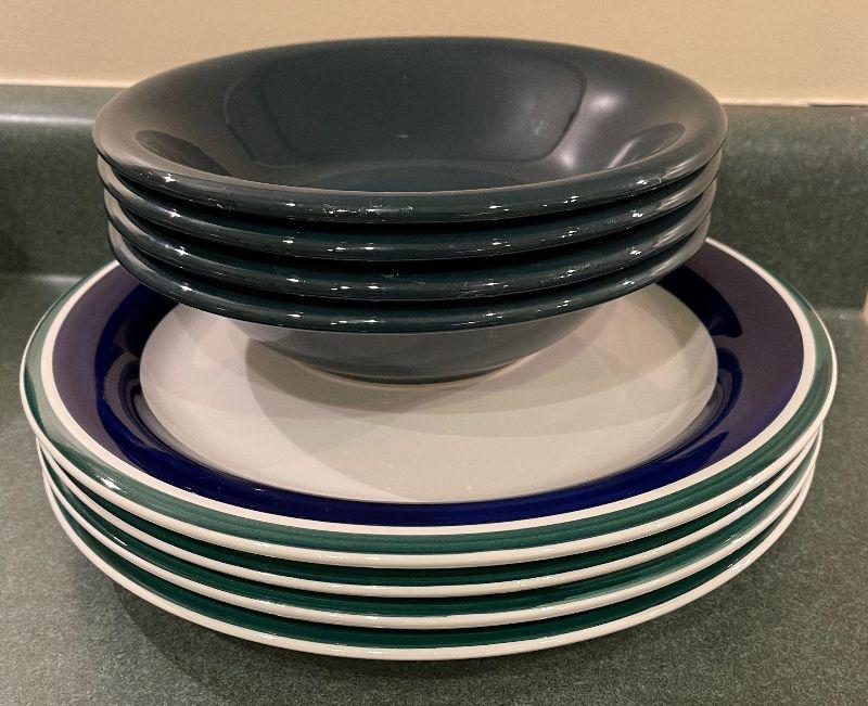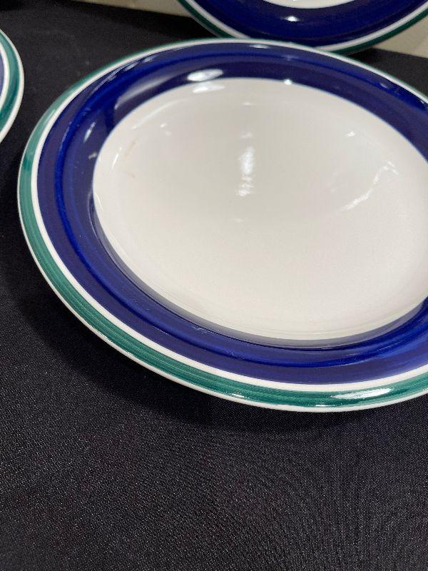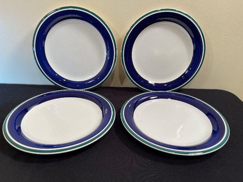 #140 4 Gibson Blue and Green Rimmed Dinner Plates and bowls