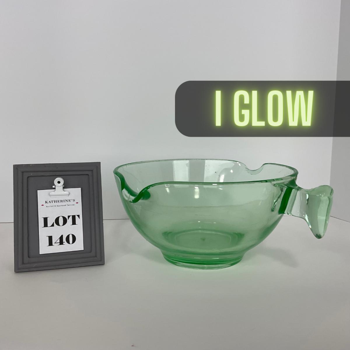 One large green batter bowl with some wear. I am Uranium glass so I DO GLOW under blacklight. Please see photos for details and condition. ::: Shipping is available on this lot. If you require shipping you must let us know at the close of the auction. We will coordinate with you after the item has been won. Shipping fees will include insurance up to or exceeding the value of all items being mailed. If you have any questions regarding this lot please contact the auctioneer either via this website, by direct email or by phone. PICK UP TIMES and other important information can be found in the TERMS and DESCRIPTION of the auction. Please take a look for pertinent information. Thanks!