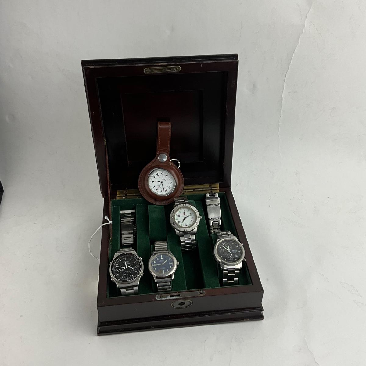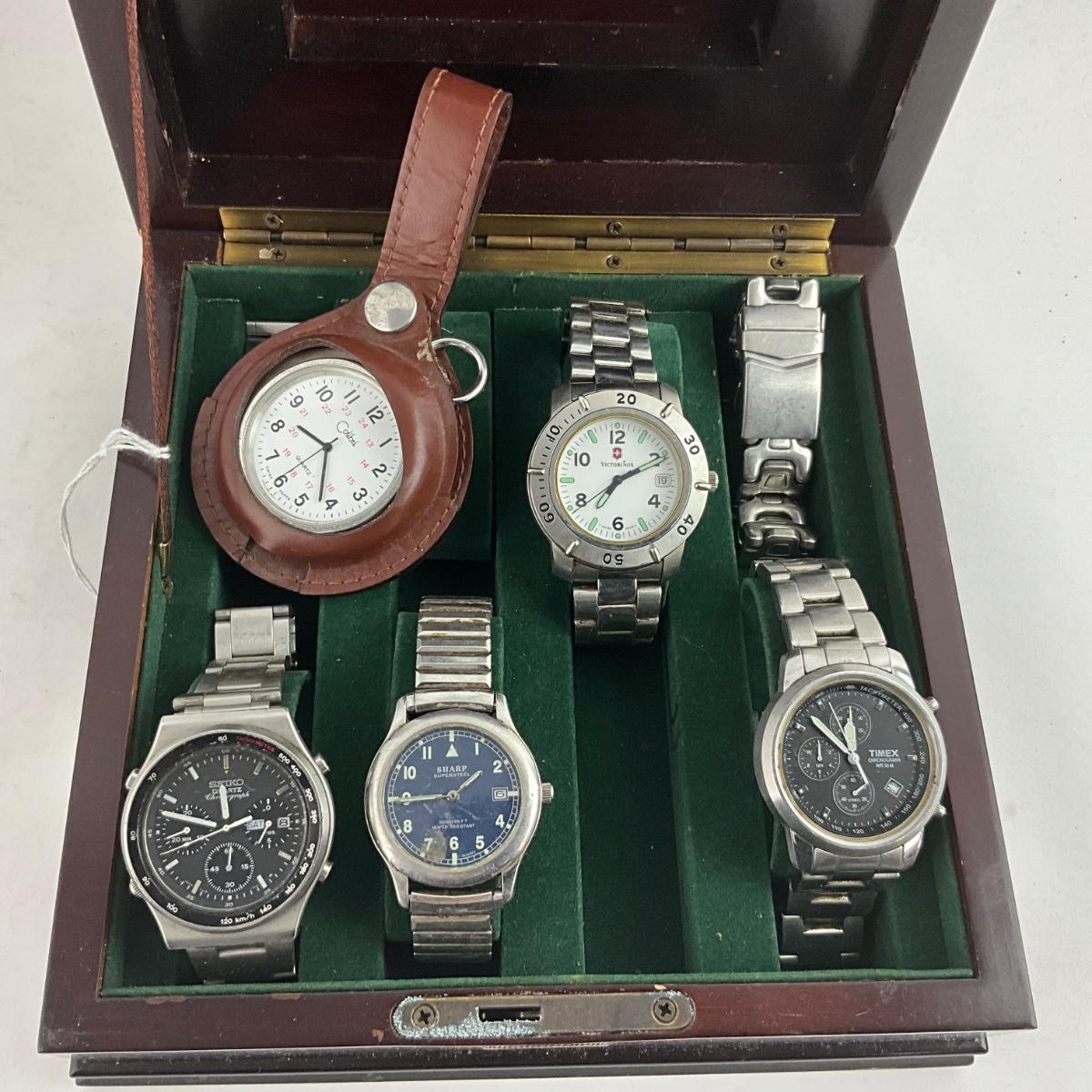 Watches included are Victorinox, Seiko, Sharp, Timex, Colibri. The box is 8" x 8" x 3".