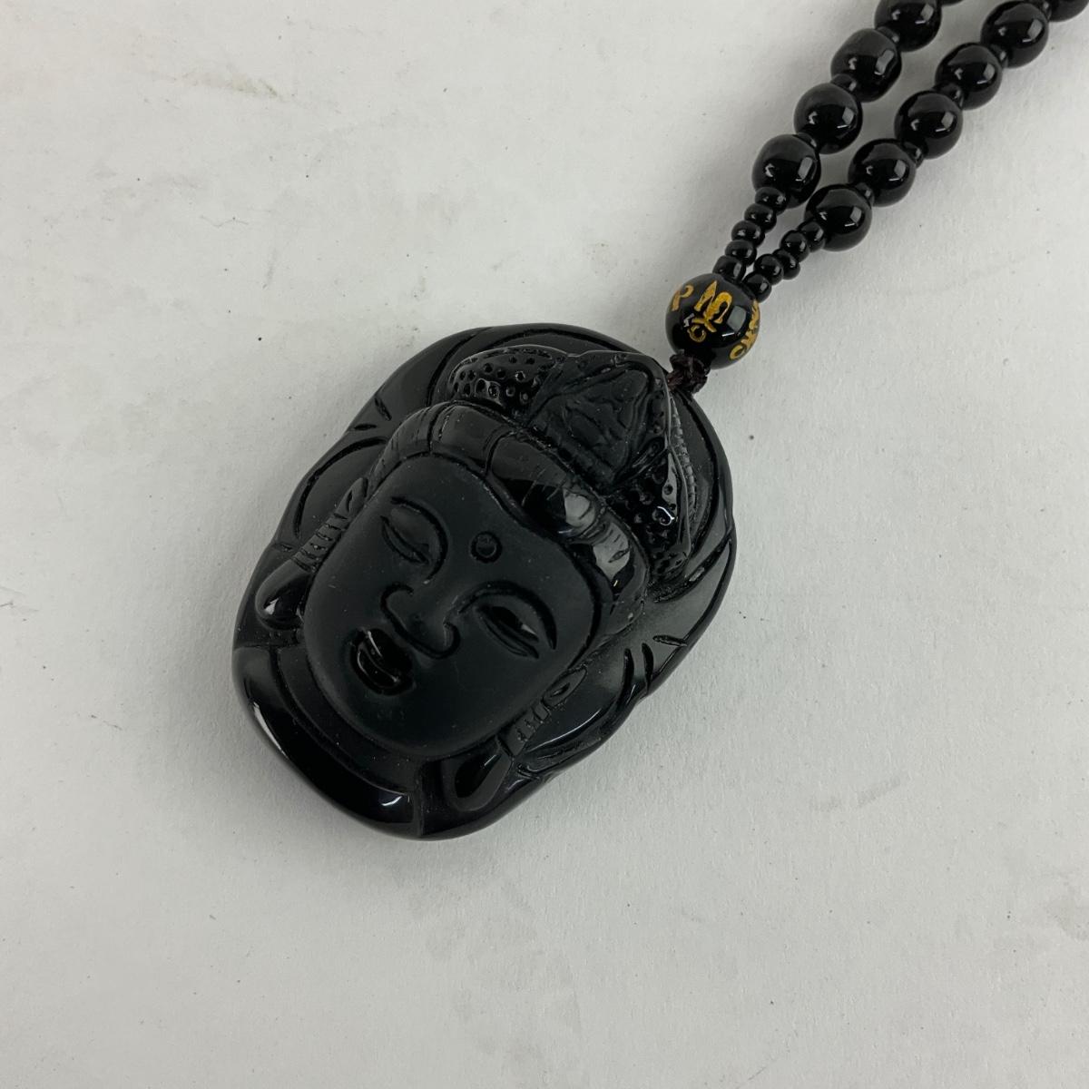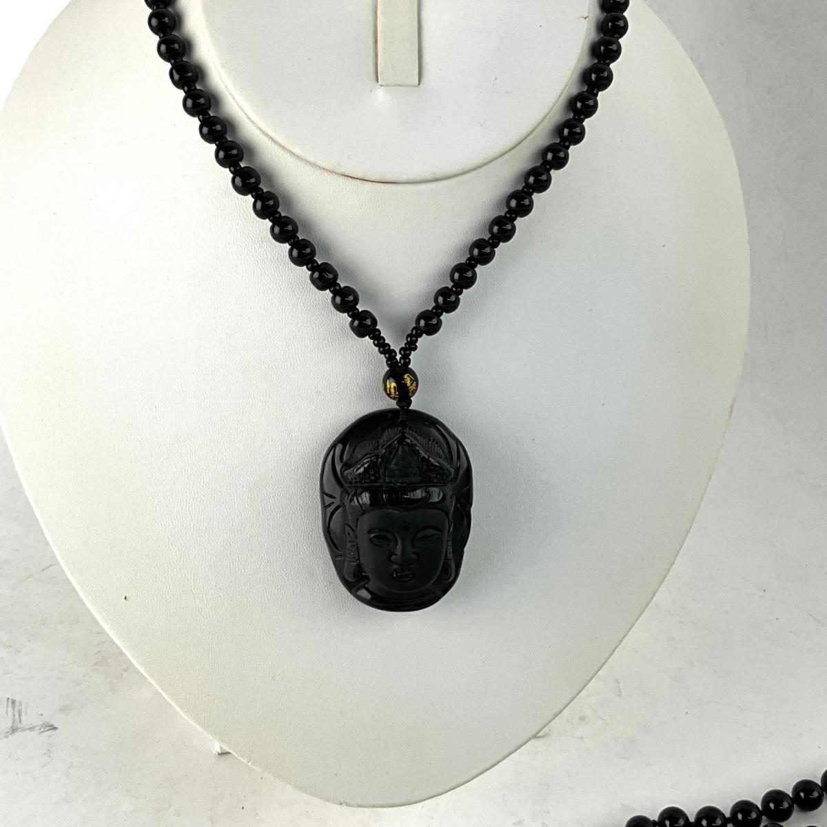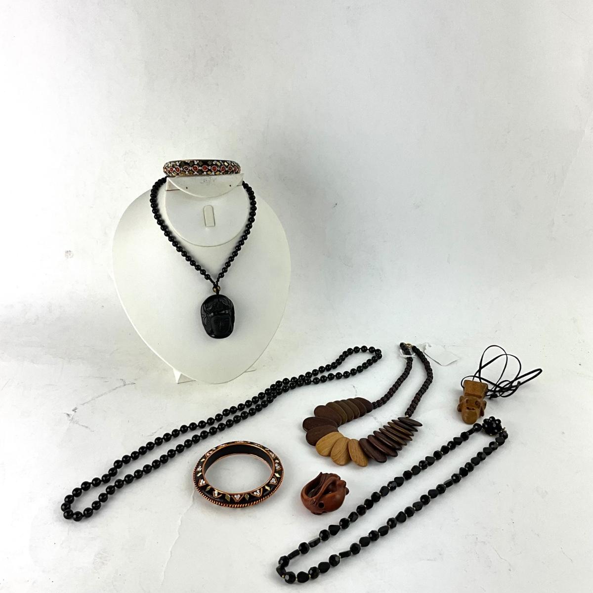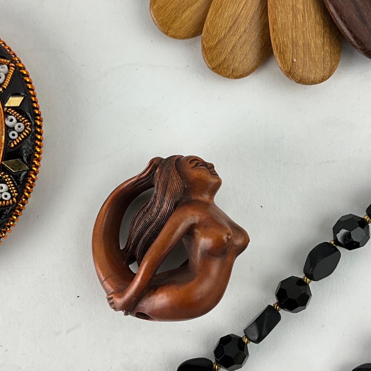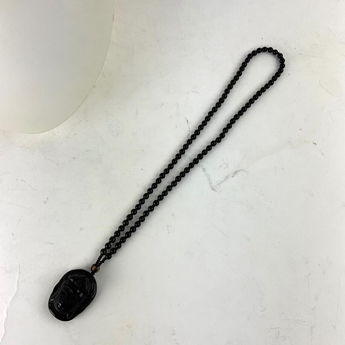 Black Onyx face necklace with netsuke, bracelets with black glass beads, carved mermaid and more.