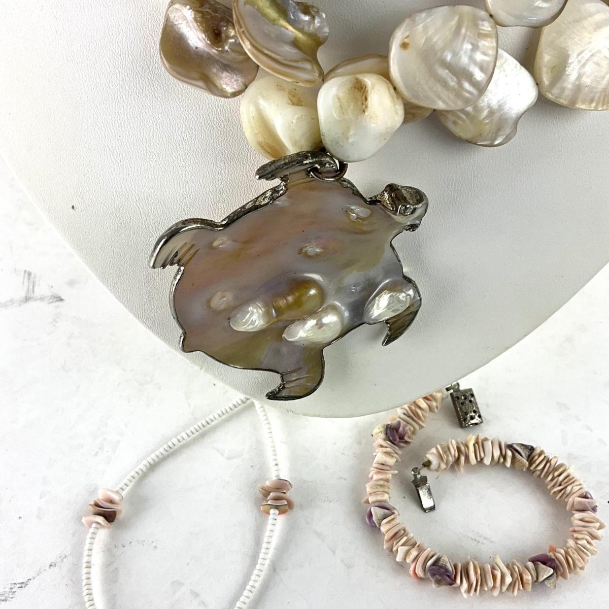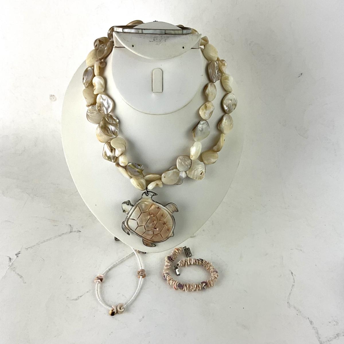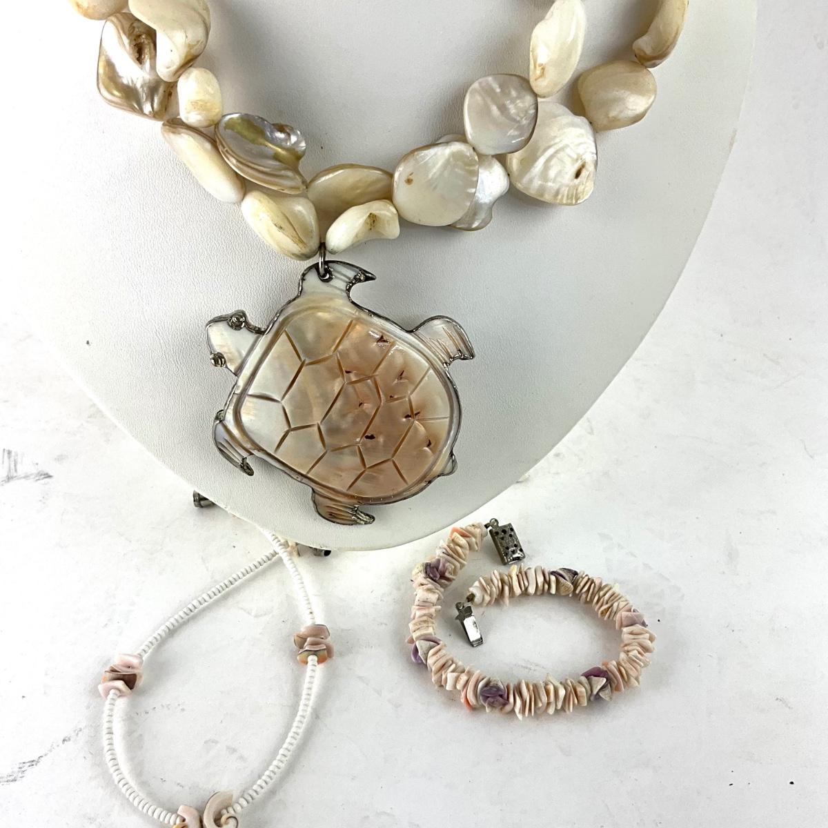 Necklace is 16", assorted shell bracelets and abalone turtle necklace.