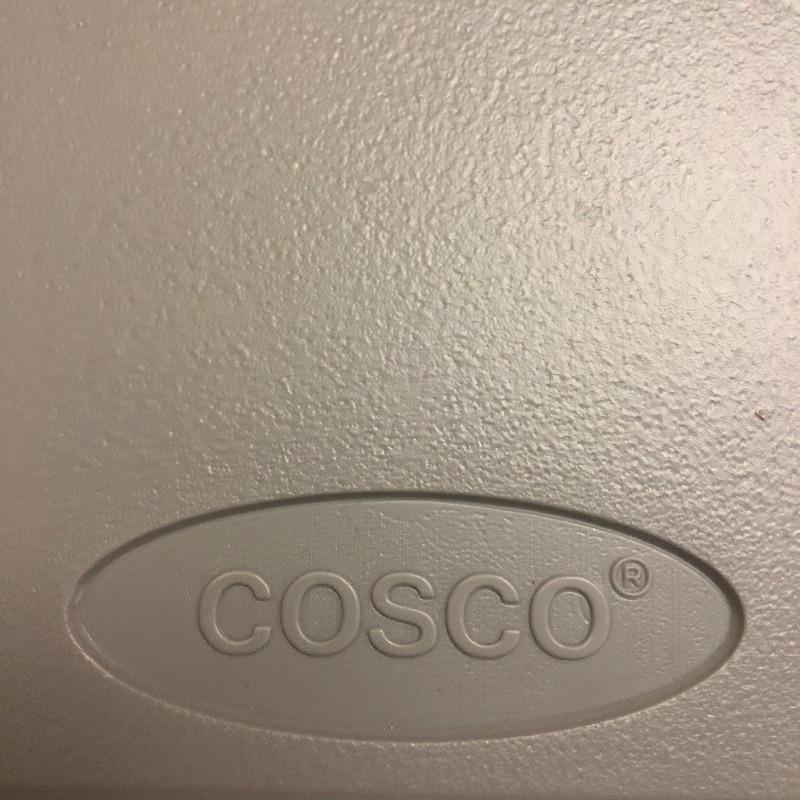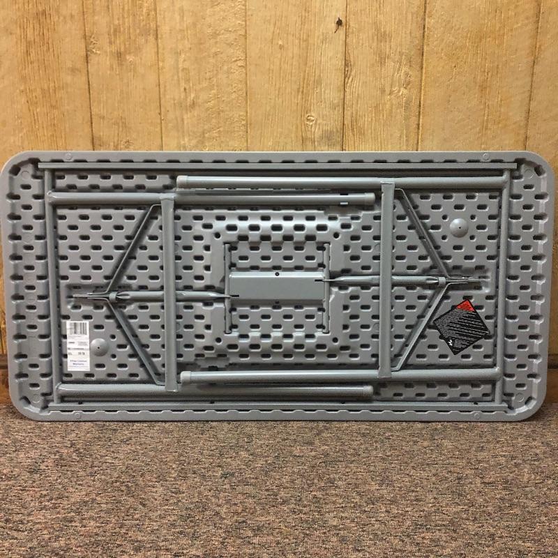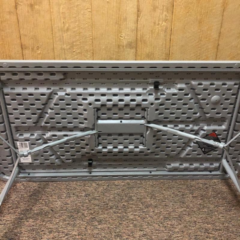 Grey Cosco table measuring 48”x24”x29”. All folding parts are in working order. The stool is sturdy and in good shape.
