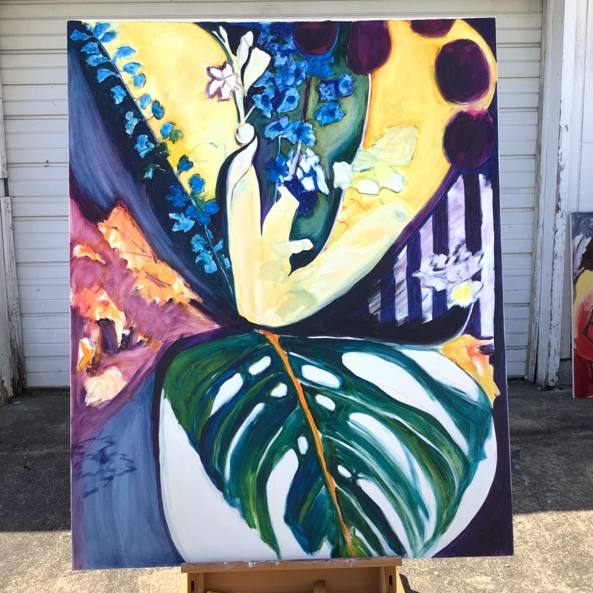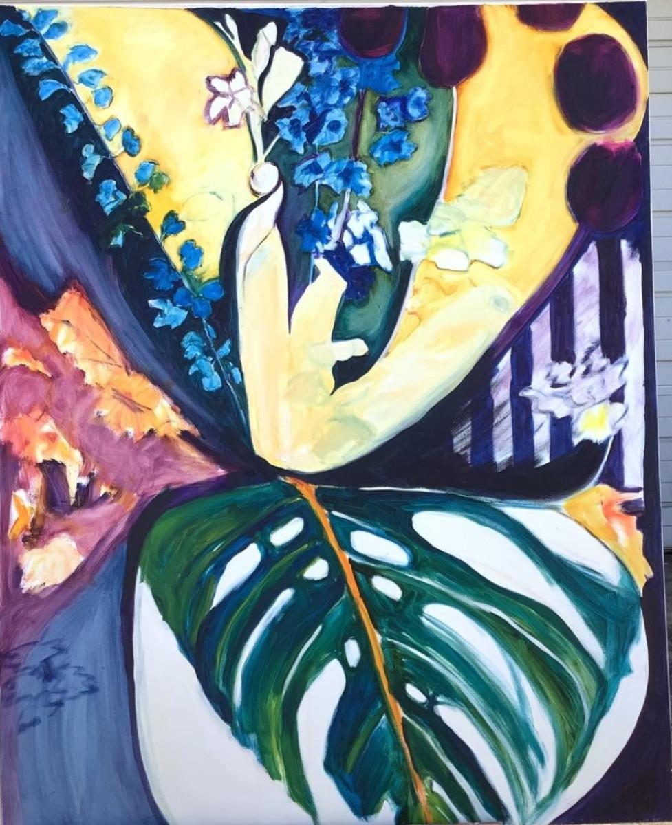 141 Monsterra Leaf with Flowers Oil on Canvas by Ellen Into