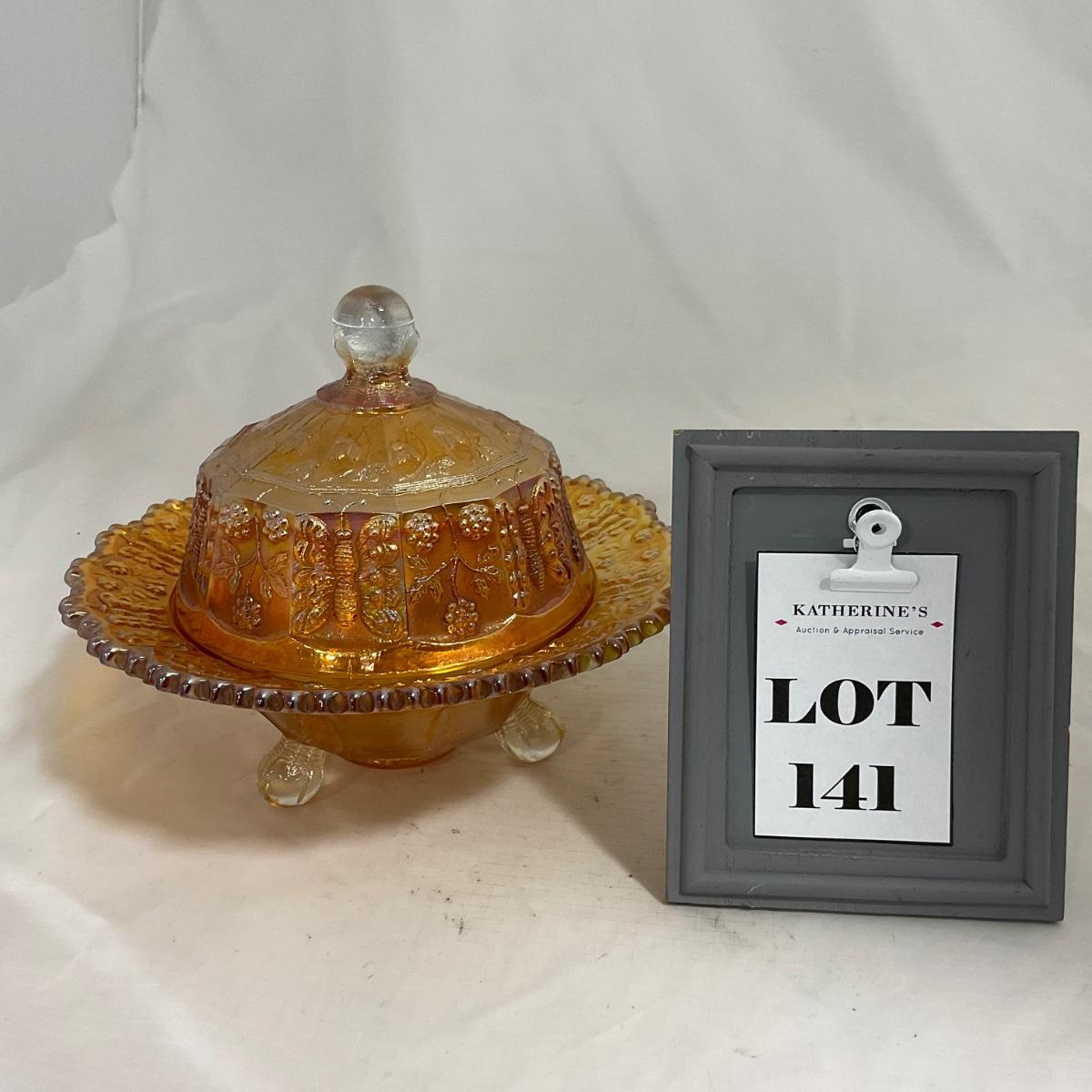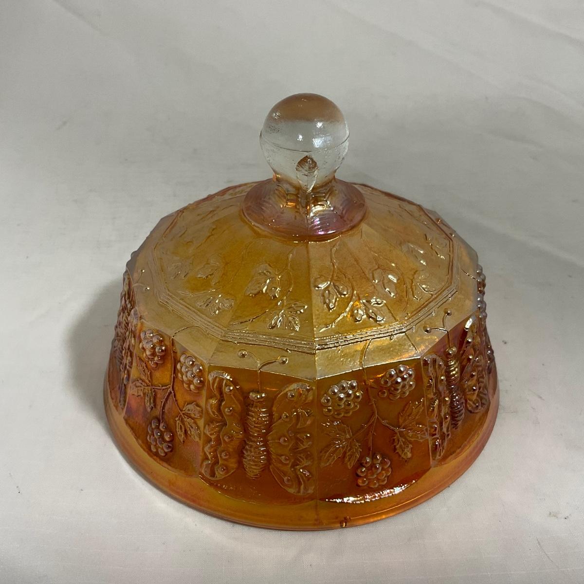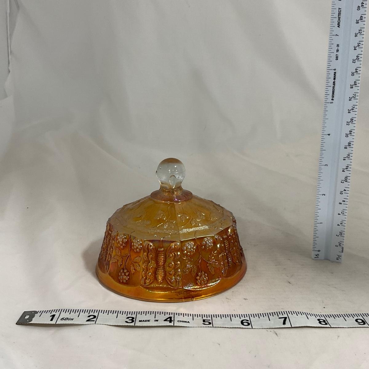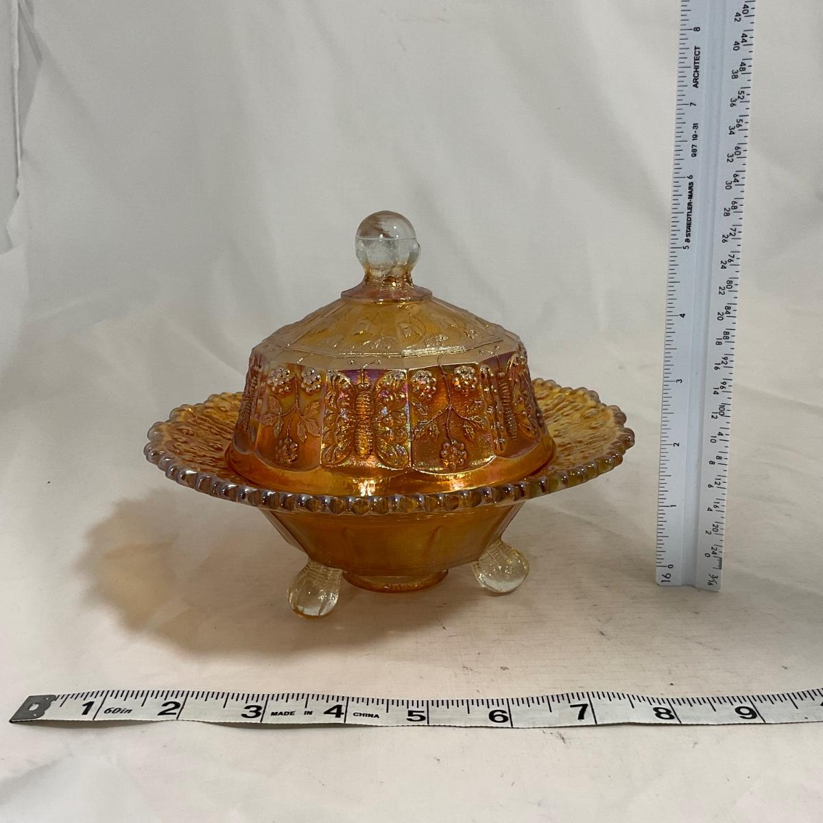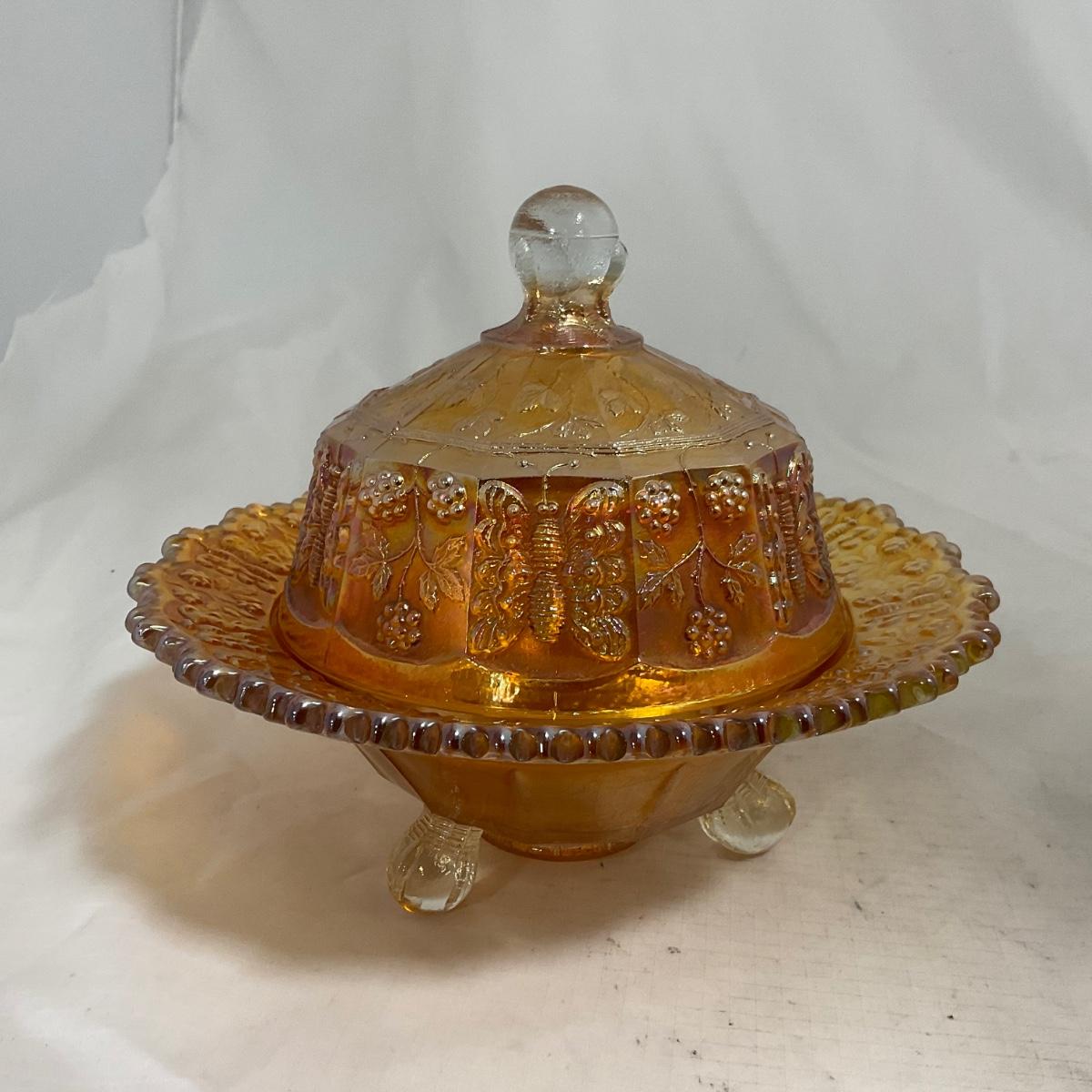 One tall orange carnival butterfly design covered butter dish. In amazing shape who doesn’t want a butterfly Butter dish! Please see photos for details and condition. ::: Shipping is available on this lot. If you require shipping you must let us know at the close of the auction. We will coordinate with you after the item has been won. Shipping fees will include insurance up to or exceeding the value of all items being mailed. If you have any questions regarding this lot please contact the auctioneer either via this website, by direct email or by phone. PICK UP TIMES and other important information can be found in the TERMS and DESCRIPTION of the auction. Please take a look for pertinent information. Thanks!