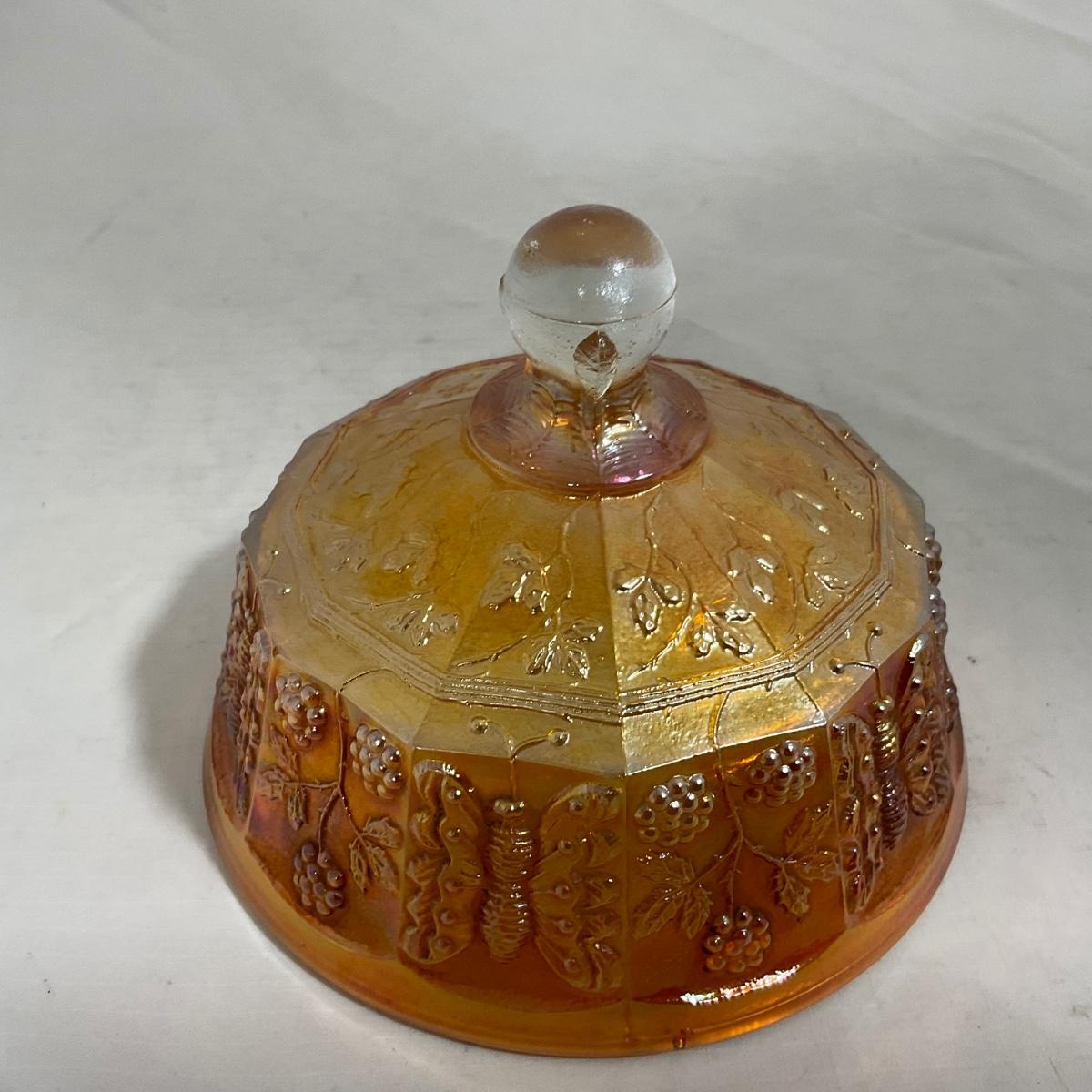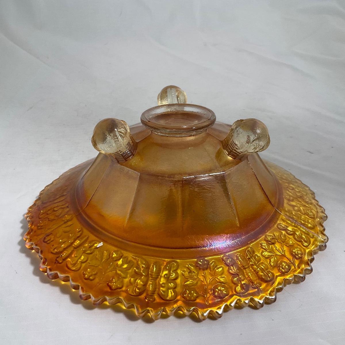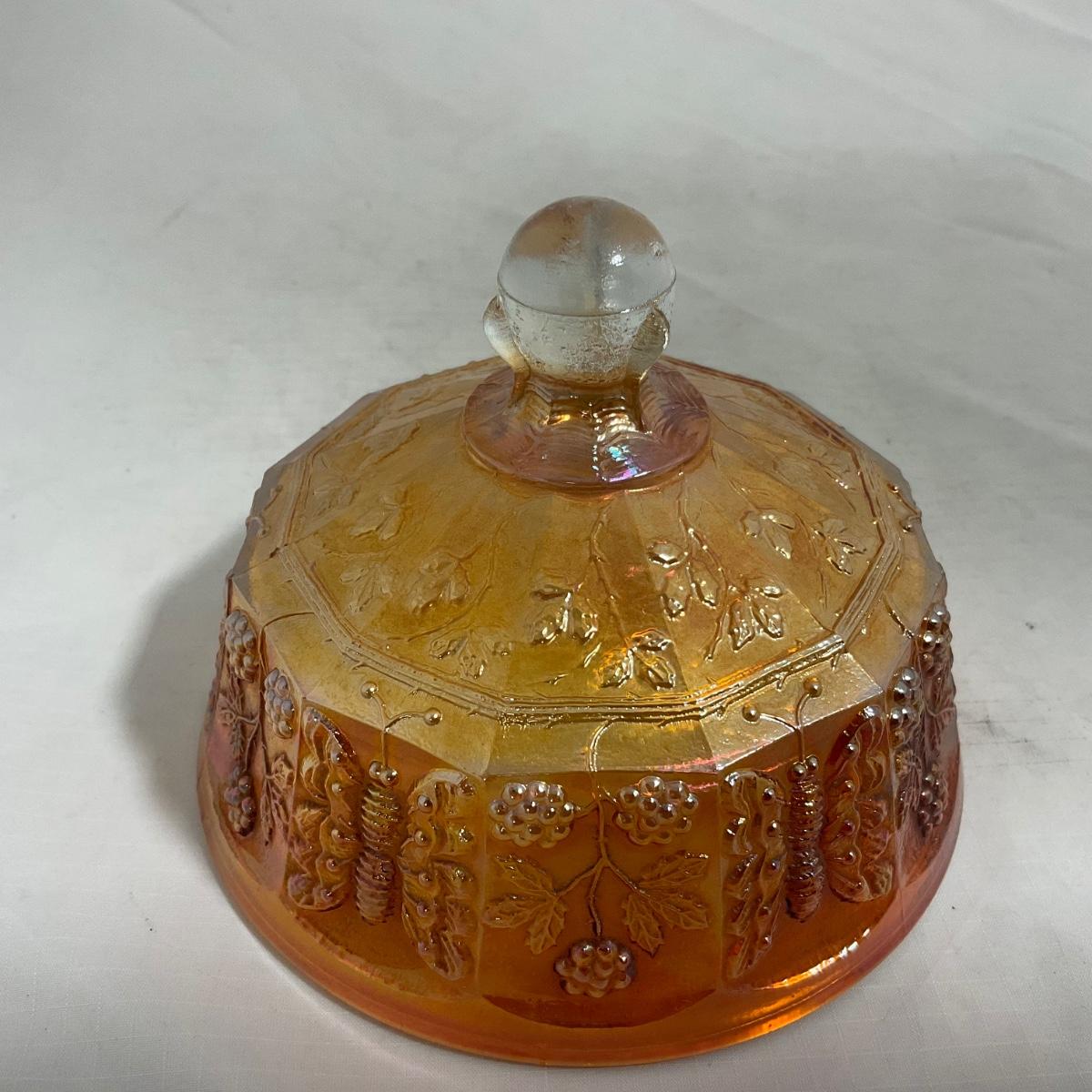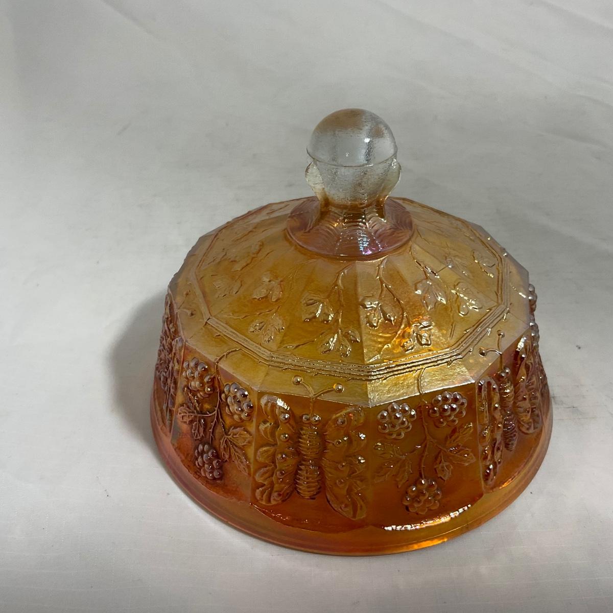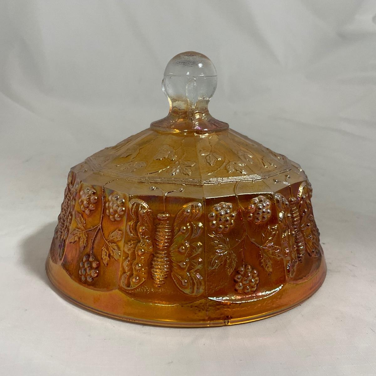 One tall orange carnival butterfly design covered butter dish. In amazing shape who doesn’t want a butterfly Butter dish! Please see photos for details and condition. ::: Shipping is available on this lot. If you require shipping you must let us know at the close of the auction. We will coordinate with you after the item has been won. Shipping fees will include insurance up to or exceeding the value of all items being mailed. If you have any questions regarding this lot please contact the auctioneer either via this website, by direct email or by phone. PICK UP TIMES and other important information can be found in the TERMS and DESCRIPTION of the auction. Please take a look for pertinent information. Thanks!