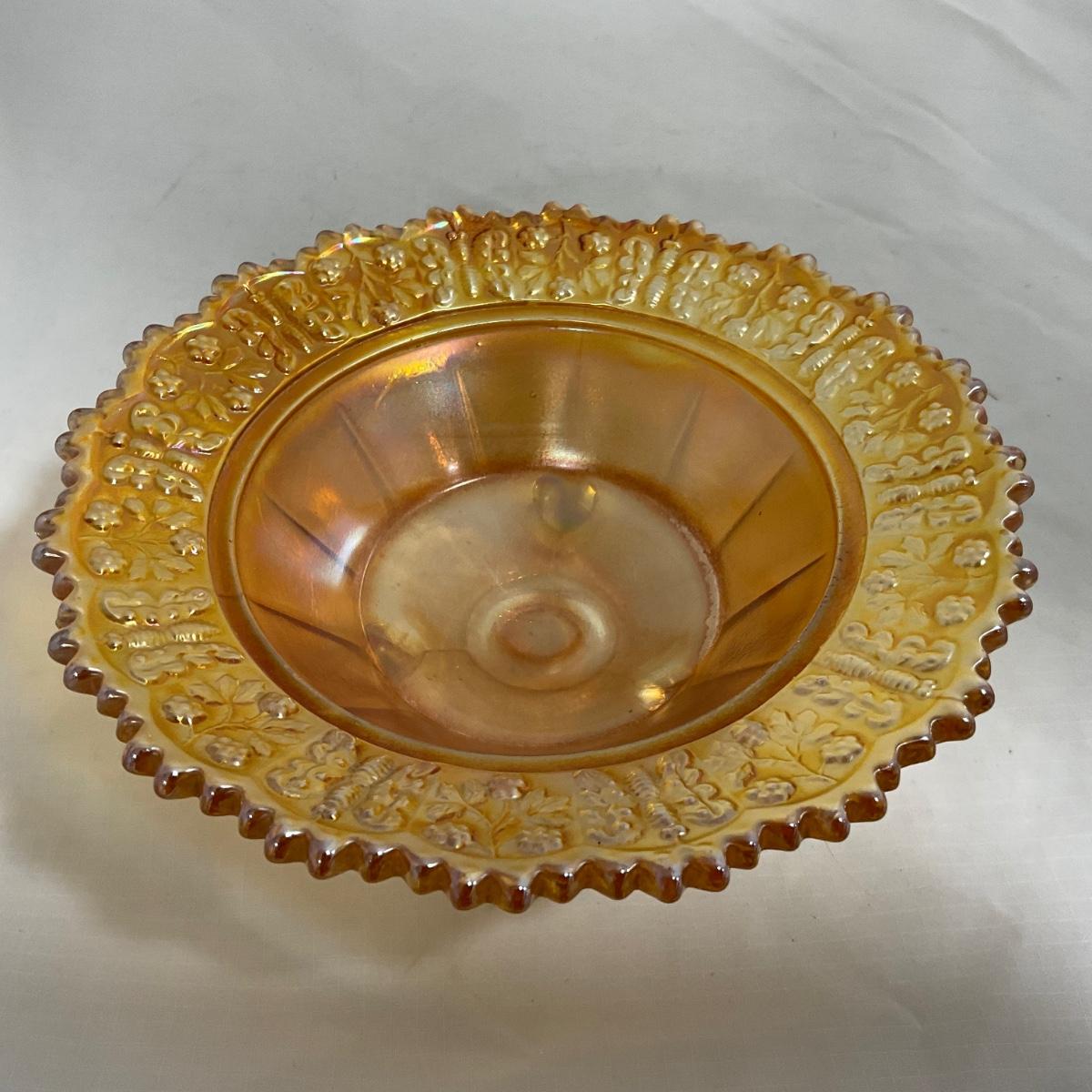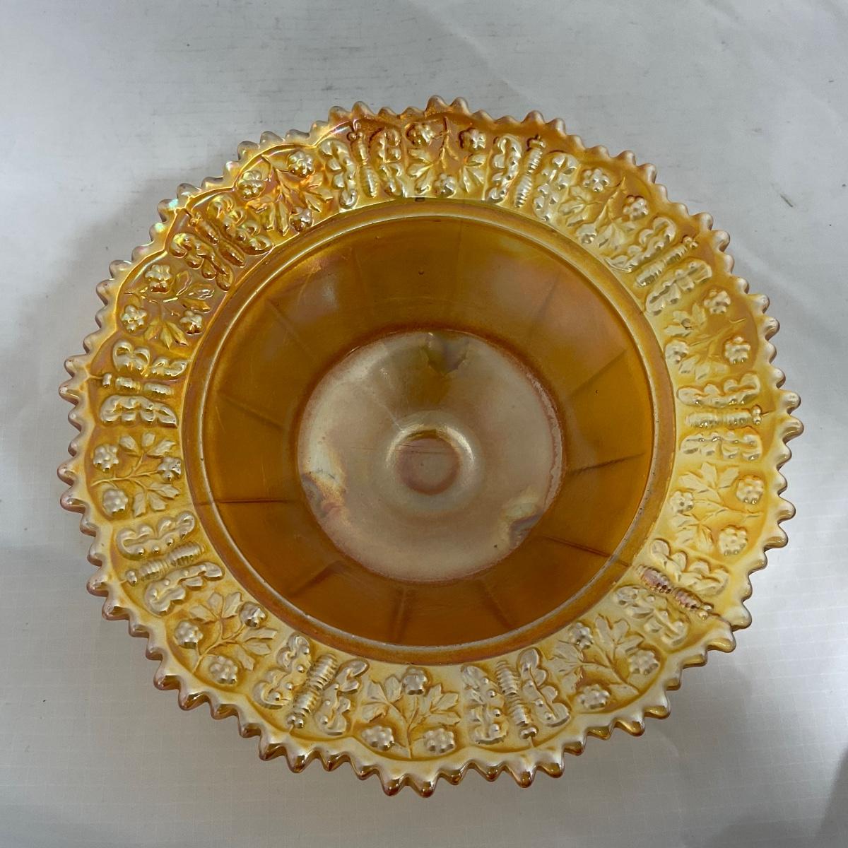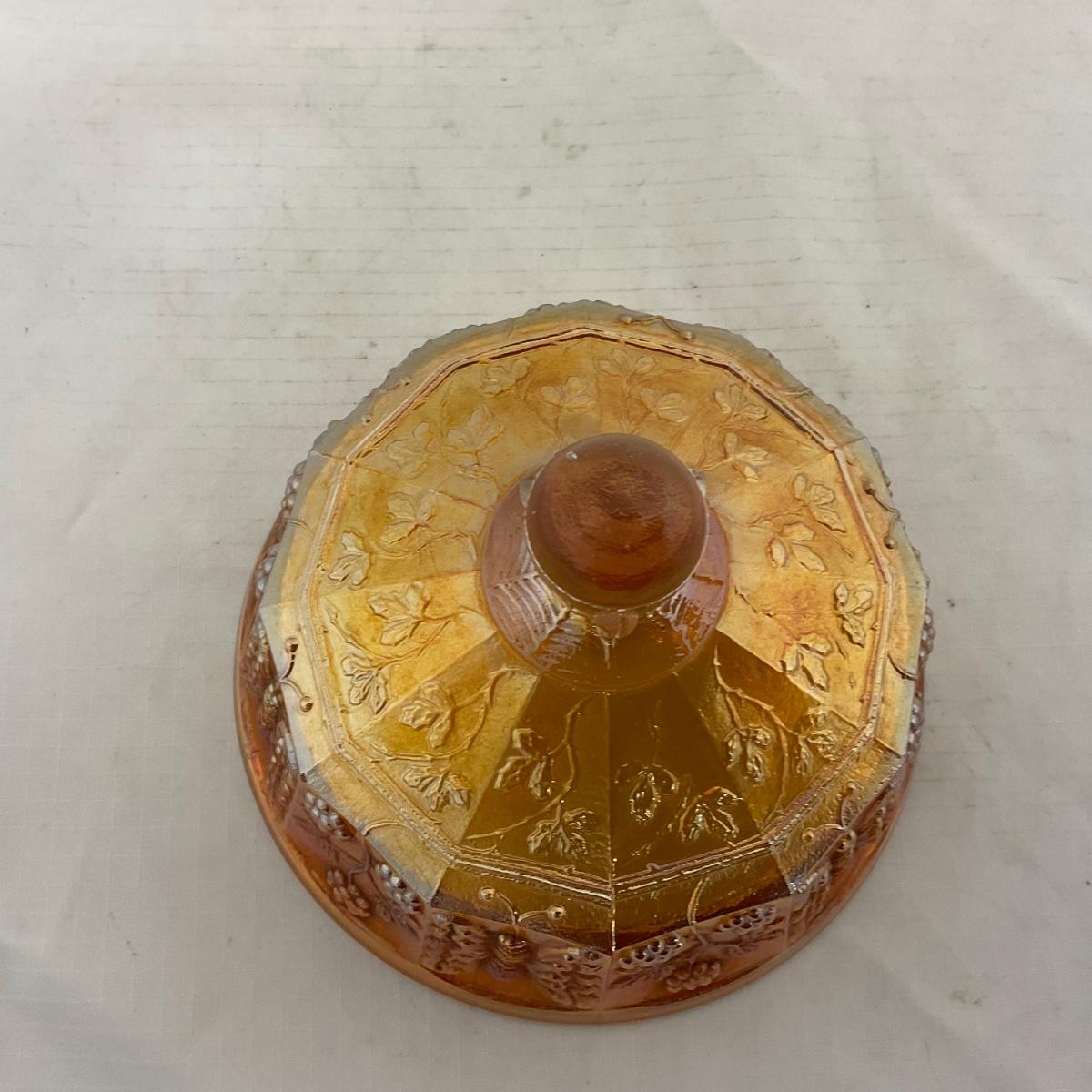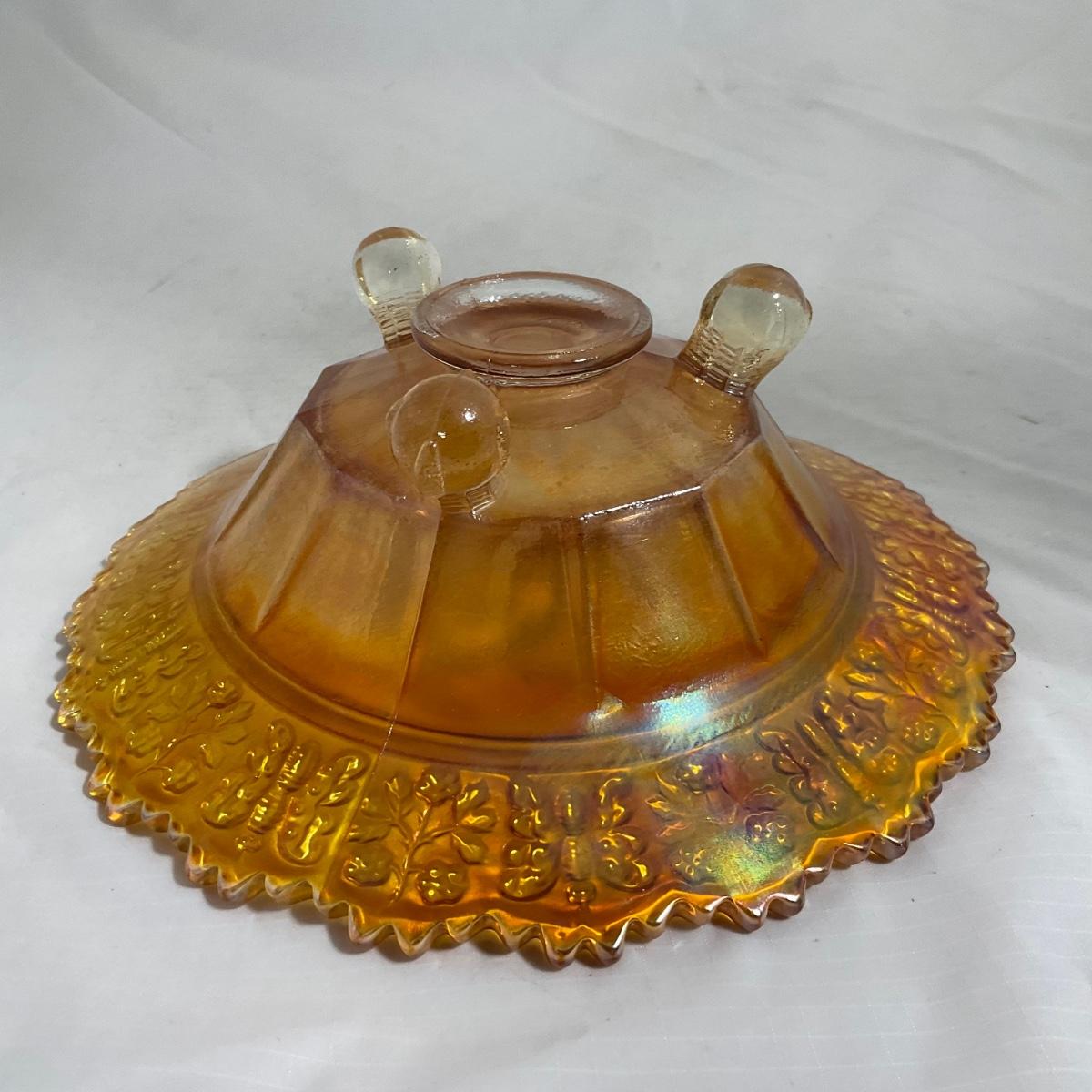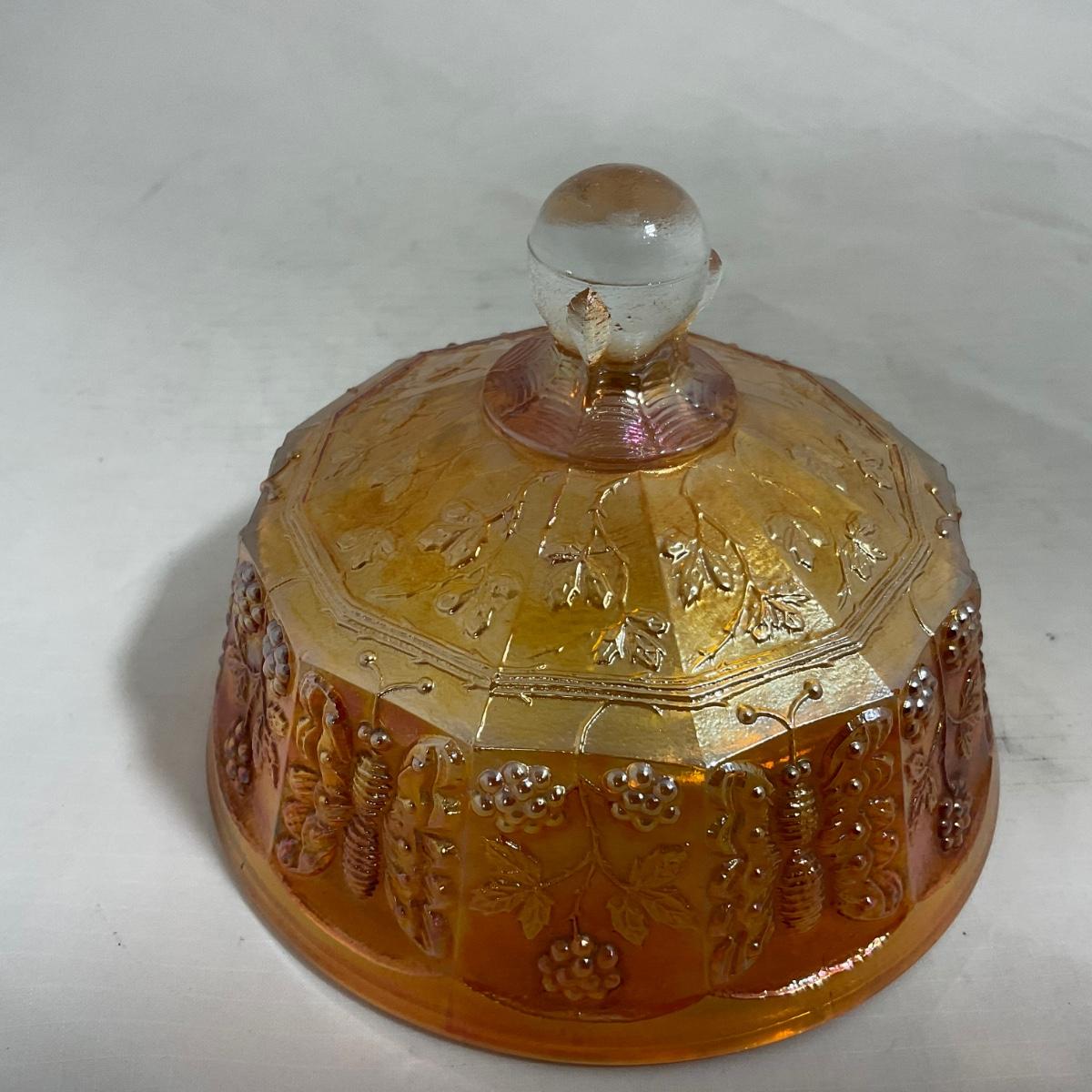 One tall orange carnival butterfly design covered butter dish. In amazing shape who doesn’t want a butterfly Butter dish! Please see photos for details and condition. ::: Shipping is available on this lot. If you require shipping you must let us know at the close of the auction. We will coordinate with you after the item has been won. Shipping fees will include insurance up to or exceeding the value of all items being mailed. If you have any questions regarding this lot please contact the auctioneer either via this website, by direct email or by phone. PICK UP TIMES and other important information can be found in the TERMS and DESCRIPTION of the auction. Please take a look for pertinent information. Thanks!