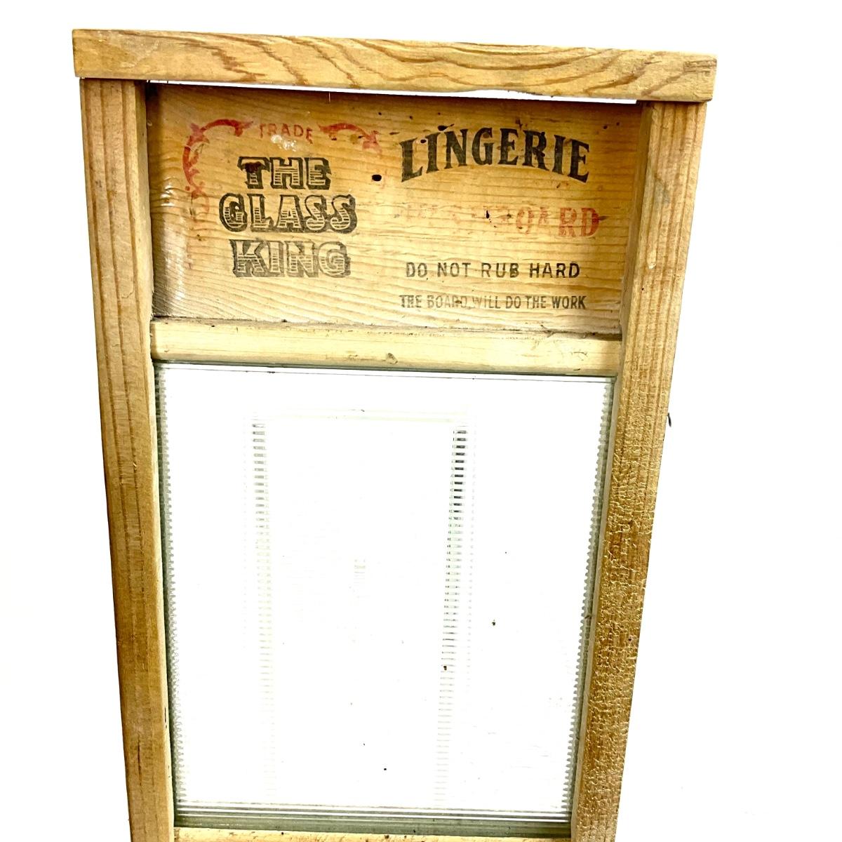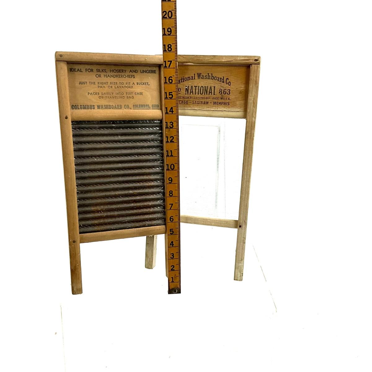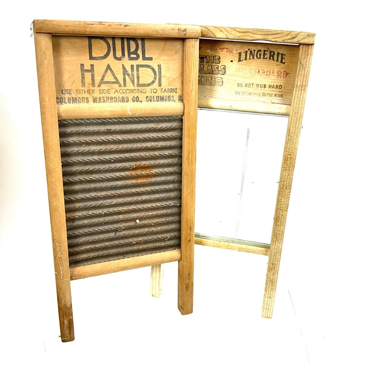 The glass washboard has the glass king lingerie and the tin board is a dubl handi by the columbus washboard co. Both boards measure 8.5" w x 18" h